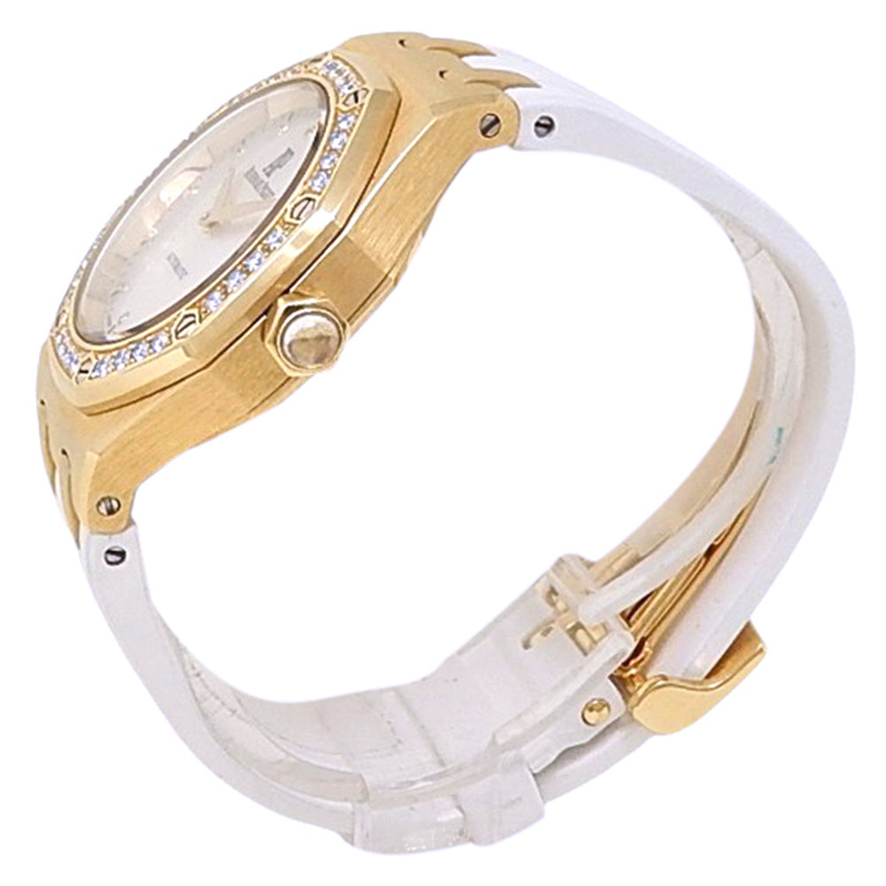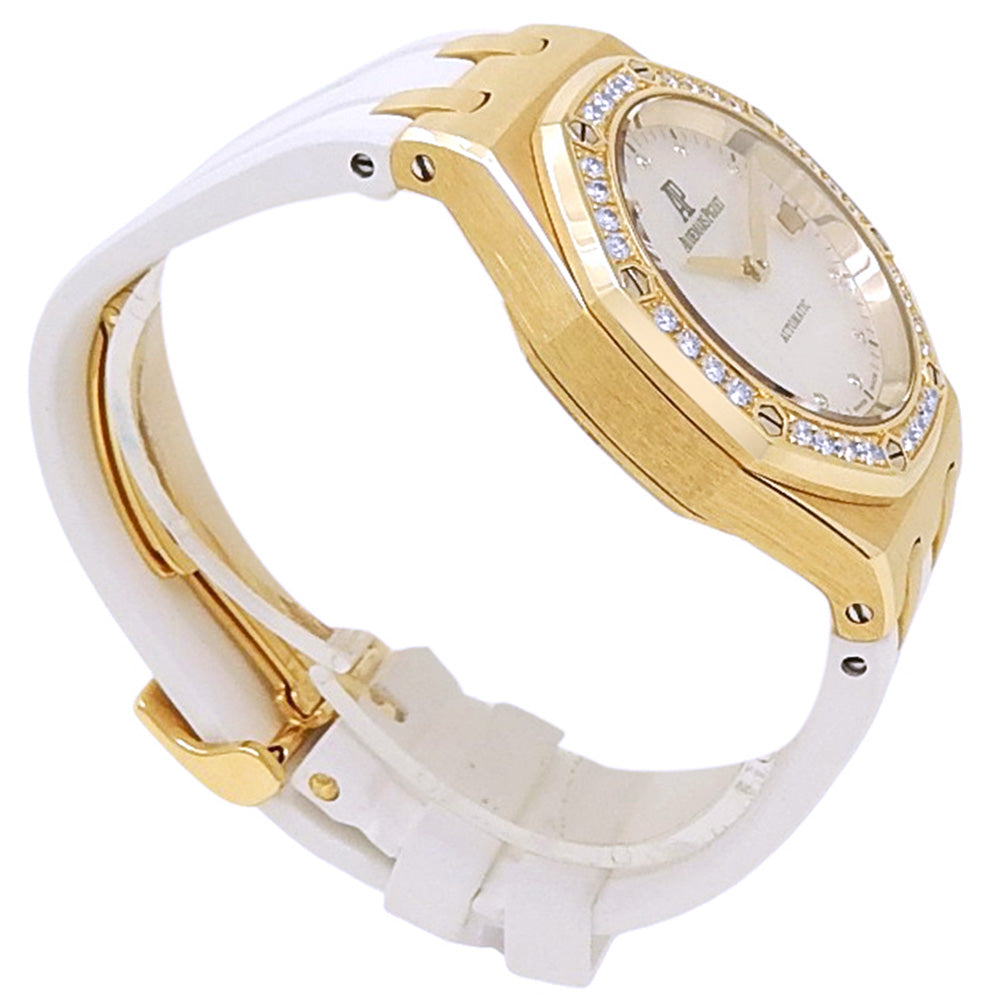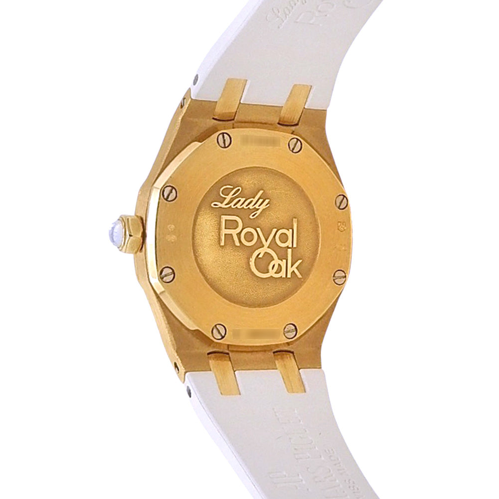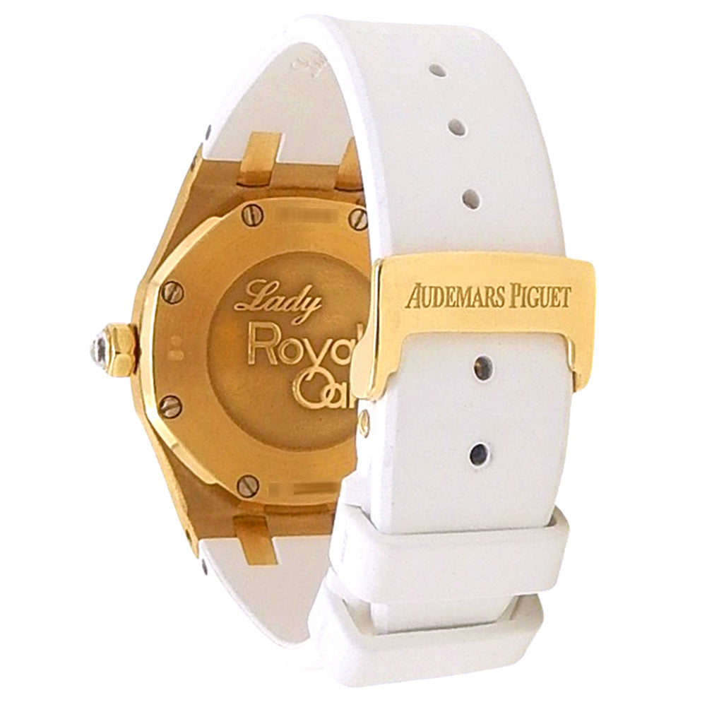Pre-Owned Watch. Audemars Piguet Lady Royal Oak ladies watch with 18k Yellow Gold case and White Rubber strap. Watch has a mother of pearl dial with date feature, diamond markings and diamonds bezel. Watch runs on automatic movement. Watch has signs of wear (hairline scratches). Watch does come with archive paper.