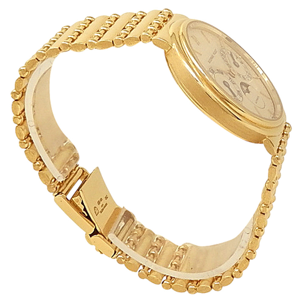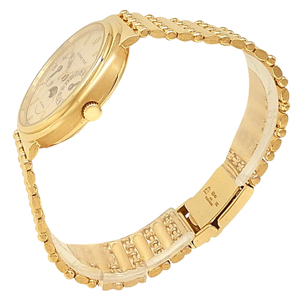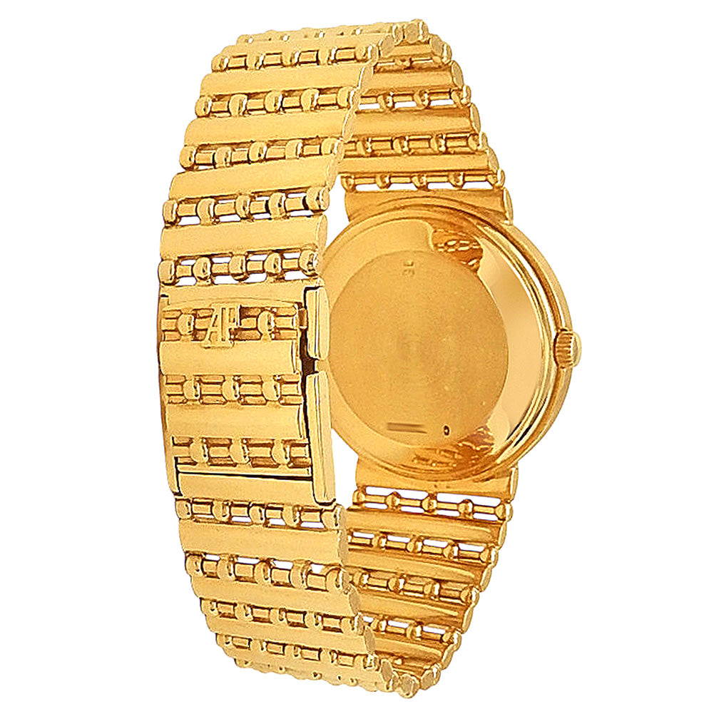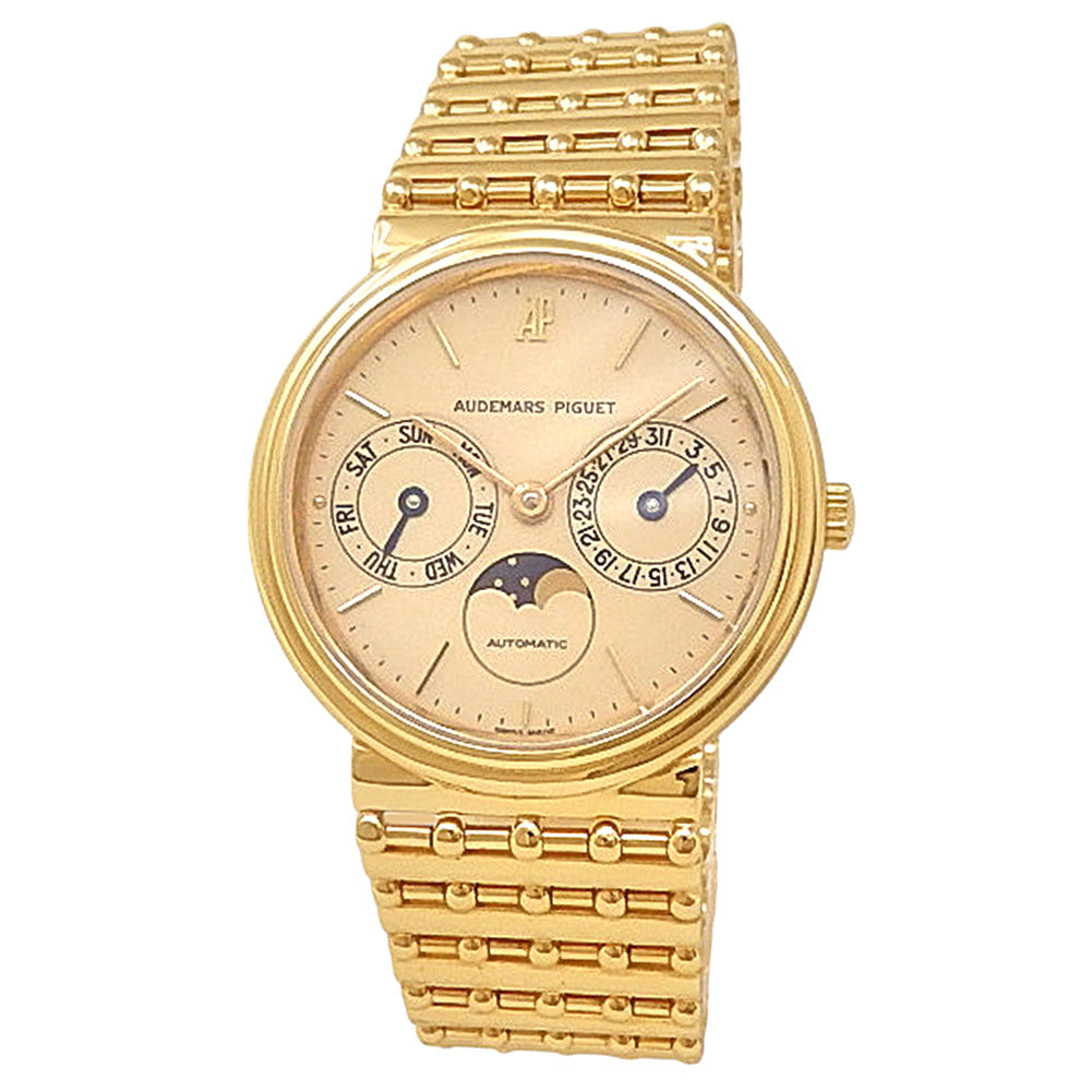 Pre-Owned Watch. Audemars Piguet Moonphase men’s watch with 18k Yellow Gold case and bracelet. Watch has a champagne dial with date, day and moon phase features. Watch runs on automatic movement. Watch can fit up to a size 6½ inch wrist. Watch has signs of wear (hairline scratches). Watch does come with service papers.