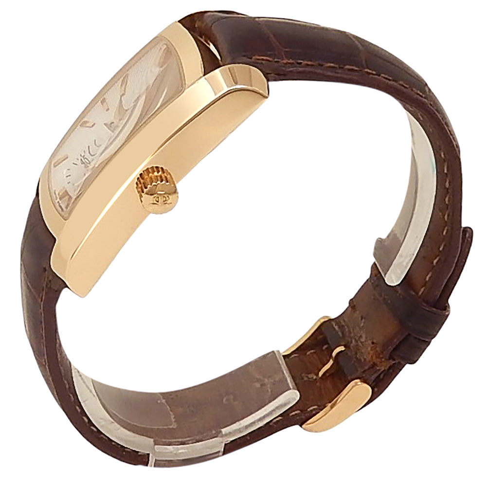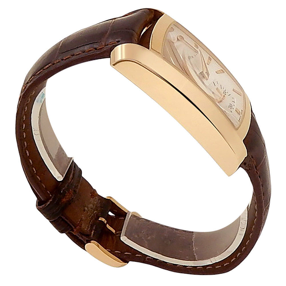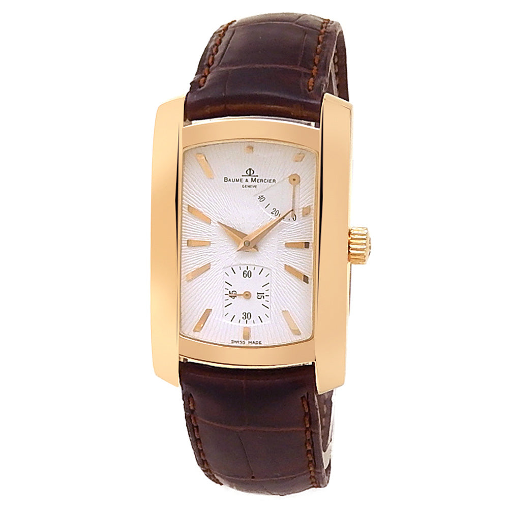 Pre-Owned Watch. Baume & Mercier Hampton men’s watch with 18k Rose Gold case and Brown Leather strap. Watch has a silver dial with power reserve feature and small second subdial. Watch runs on manual movement. Watch has signs of wear (hairline scratches).