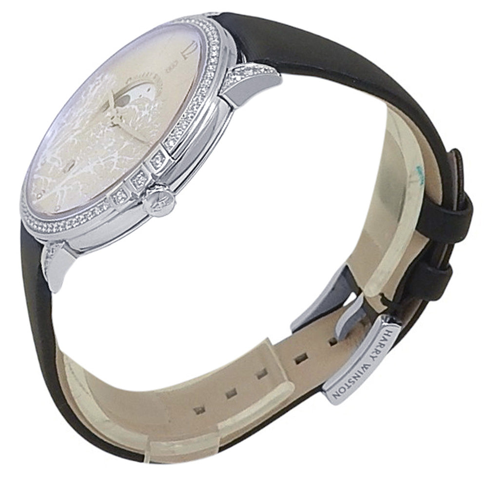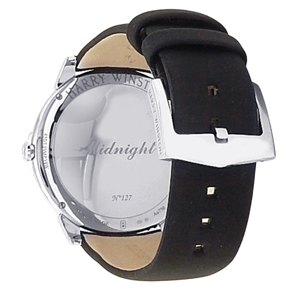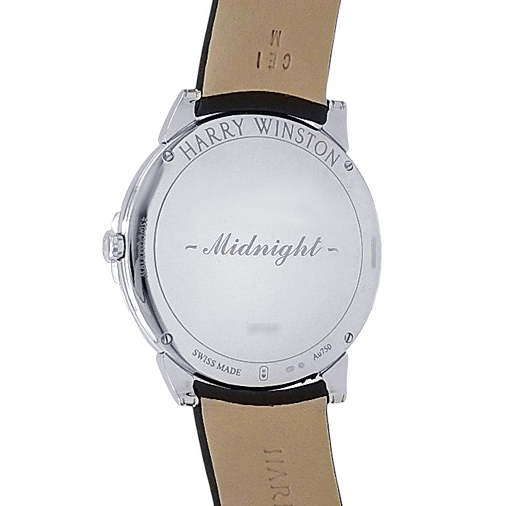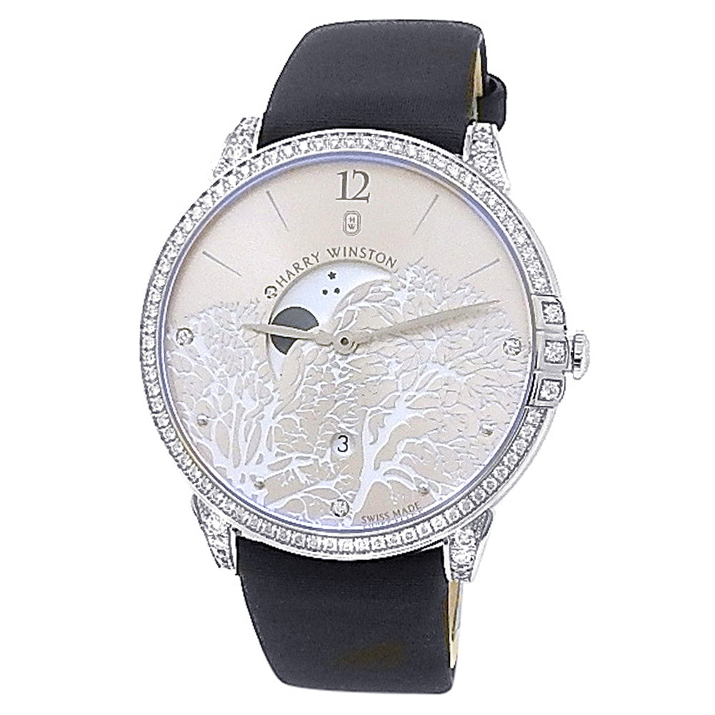 Pre-Owned Watch. Harry Winston Midnight Moon Phase men’s watch with 18k White Gold case and Grey Satin Leather strap. Watch has a silver sunray dial with date, moon phase features, diamond markings, diamonds bezel and diamond lugs. Watch runs on quartz movement. Watch has signs of wear (hairline scratches). Watch does come with box and papers.