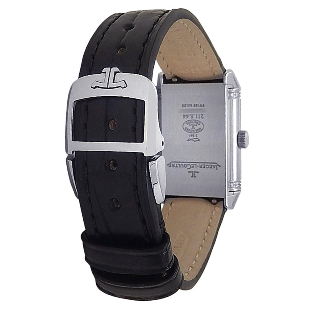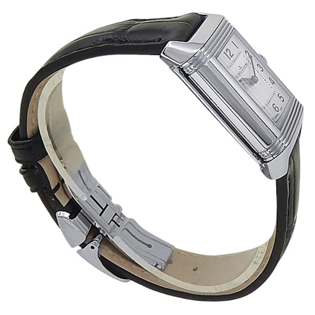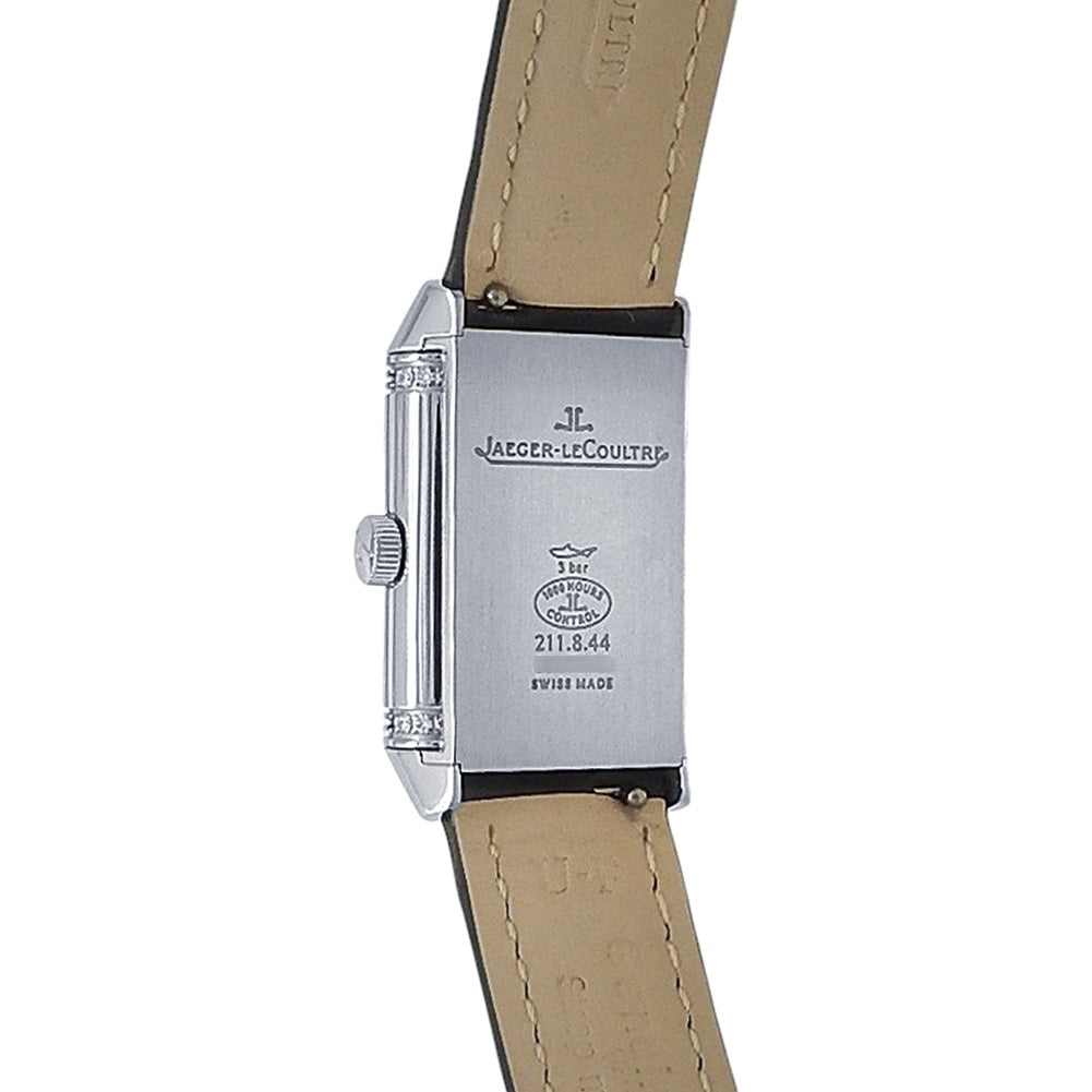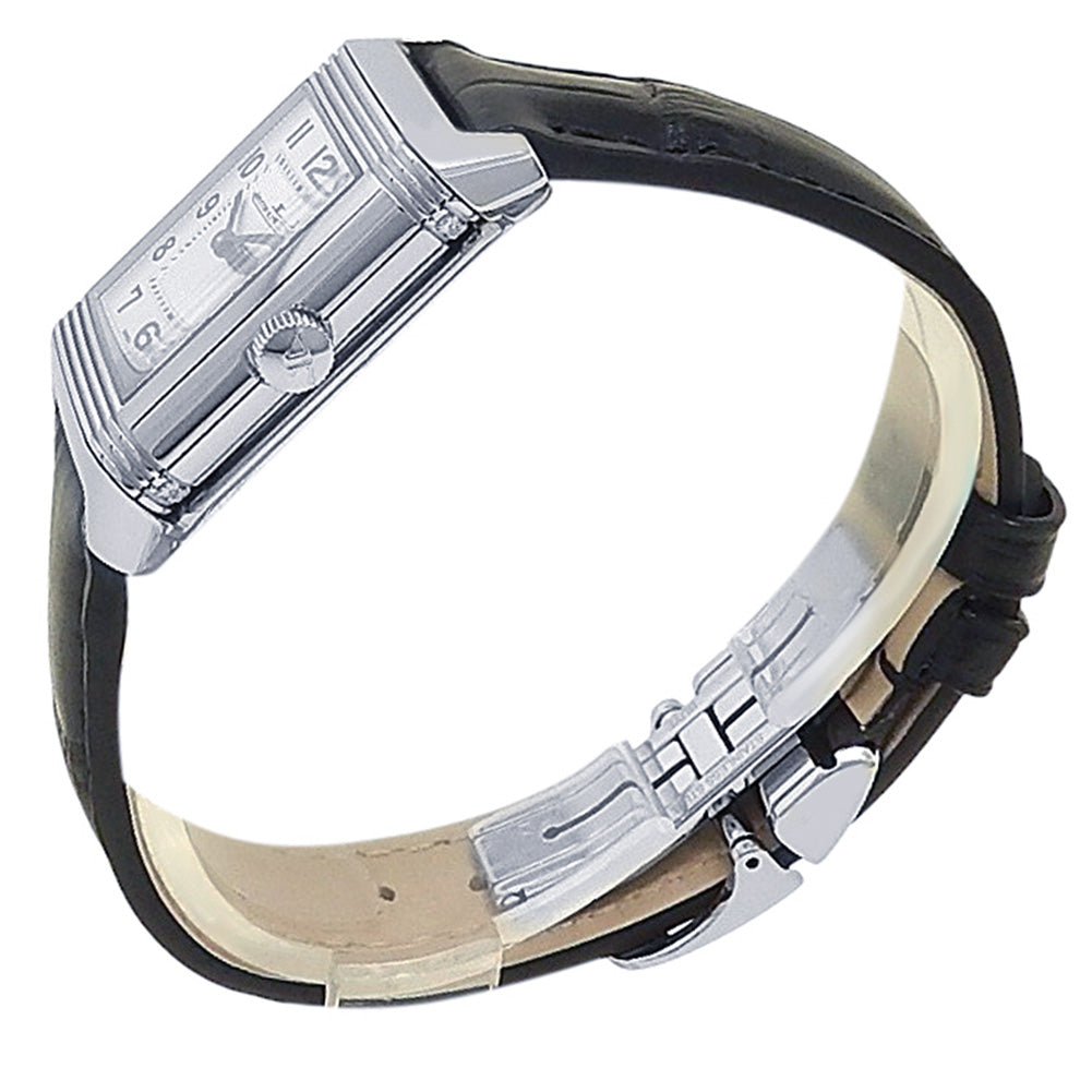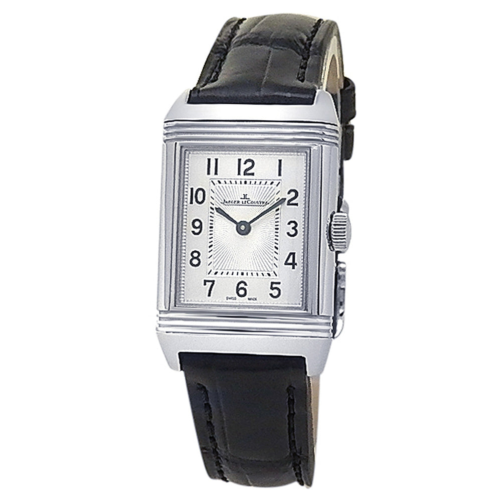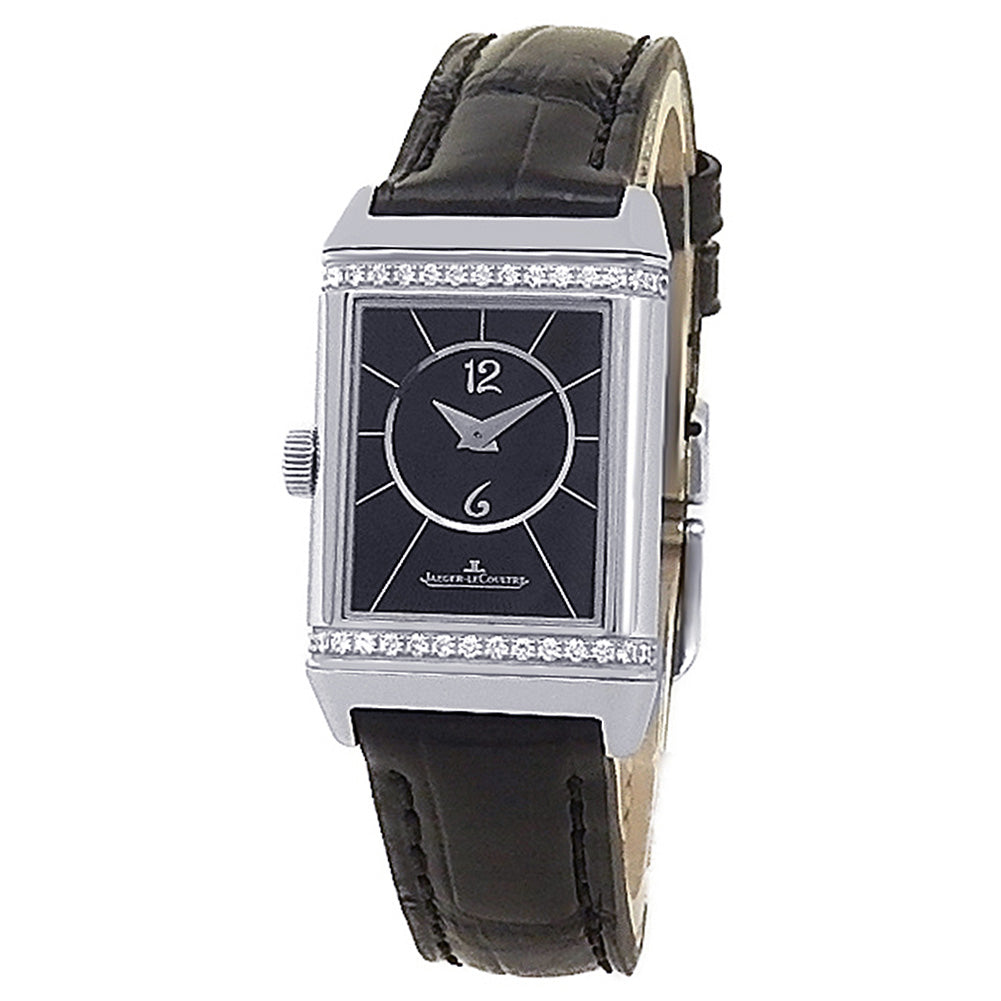 Pre-Owned Watch. Jaeger-LeCoultre Reverso Classic Duetto ladies watch with Stainless Steel case and Black Leather strap. Watch has a reverse silver & black dial with diamonds bezel. Watch runs on manual movement. Watch has signs of wear (hairline scratches). Watch does come with papers.
