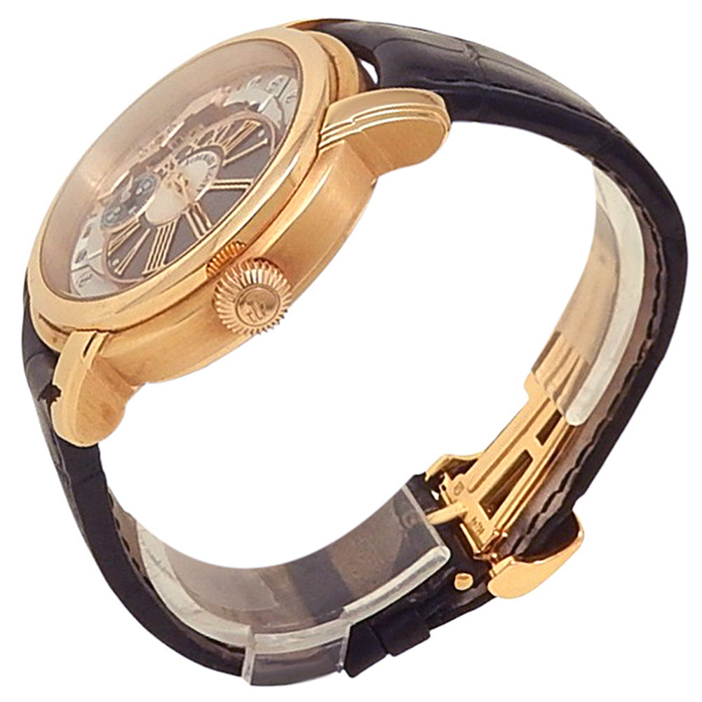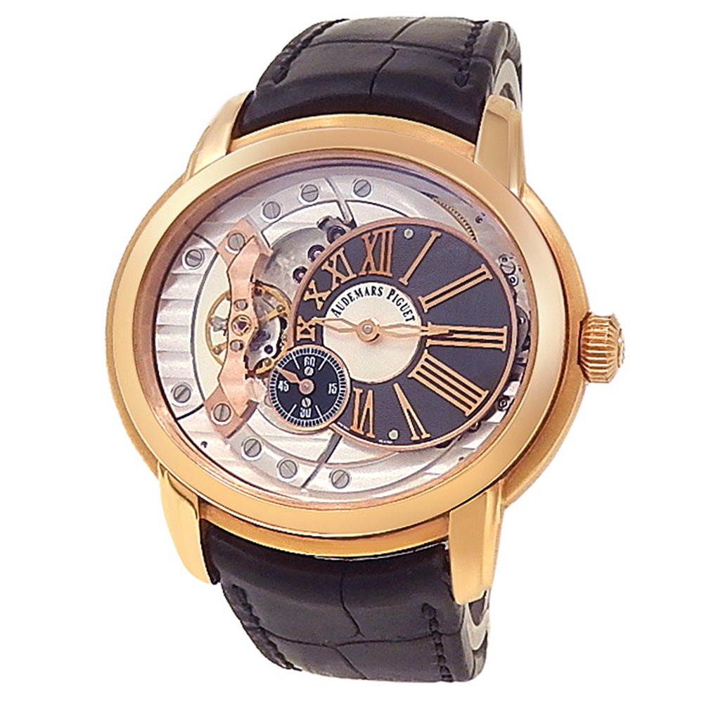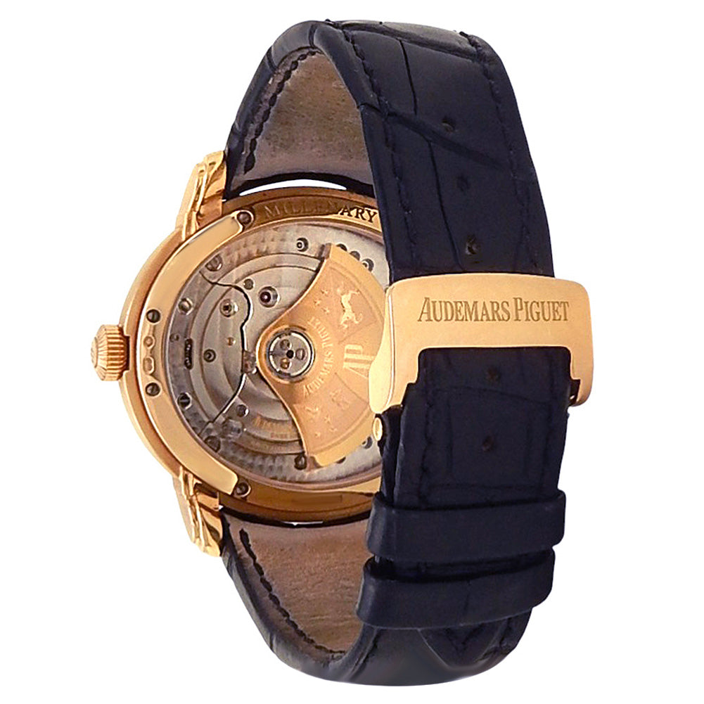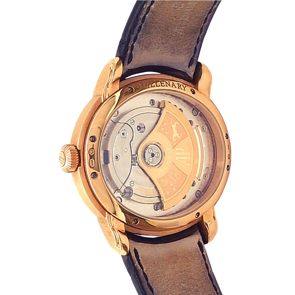 Pre-Owned Watch. Audemars Piguet Millenary men’s watch with 18k Rose Gold case and Black Leather strap. Watch has a anthracite dial with a small seconds subdial. Watch runs on automatic movement. Watch has signs of wear (hairline scratches).