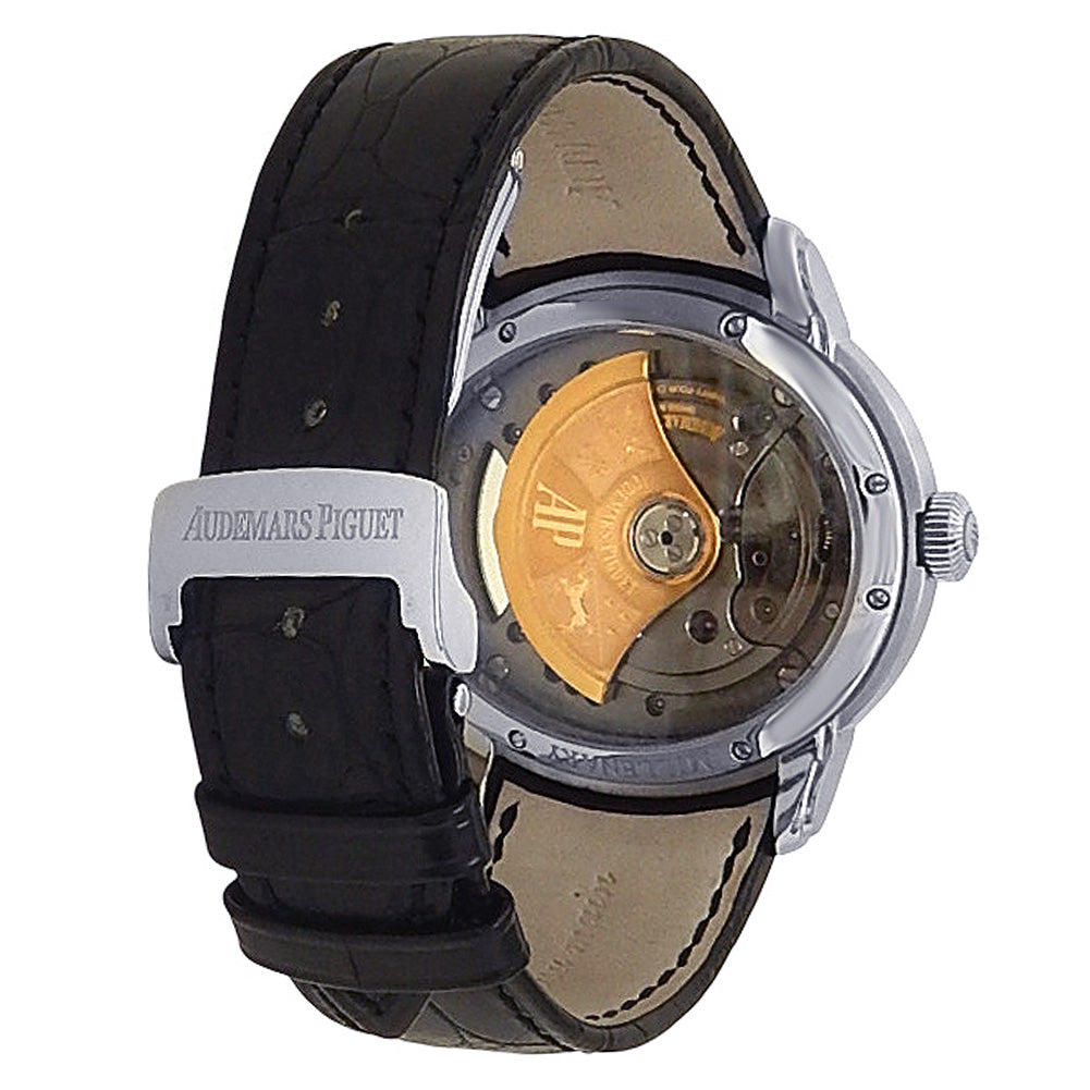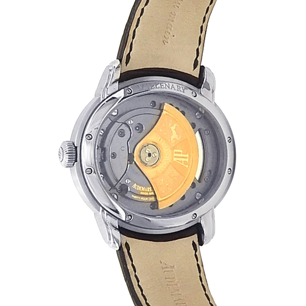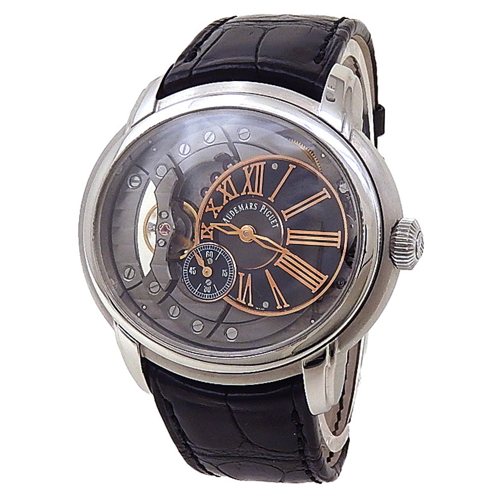 Pre-Owned Watch. Audemars Piguet Millenary men's watch with Stainless Steel case and Black Leather strap. Watch has a black skeleton dial with small second subdial. Watch runs on automatic movement. Watch has signs of wear (hairline scratches). Watch does come with box and papers.