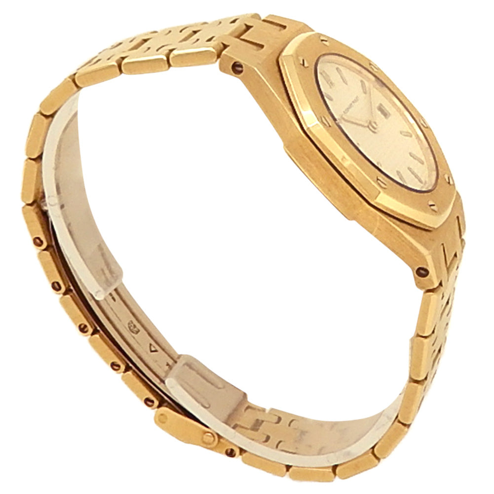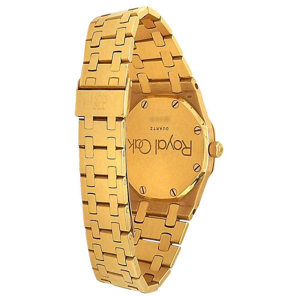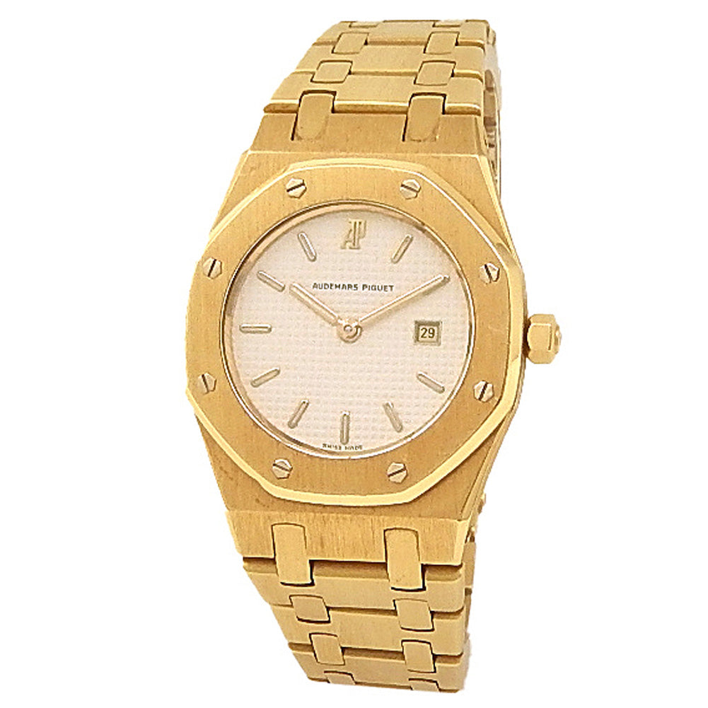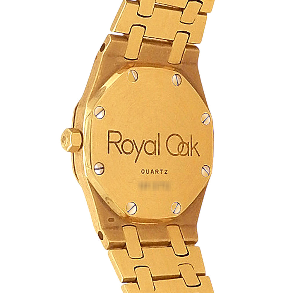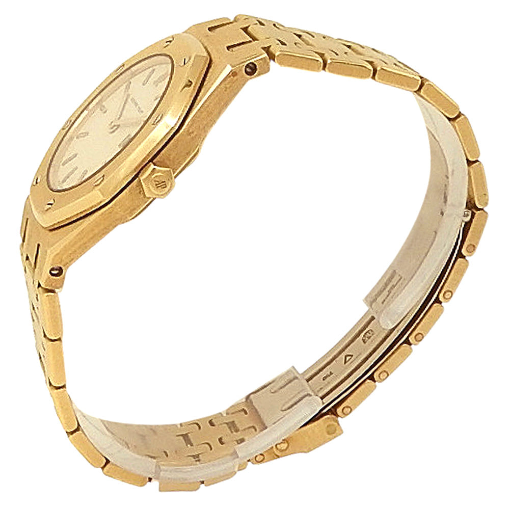 Pre-Owned Watch. Audemars Piguet Royal Oak ladies watch with 18k Yellow Gold case and bracelet. Watch has a off white dial with date feature. Watch runs on quartz movement. Watch can fit up to a size 6 1/4 inch wrist. Watch has signs of wear (hairline scratches).