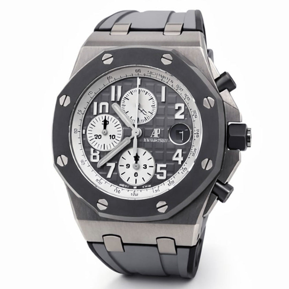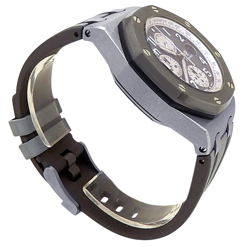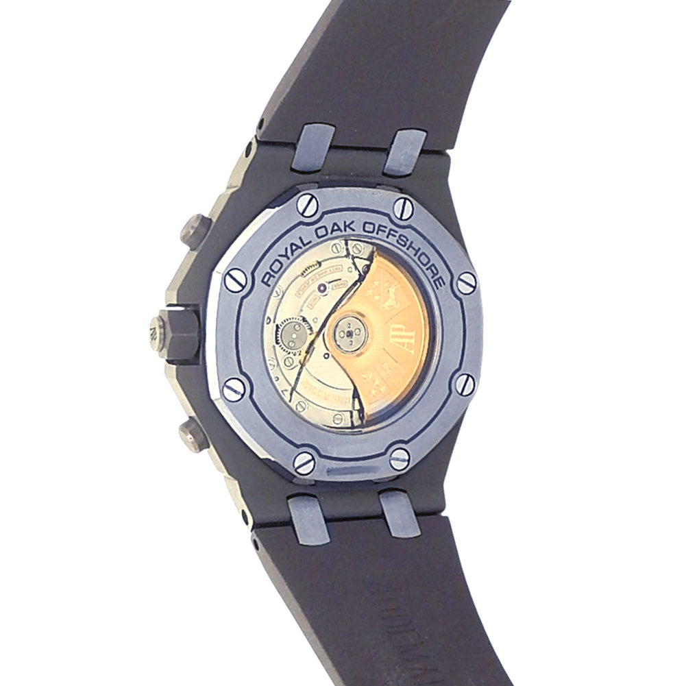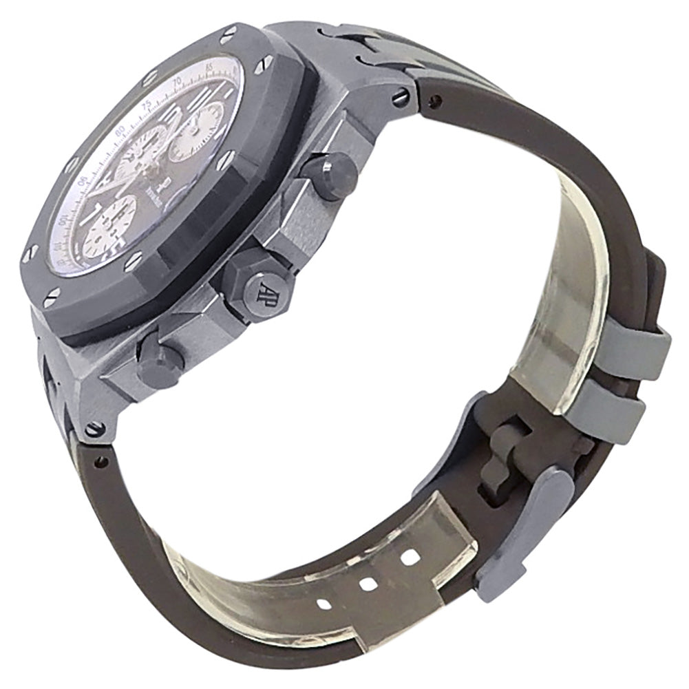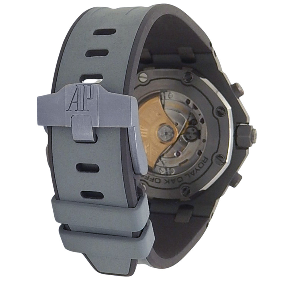 Pre-Owned Watch. Audemars Piguet Royal Oak Offshore “Ghost” men’s watch with Titanium case and Grey Rubber strap. Watch has a slate grey dial with date and chronograph features. Watch runs on automatic movement. Watch has signs of wear (hairline scratches).