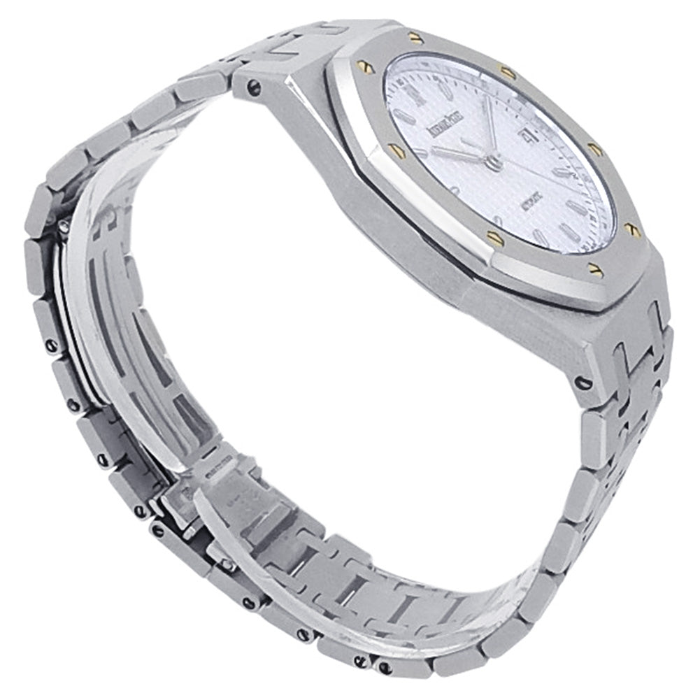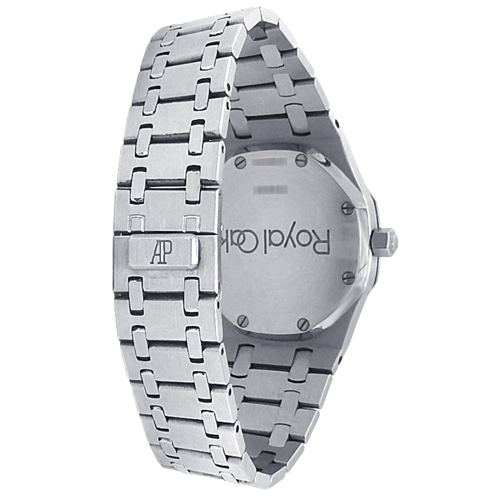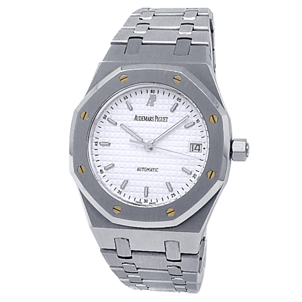 Pre-Owned Watch. Audemars Piguet Royal Oak men’s watch with Stainless Steel case and bracelet. Watch has a white dial with date feature. Watch runs on automatic movement. Watch can fit up to a size 7 inch wrist. Watch has signs of wear (hairline scratches).