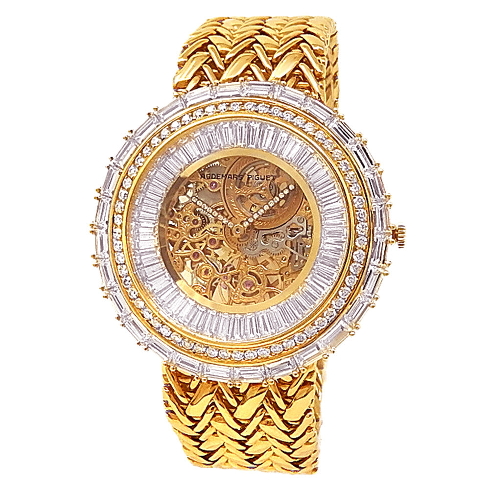 Pre-Owned Watch. Audemars Piguet Vintage men’s watch with 18k Yellow Gold case and bracelet. Watch has a skeleton with baguette diamonds skeleton dial with baguette diamonds bezel. Watch runs on automatic movement. Watch can fit up to a size 6¾ inch wrist. Watch has signs of wear (hairline scratches). Watch does come with box and papers.