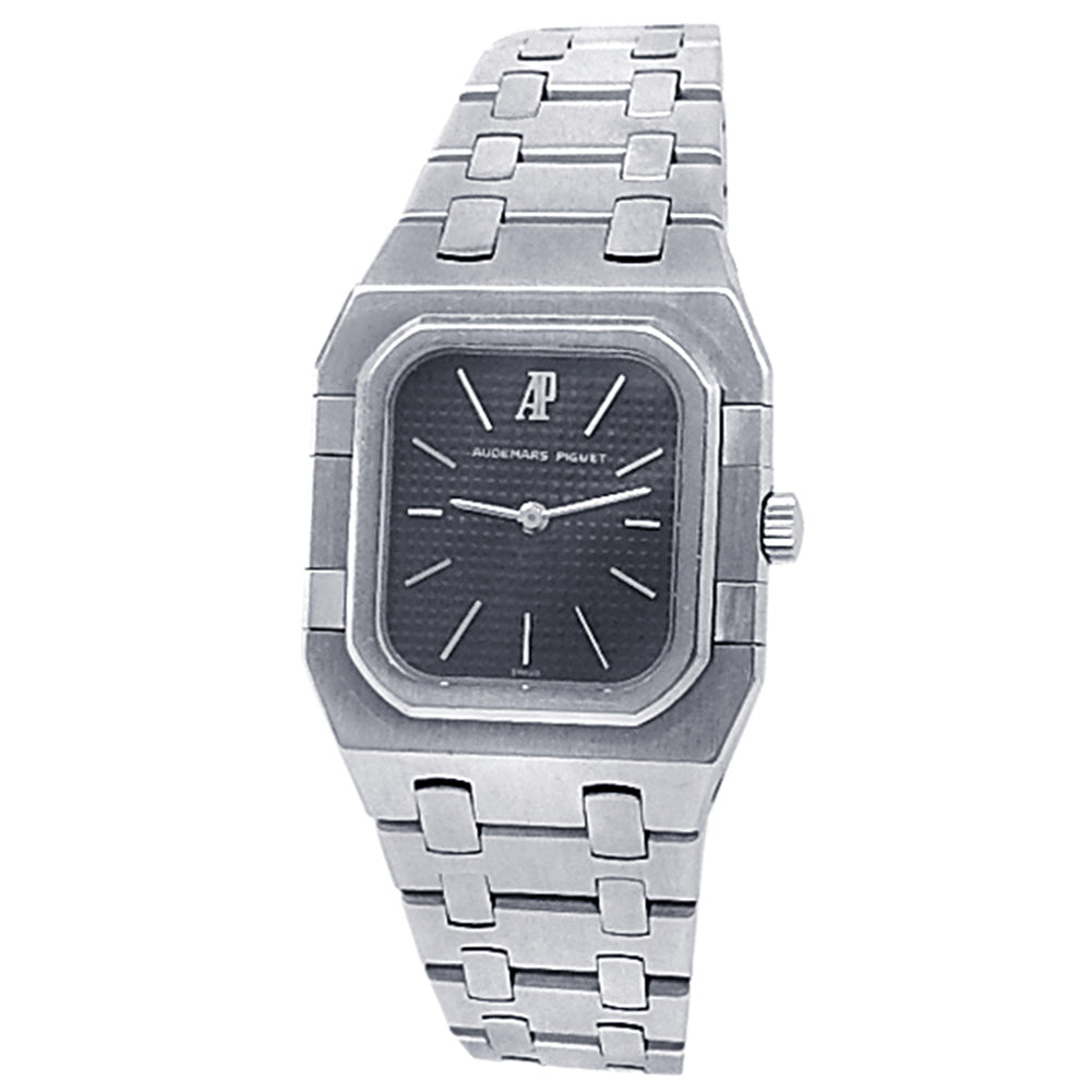 Pre-Owned Watch. Audemars Piguet Vintage ladies watch with Stainless Steel case and bracelet. Watch has a black dial. Watch runs on quartz movement. Watch can fit up to a size 6 inch wrist. Watch has signs of wear (hairline scratches).