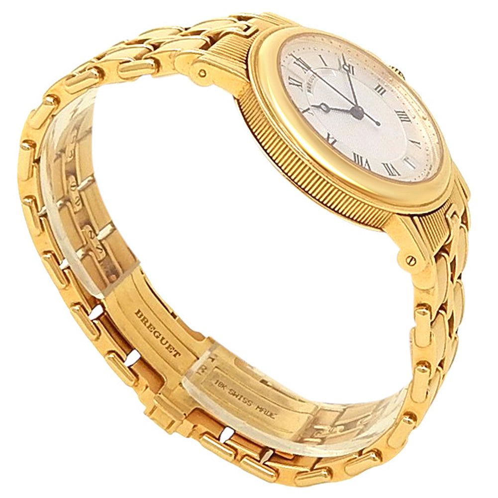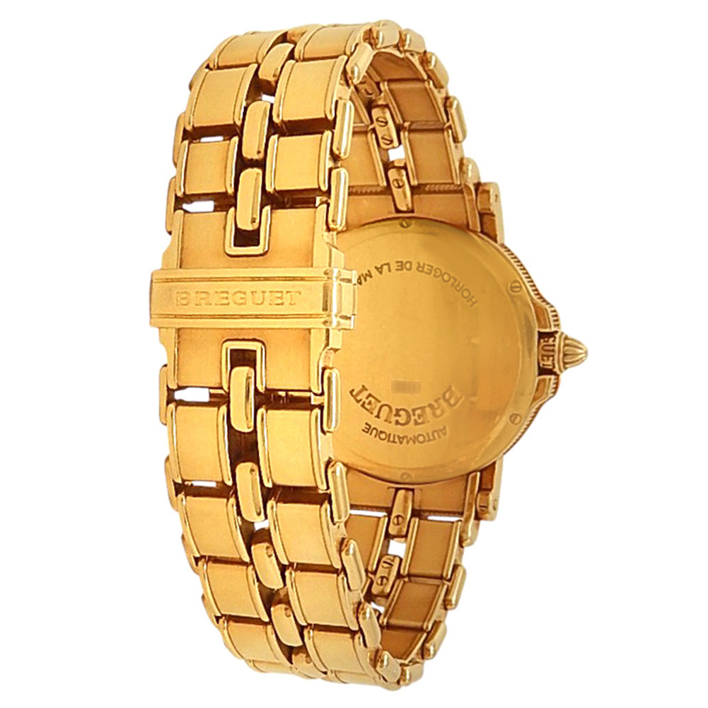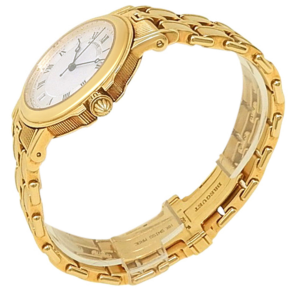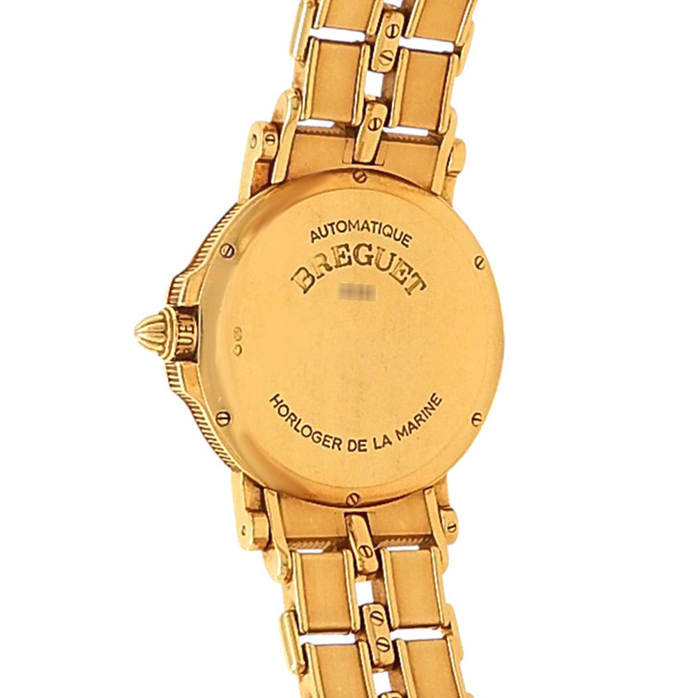 Pre-Owned Watch. Breguet Marine men’s watch with 18k Yellow Gold case and bracelet. Watch has a silver dial with date feature. Watch runs on automatic movement. Watch can fit up to a size 7¼ inch wrist. Watch has signs of wear (hairline scratches).