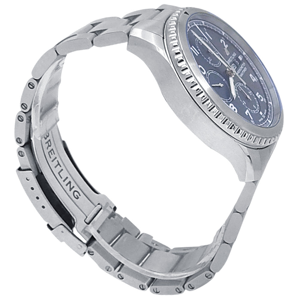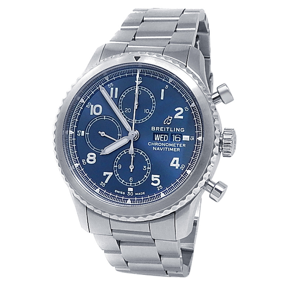 Pre-Owned Watch. Breitling Navitimer 8 Chronograph men’s watch with Stainless Steel case and bracelet. Watch has a blue dial with date, day and chronograph features. Watch runs on automatic movement. Watch can fit up to a size 8¼ inch wrist. Watch has signs of wear (hairline scratches). Watch does come with box and papers.