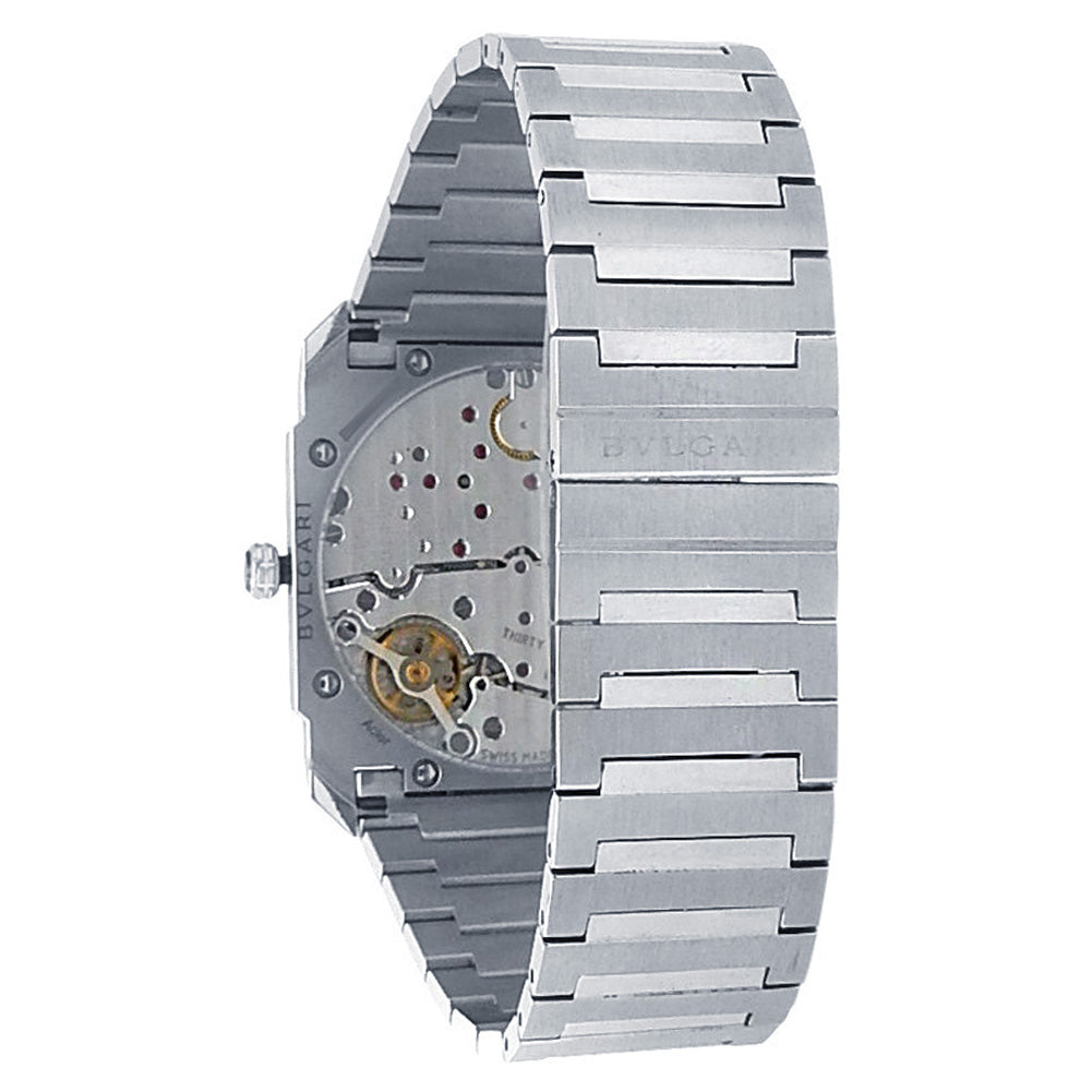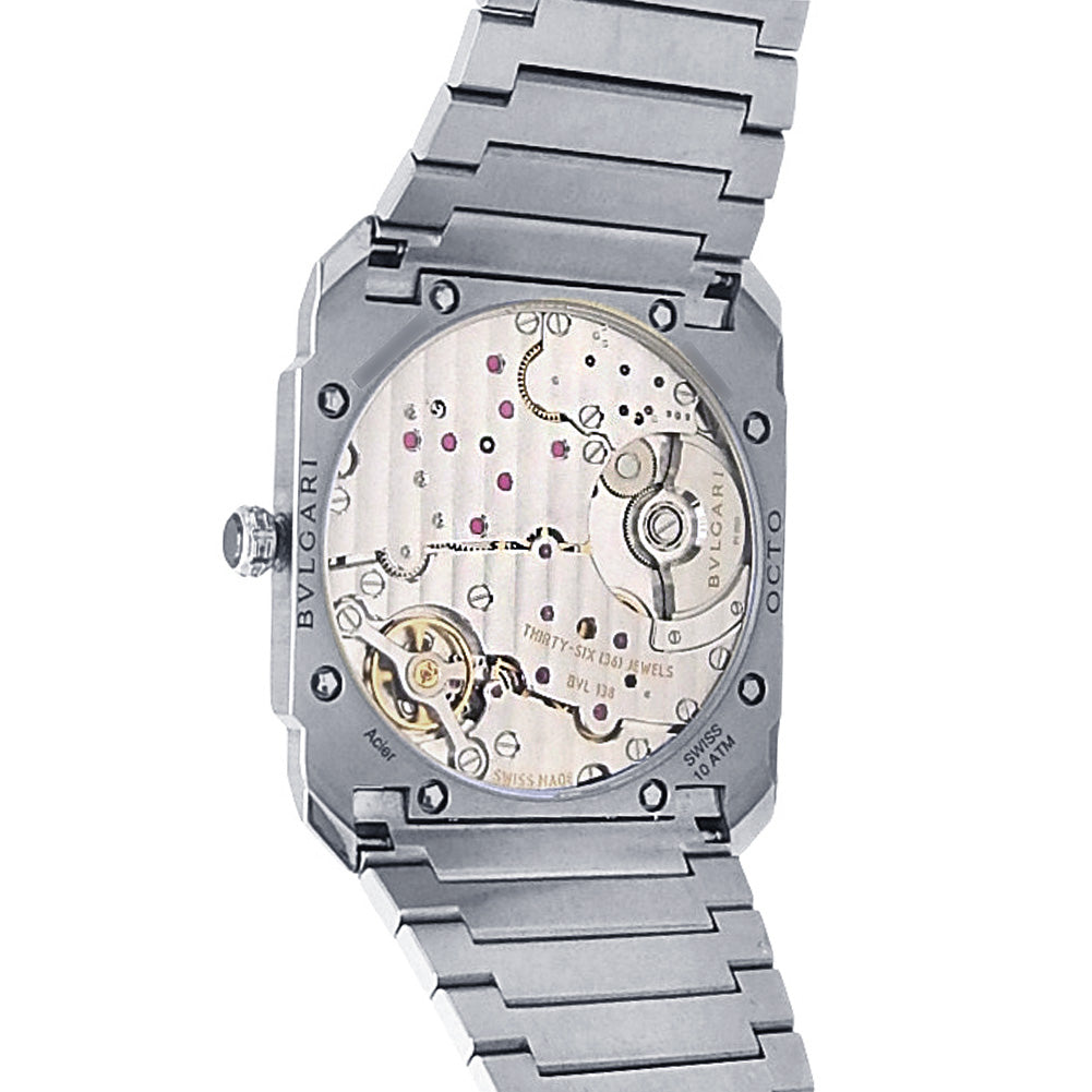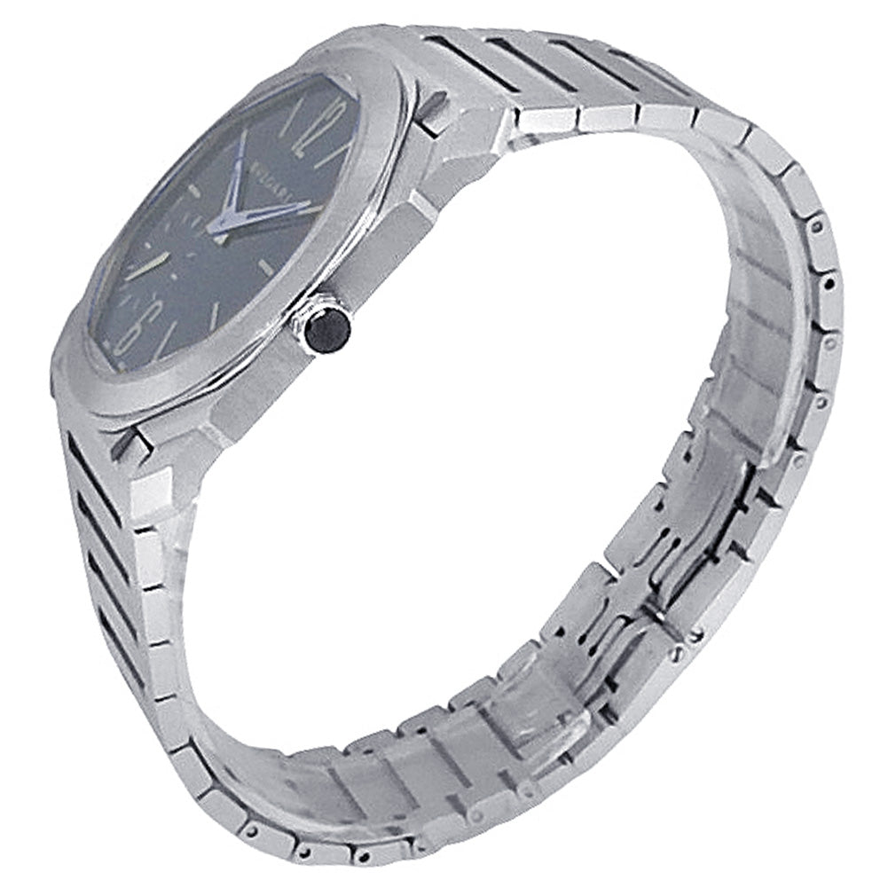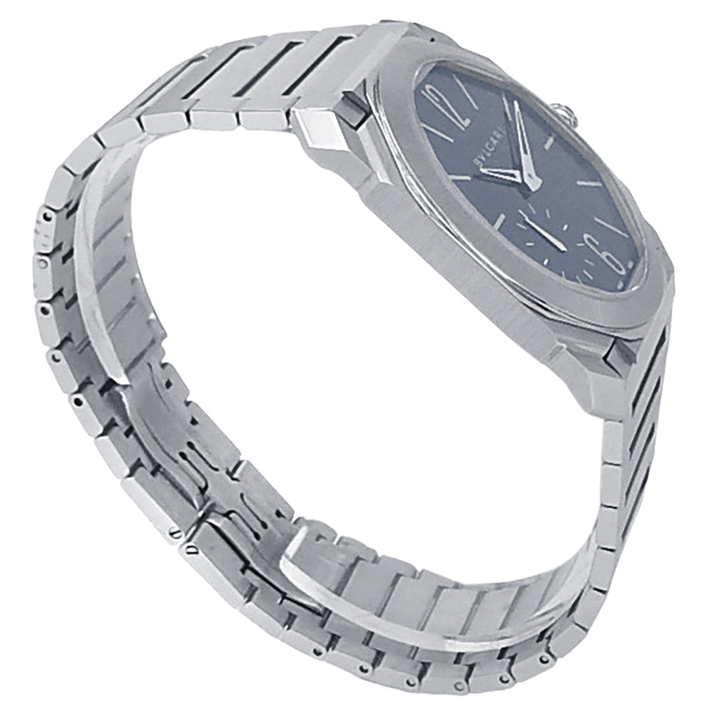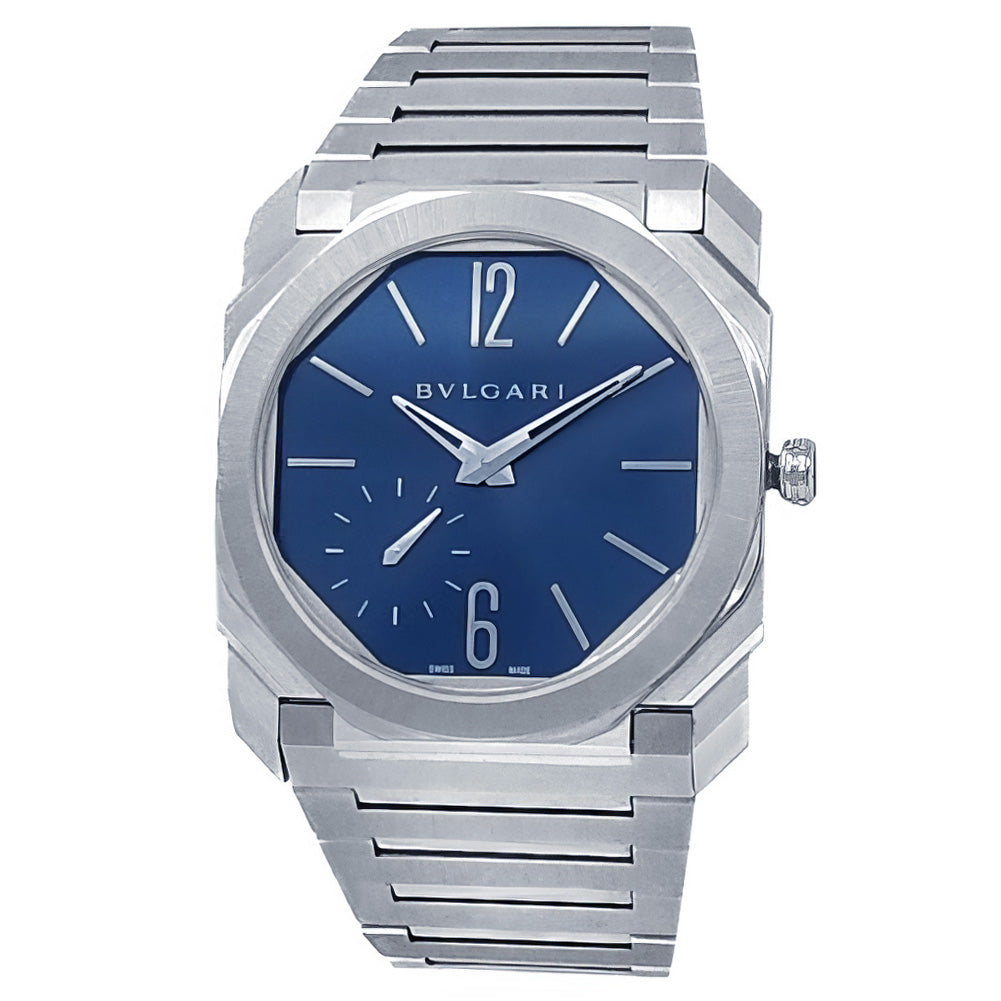 Pre-Owned Watch. Bvlgari Octo Finissimo men’s watch with Stainless Steel case and bracelet. Watch has a blue dial with a small seconds subdial. Watch runs on automatic movement. Watch can fit up to a size 7¾ inch wrist. Watch has signs of wear (hairline scratches). Watch does come with box and papers.