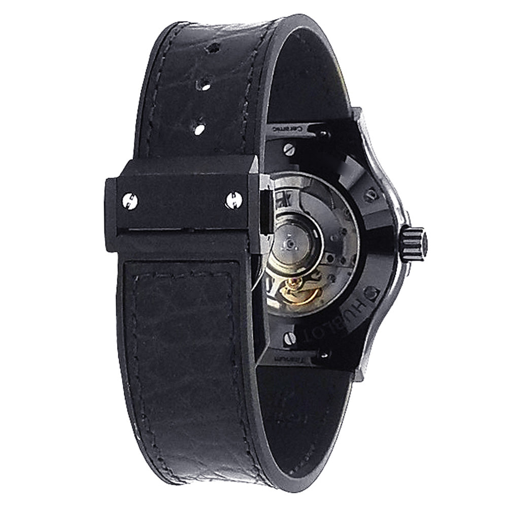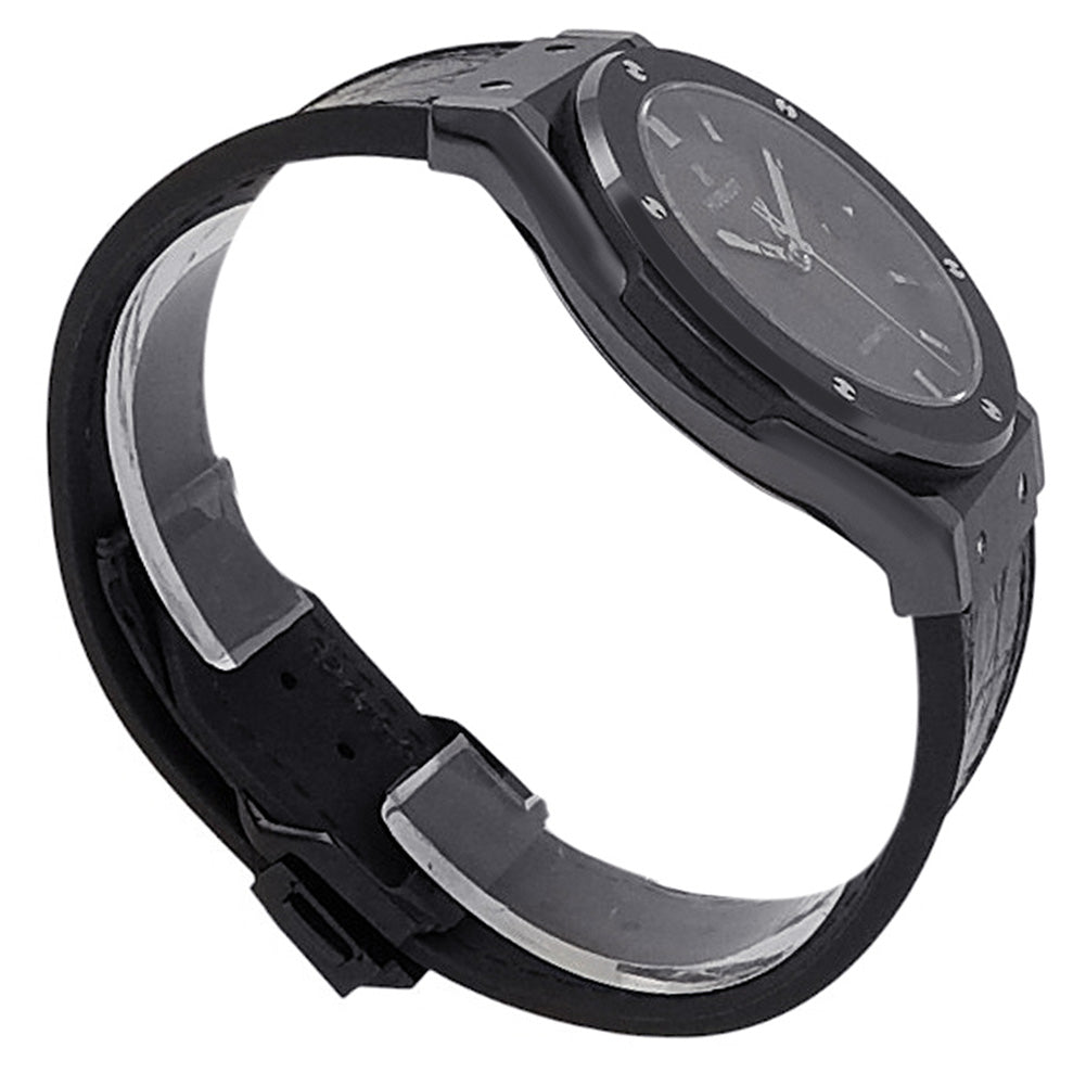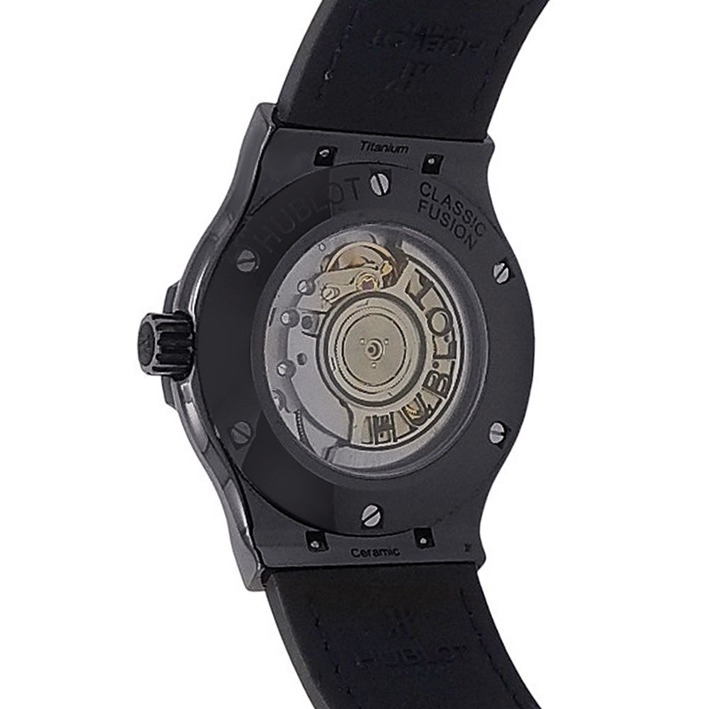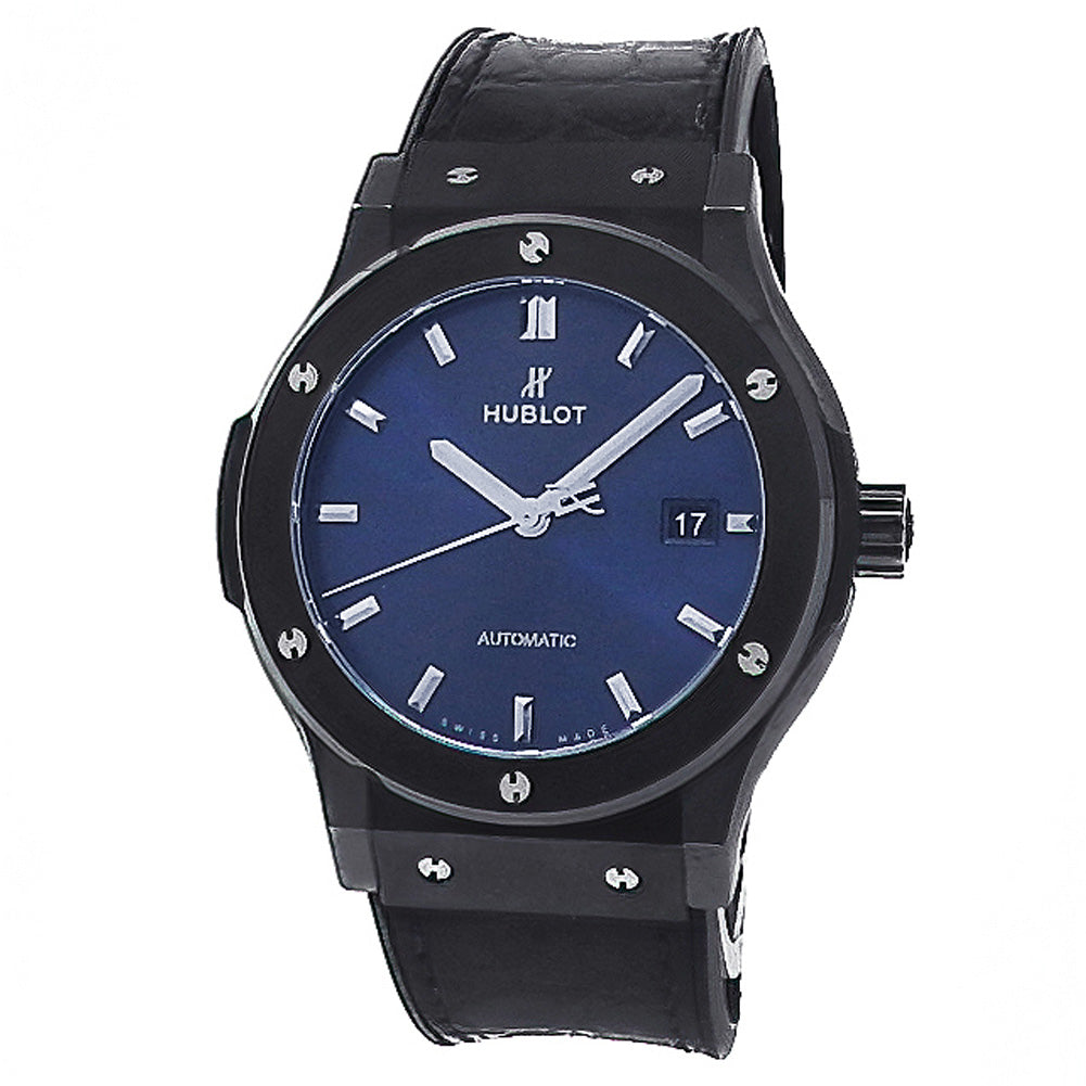 Pre-Owned Watch. Hublot Classic Fusion men’s watch with Black Ceramic case and Blue Leather Rubber strap. Watch has a blue dial with date feature. Watch runs on automatic movement. Watch has signs of wear (hairline scratches).