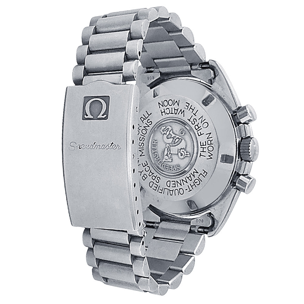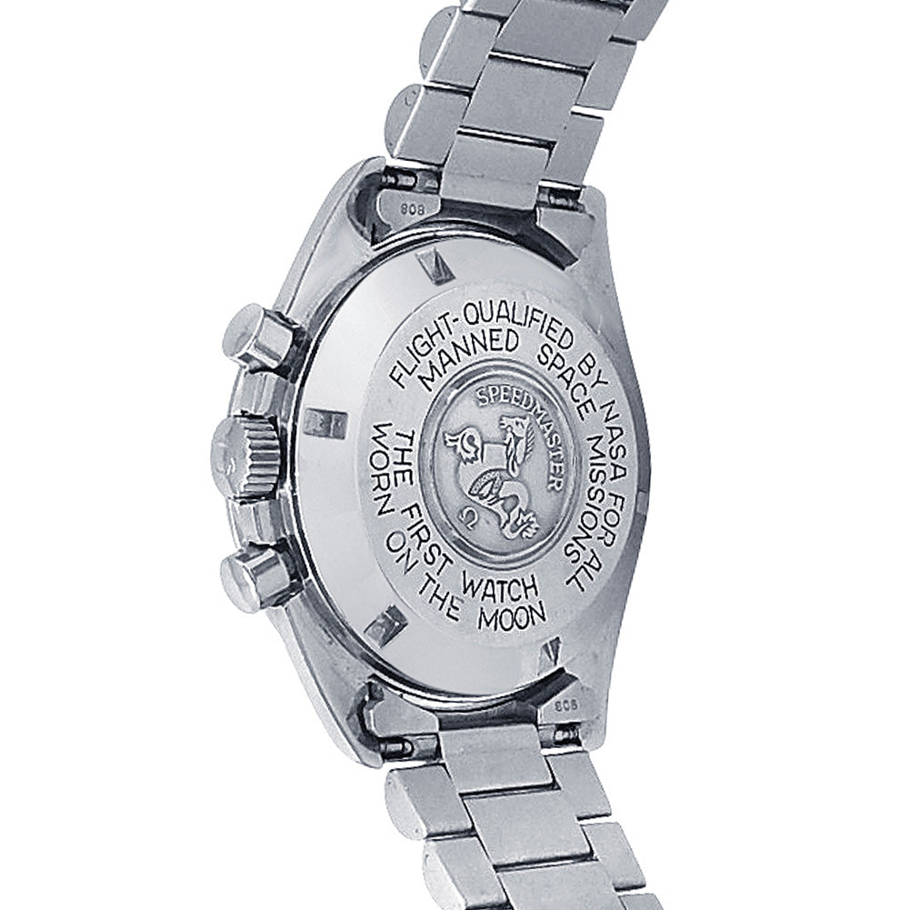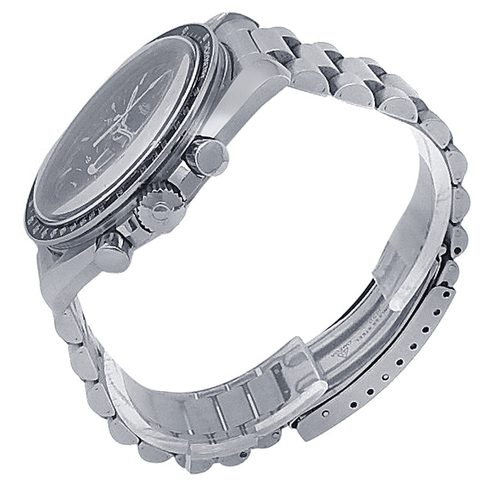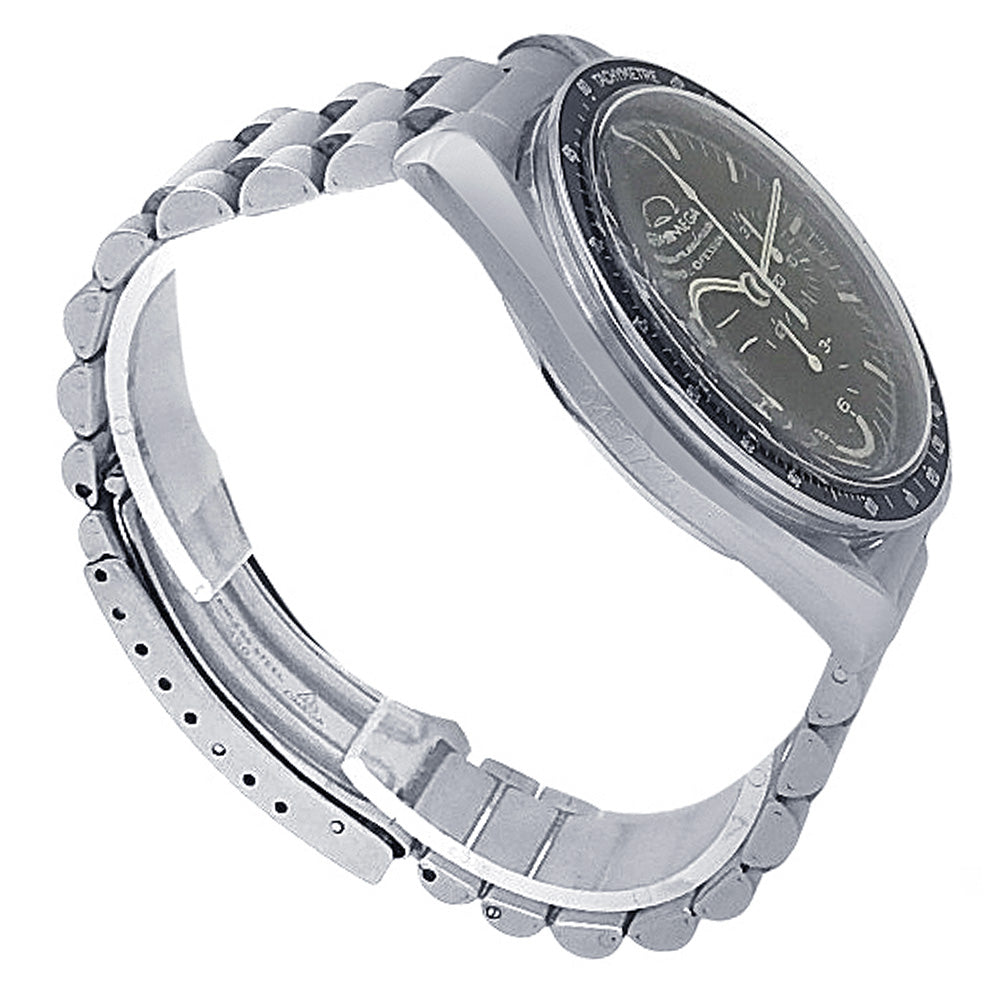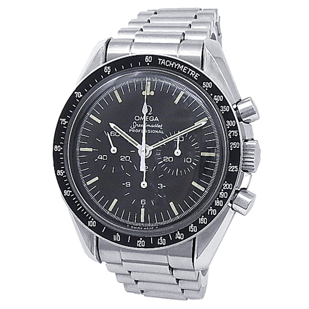 Pre-Owned Watch. Omega Speedmaster Professional Moonwatch men's watch with Stainless Steel case and bracelet. Watch has a black dial with chronograph feature. Watch runs on manual movement. Watch can fit up to a size 7 3/4 inch wrist. Watch has signs of wear (hairline scratches).