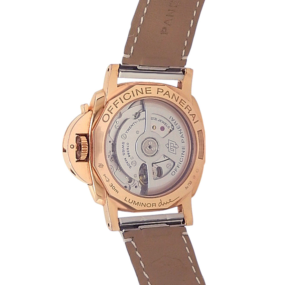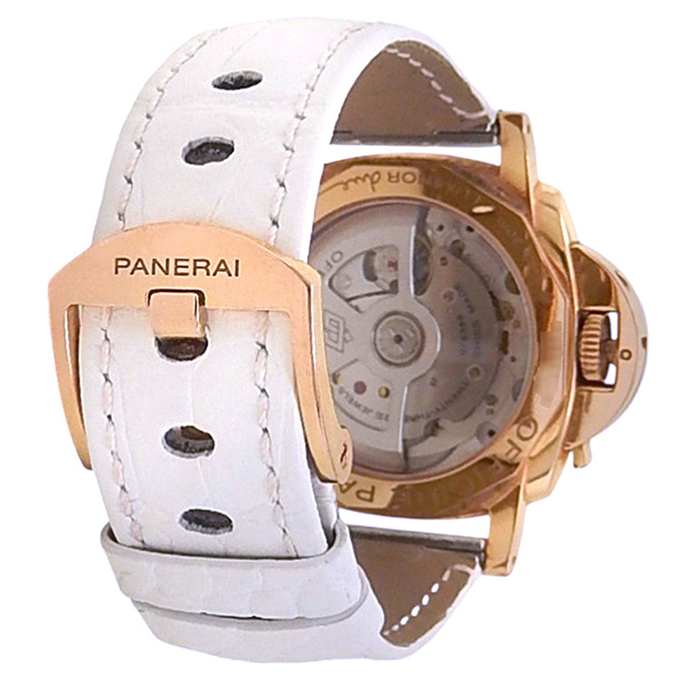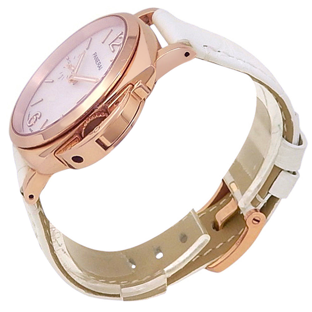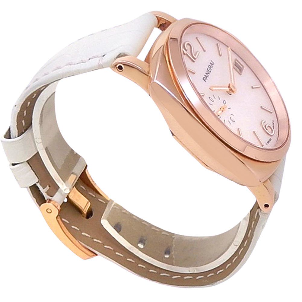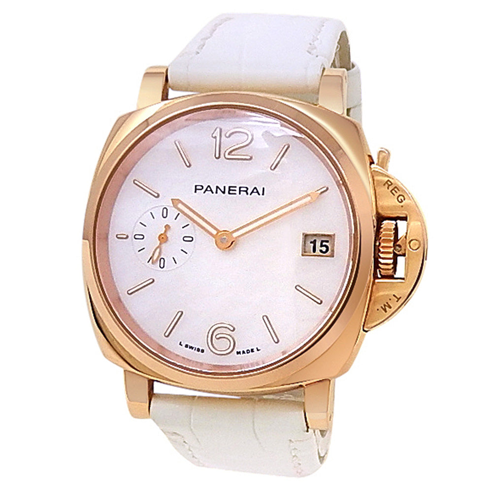 Pre-Owned Watch. Panerai Luminor Due Goldtech ladies watch with 18k Rose Gold case and White Leather strap. Watch has a mother of pearl dial with date feature and a small second subdial. Watch runs on automatic movement. Watch has signs of wear (hairline scratches). Watch does come with box and papers.