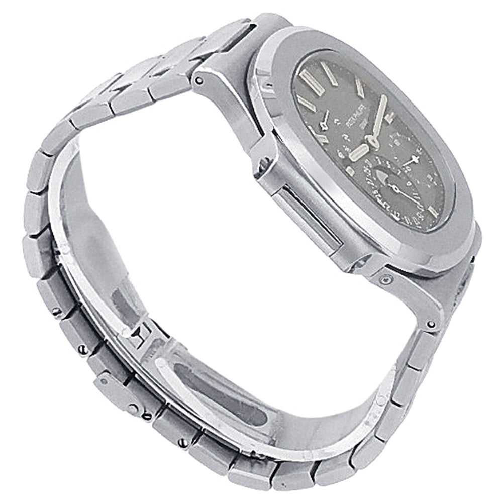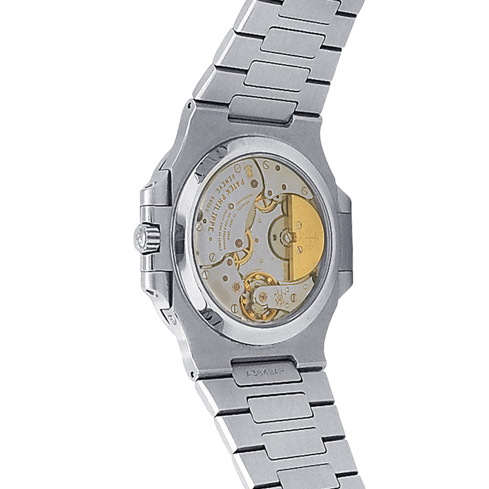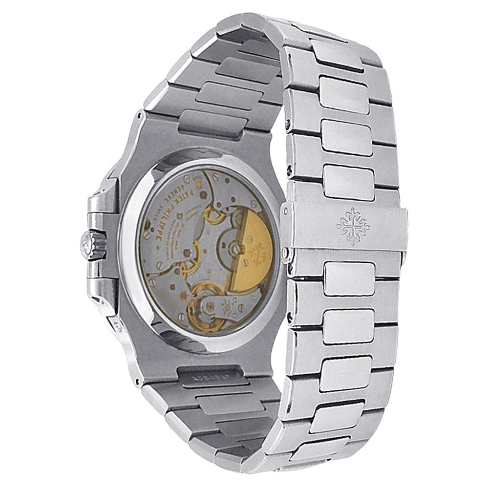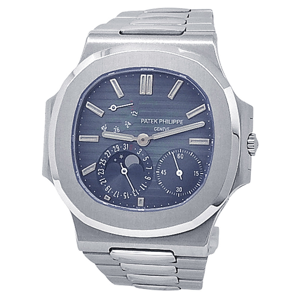 Pre-Owned Watch. Patek Philippe Nautilus men’s watch with Stainless Steel case and bracelet. Watch has a blue dial with date, moon phase, power reserve features and small seconds subdial. Watch runs on automatic movement. Watch can fit up to a size 6¼ inch wrist. Watch has signs of wear (hairline scratches). Watch does come with box and papers.