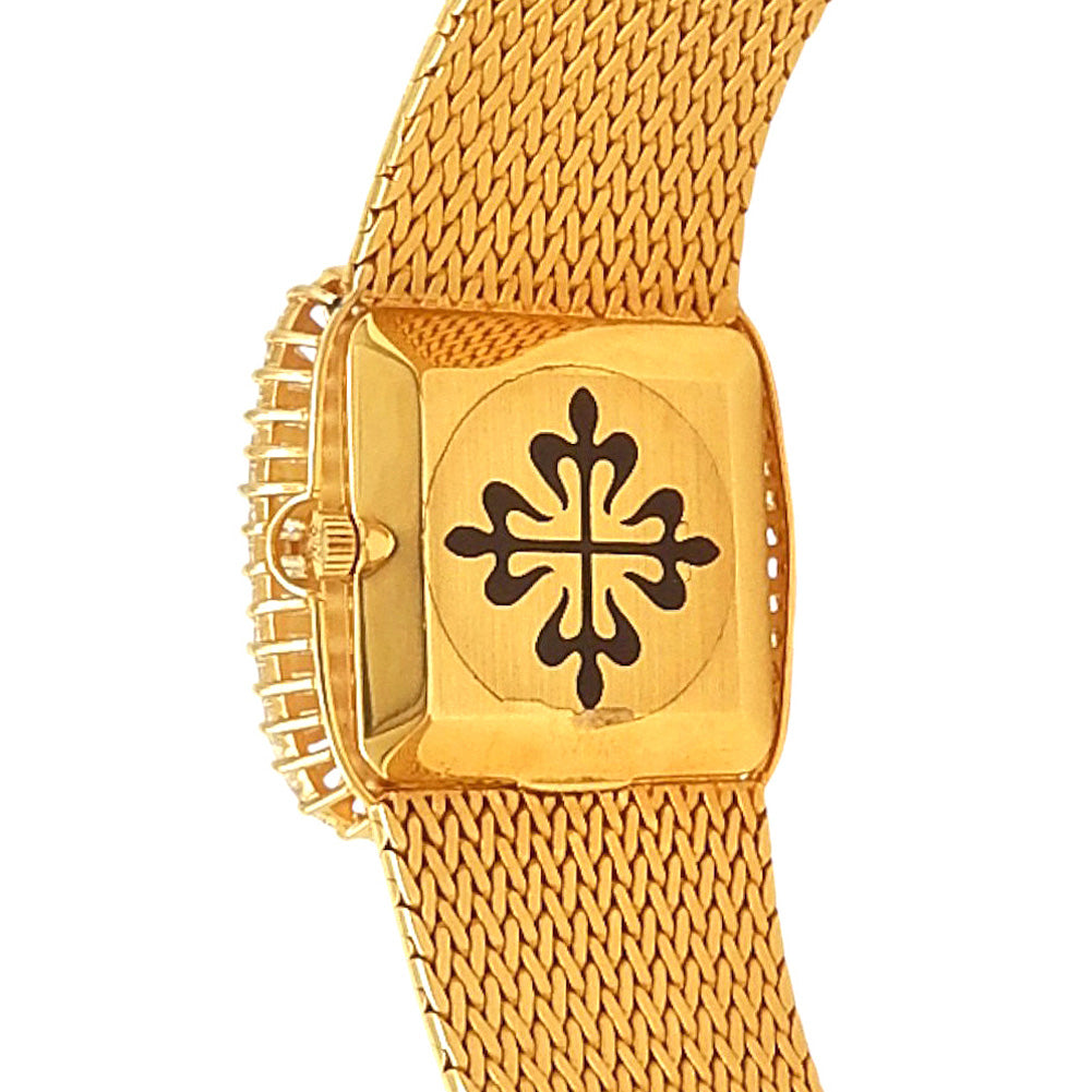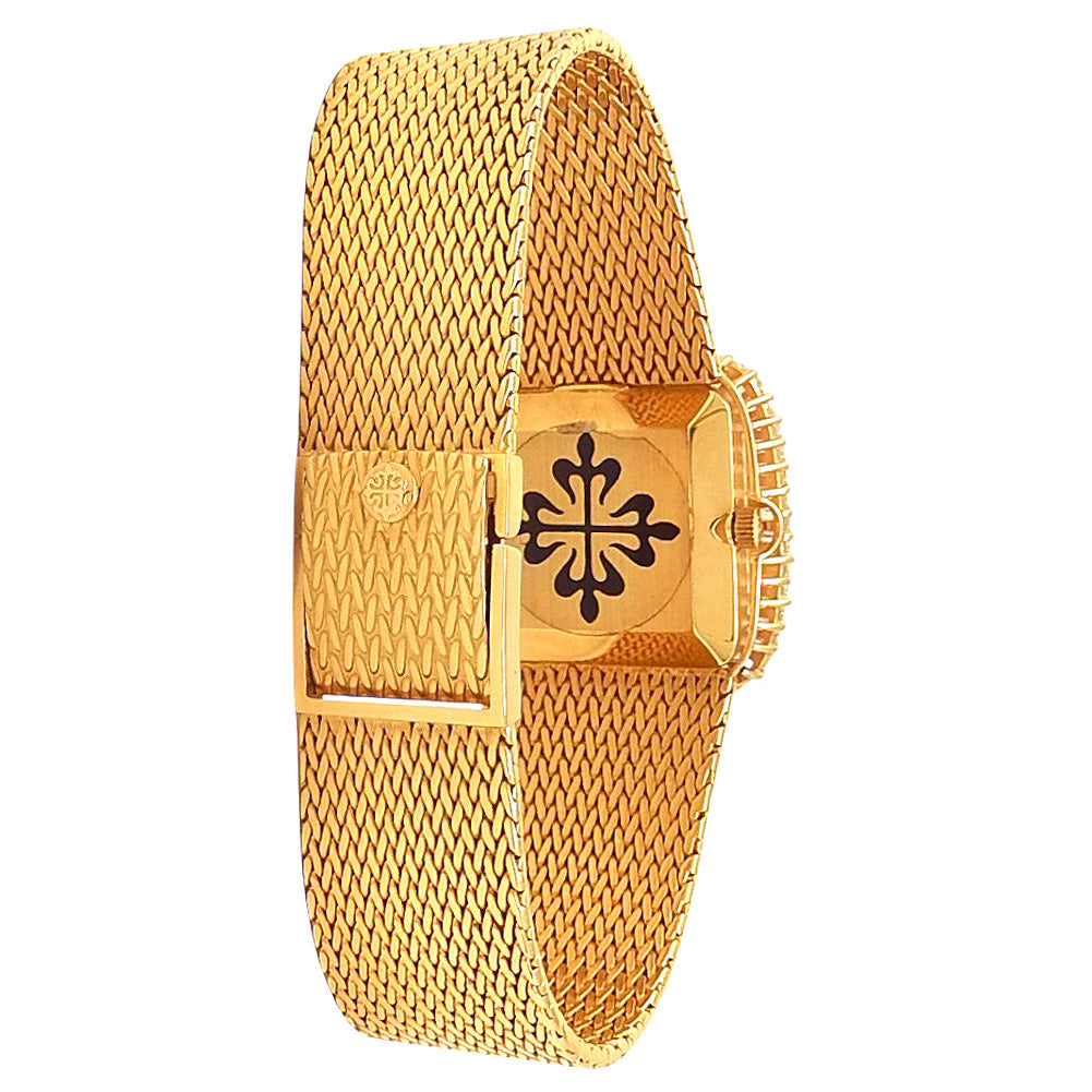 Pre-Owned Watch. Patek Philippe Vintage men’s watch with 18k Yellow Gold case and bracelet. Watch has a black with pave diamonds dial with baguette diamonds bezel. Watch runs on manual movement. Watch can fit up to a size 7¼ inch wrist. Watch has signs of wear (hairline scratches).