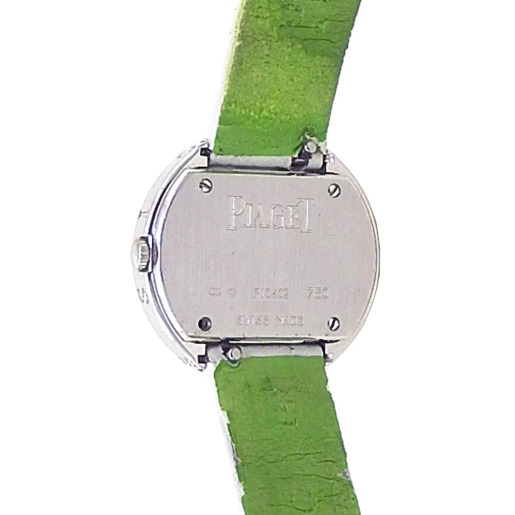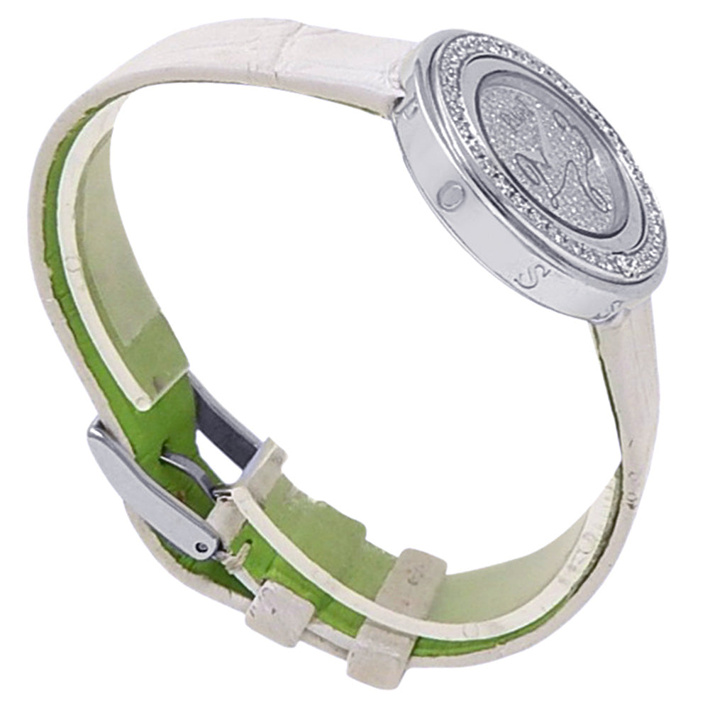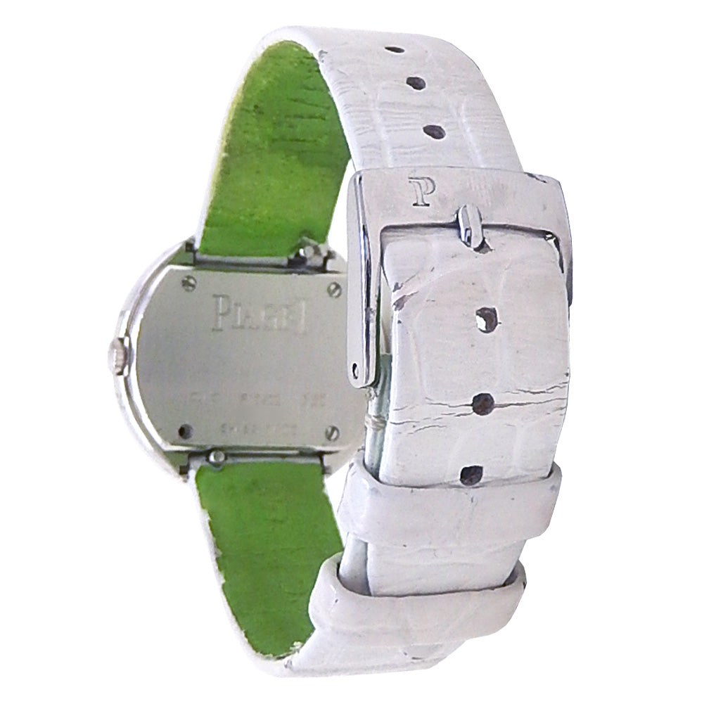 Pre-Owned Watch. Piaget Possession ladies watch with 18k White Gold case and White Leather strap. Watch has a diamonds pave dial with diamonds bezel. Watch runs on quartz movement. Watch has signs of wear (hairline scratches).