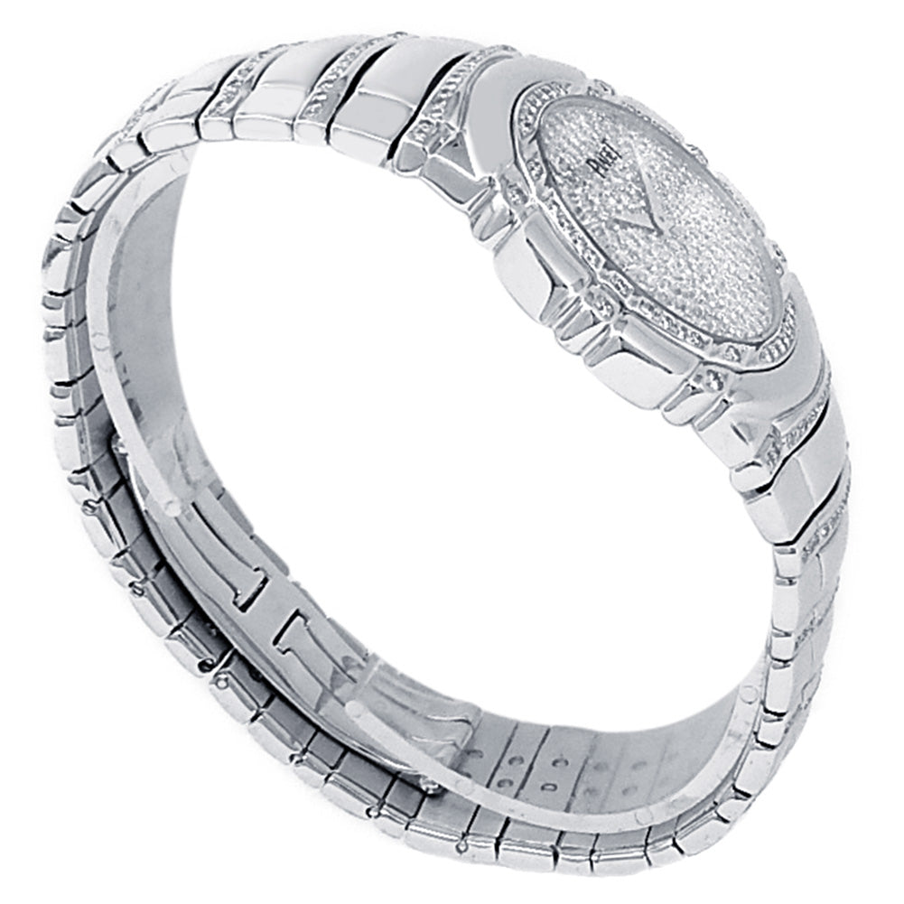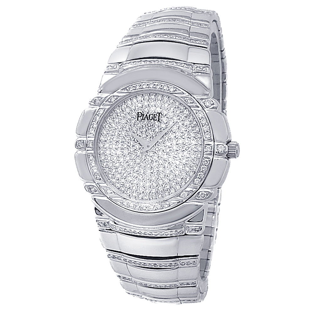 Pre-Owned Watch. Piaget Tanagra ladies watch with 18k White Gold case and bracelet. Watch has a diamonds pave dial with diamonds bezel. Watch runs on manual movement. Watch can fit up to a size 6¾ inch wrist. Watch has signs of wear (hairline scratches).