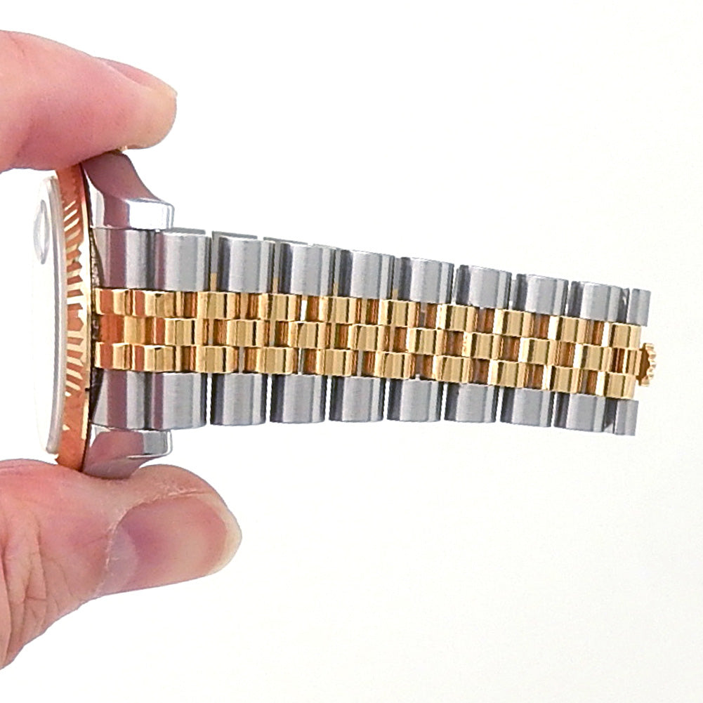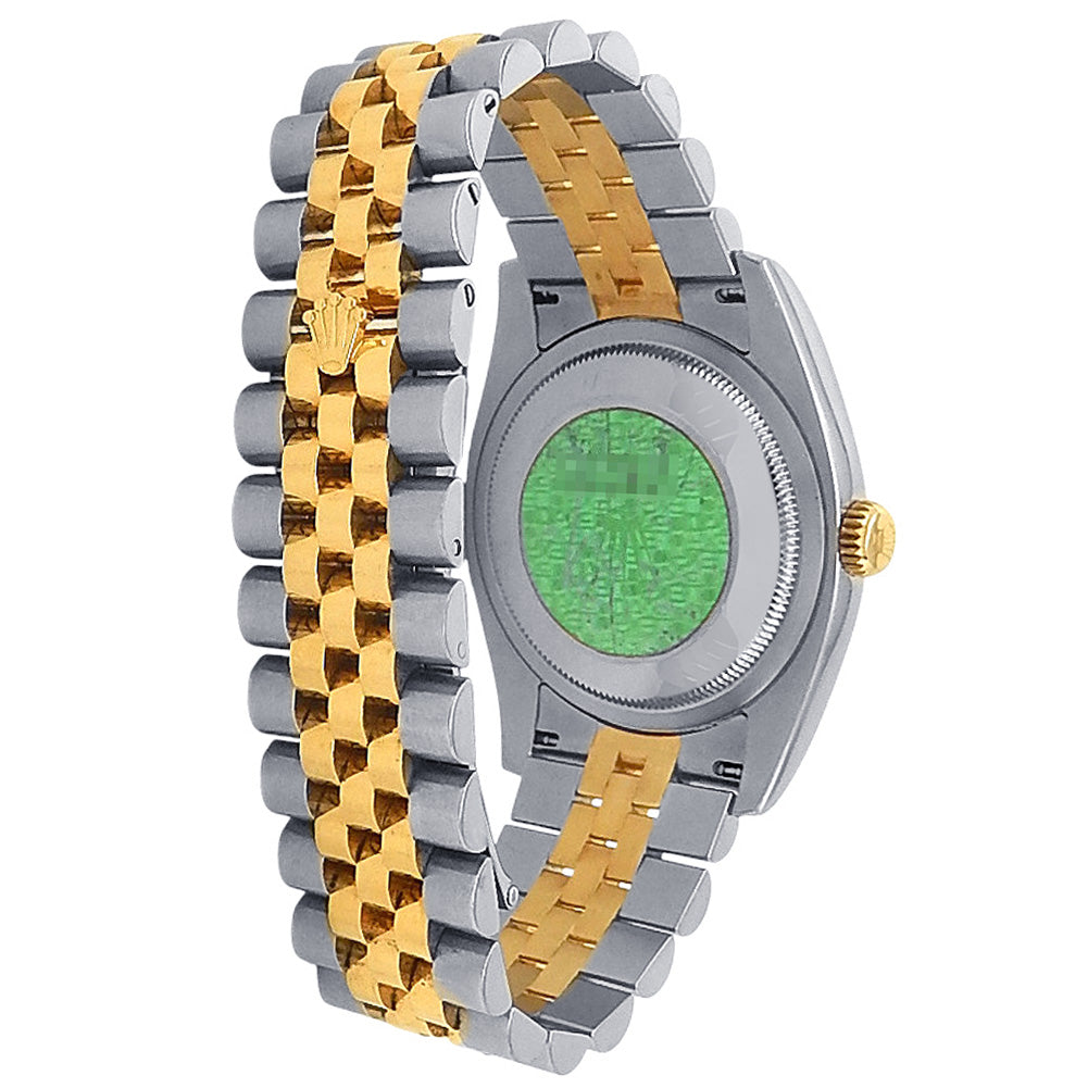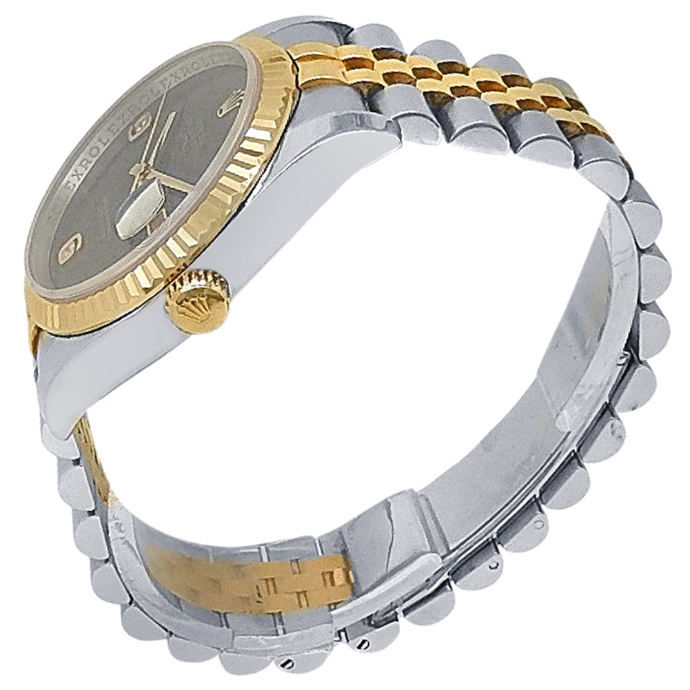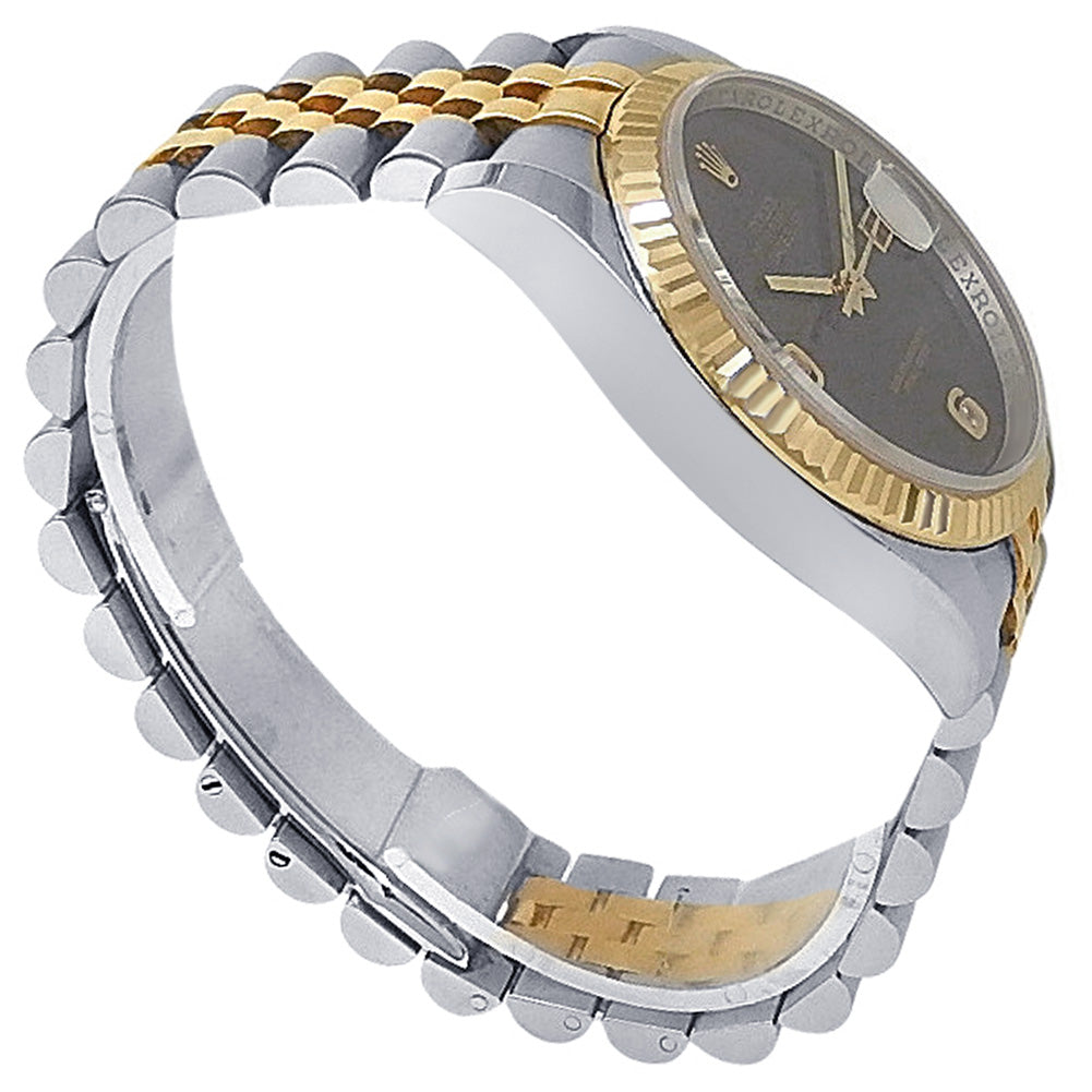 Pre-Owned Watch. Rolex Datejust men’s watch circa 2007 with 18k Yellow Gold & Stainless Steel case and Jubilee bracelet. Watch has a black dial with date feature and diamond markings. Watch runs on automatic movement. Watch can fit up to a size 6¾ inch wrist. Watch has signs of wear (hairline scratches). Watch does come with box and papers.