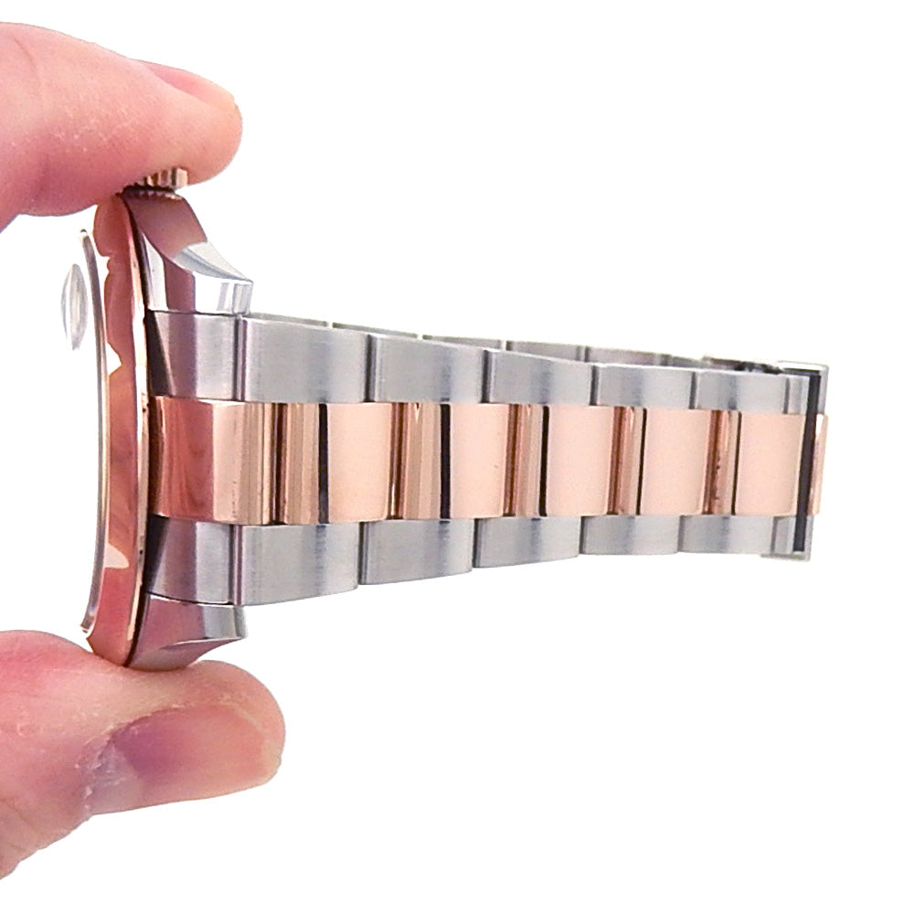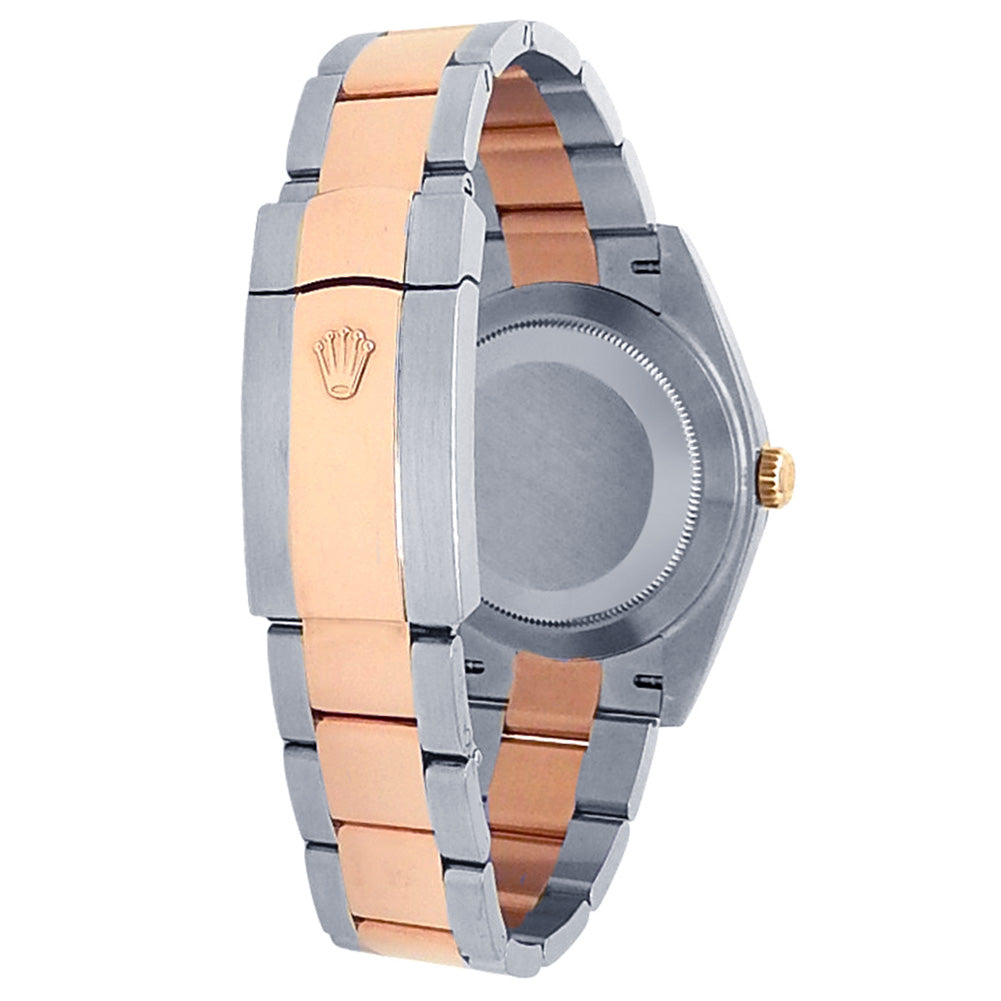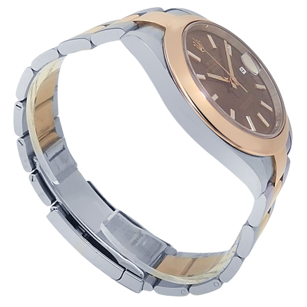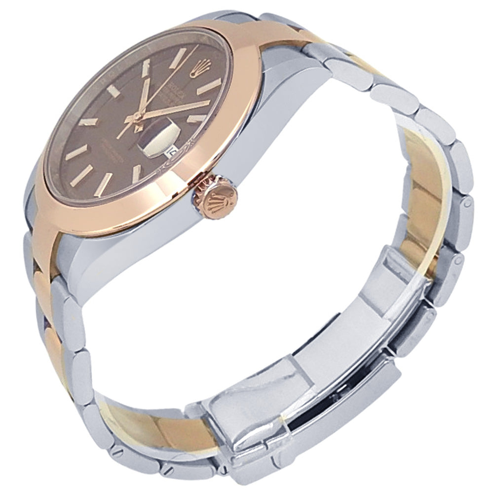 Pre-Owned Watch. Rolex Datejust 41 men’s watch with 18k Everose Gold & Stainless Steel case and Oyster bracelet. Watch has a chocolate dial with date feature. Watch runs on automatic movement. Watch can fit up to a size 7½ inch wrist. Watch has signs of wear (hairline scratches). Watch does come with box and card.
