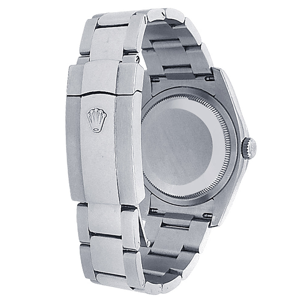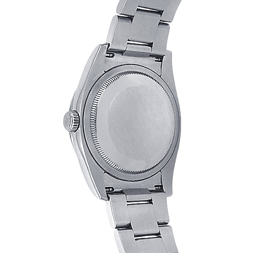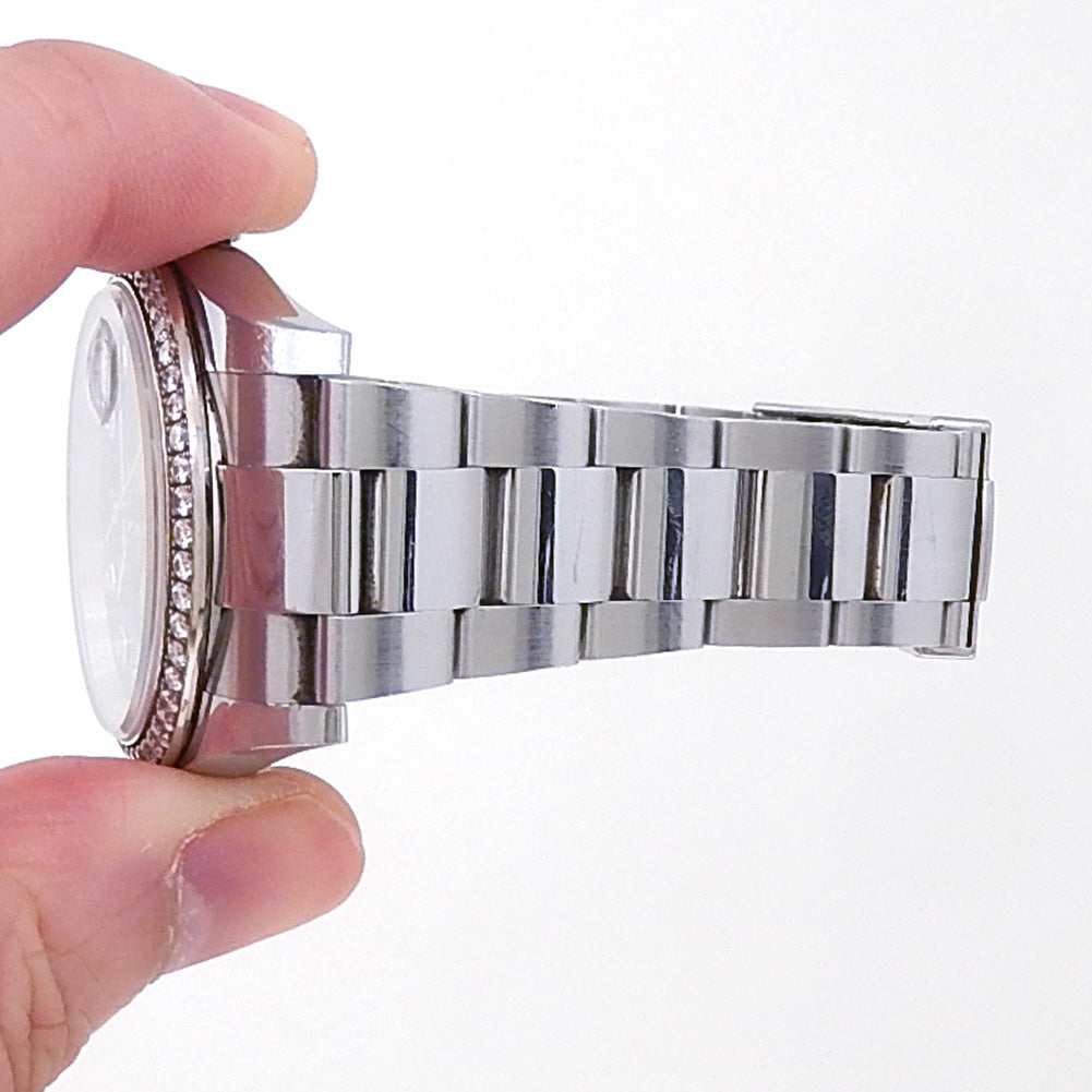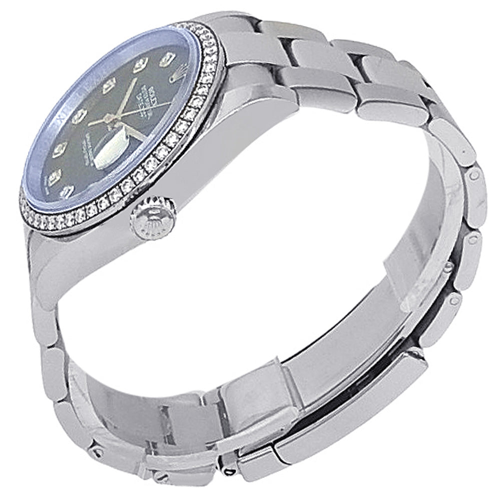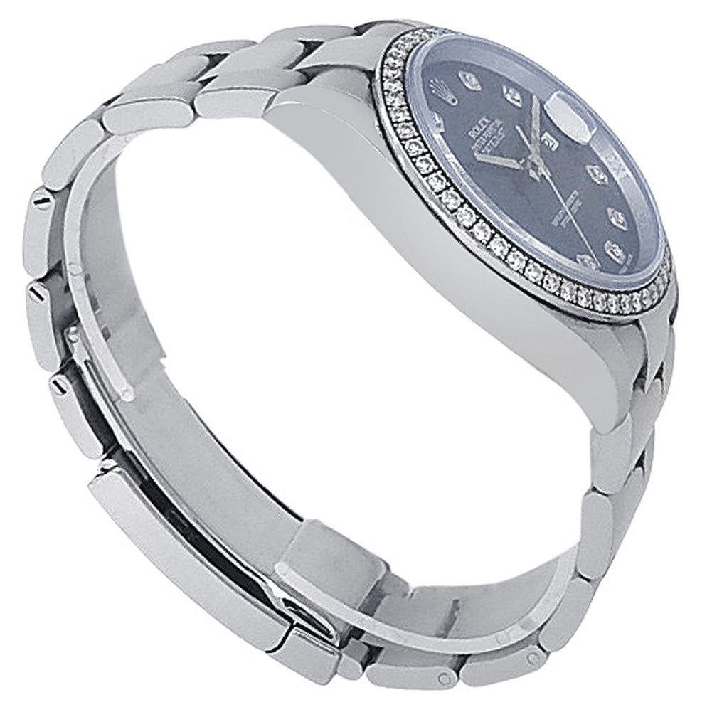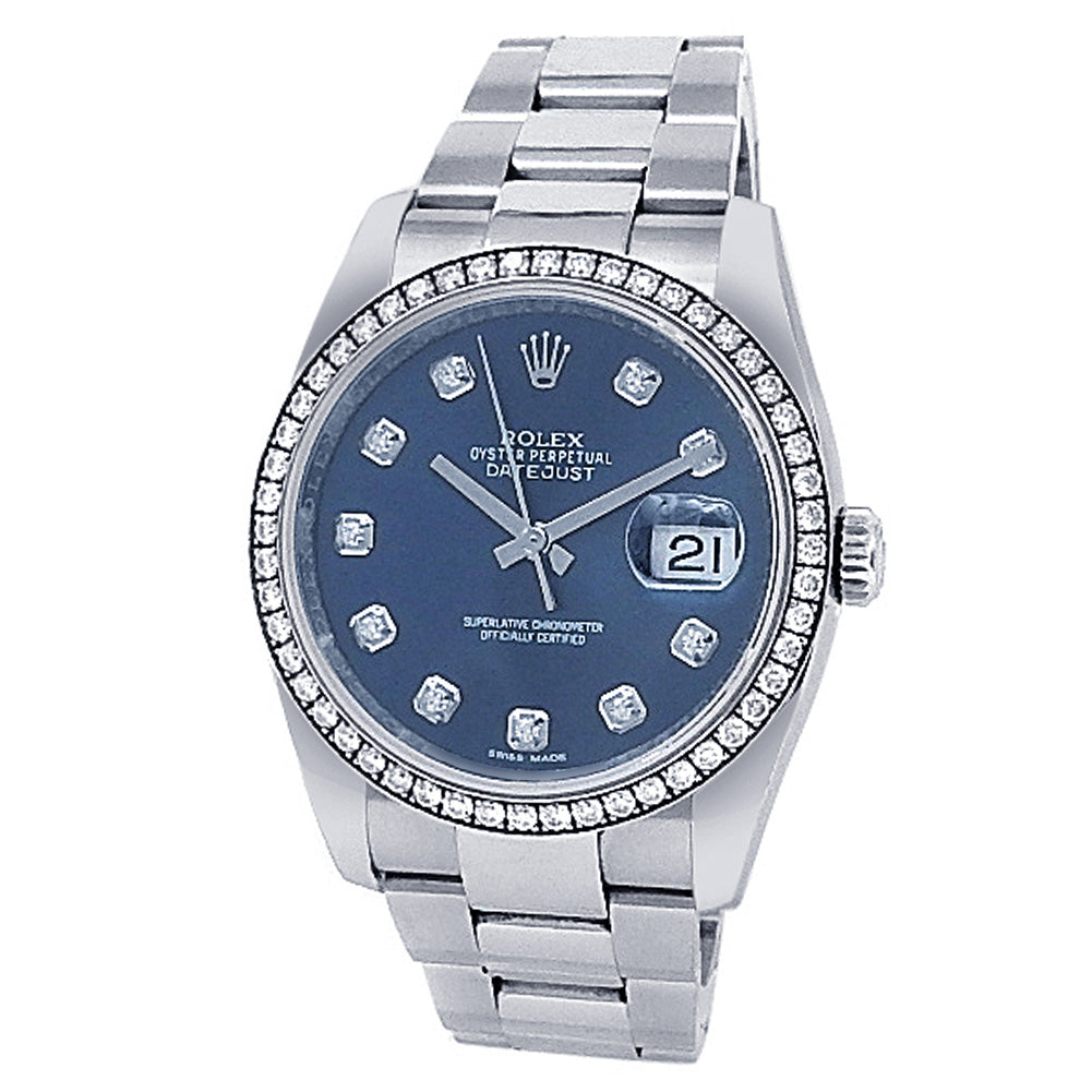 Pre-Owned Watch. Rolex Datejust men's watch with Stainless Steel case and Oyster bracelet. Watch has a blue dial with date feature, diamond markings and diamonds bezel. Watch runs on automatic movement. Watch can fit up to a size 7 inch wrist. Watch has signs of wear (hairline scratches). Watch does come with box and card.