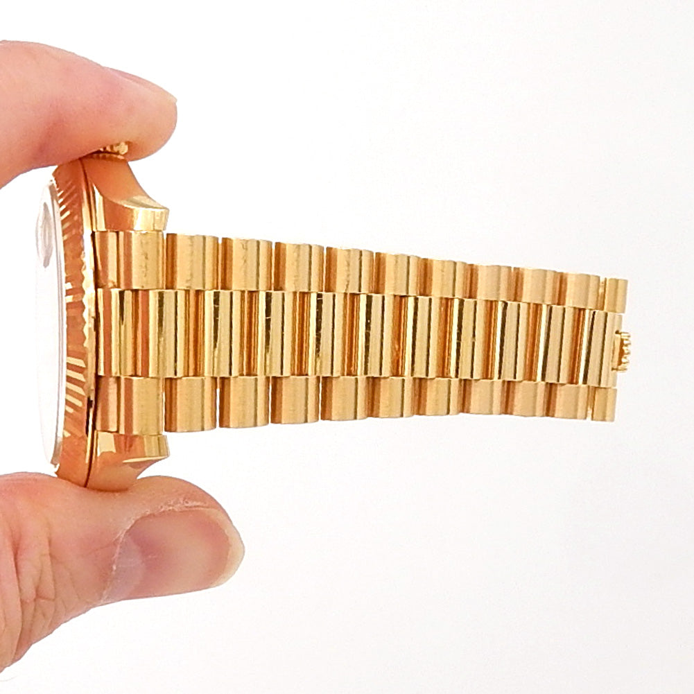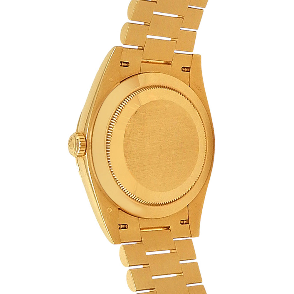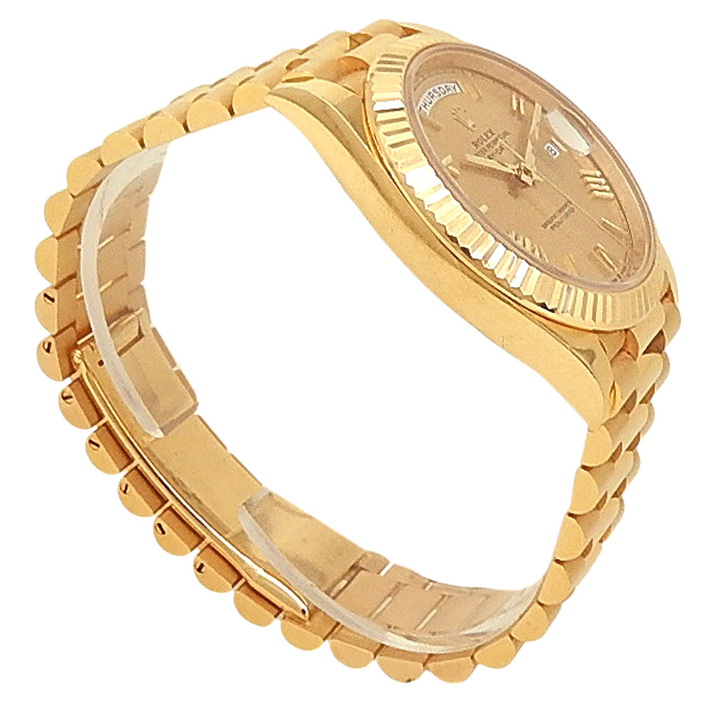 Pre-Owned Watch. Rolex Day-Date men’s watch with 18k Yellow Gold case and President bracelet. Watch has a champagne dial with date and day features. Watch runs on automatic movement. Watch can fit up to a size 7½ inch wrist. Watch has signs of wear (hairline scratches). Watch does come with box and card.