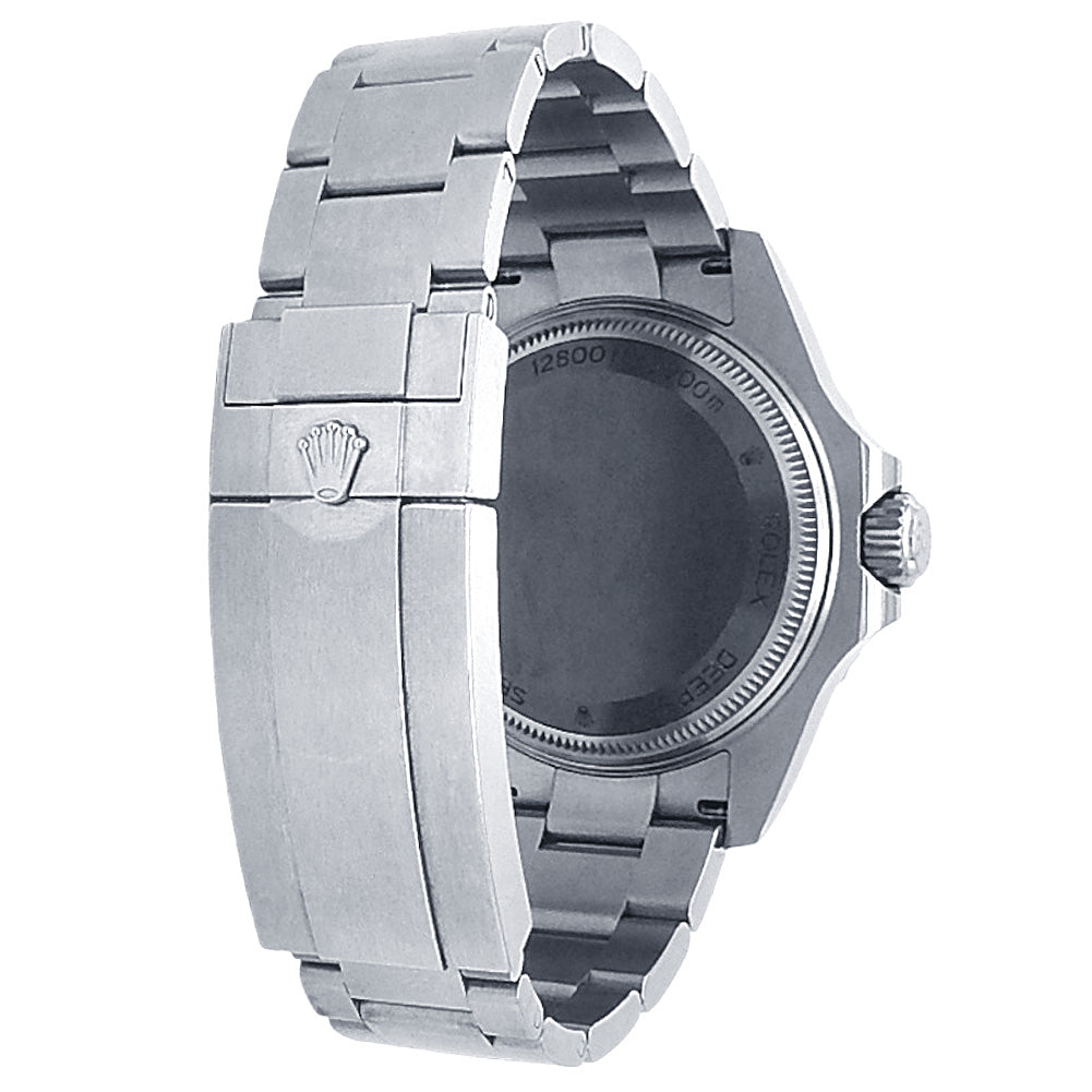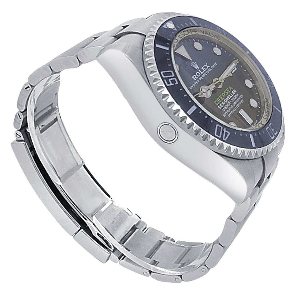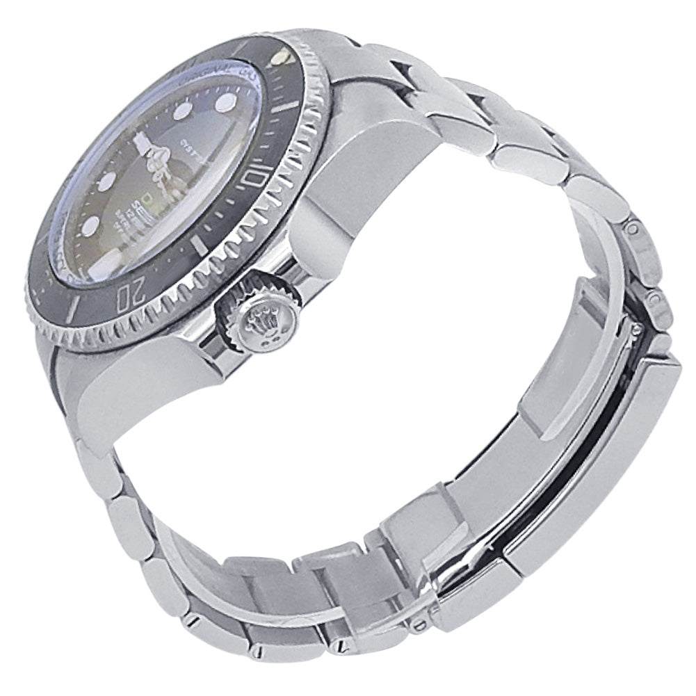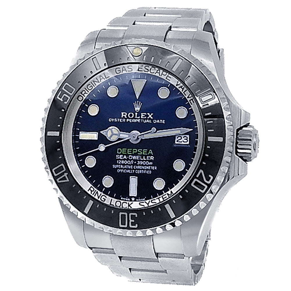 Pre-Owned Watch. Rolex Sea-Dweller Deepsea James Cameron men’s watch with Stainless Steel case and Oyster bracelet. Watch has a black & blue dial with date feature. Watch runs on automatic movement. Watch can fit up to a size 7½ inch wrist. Watch has signs of wear (hairline scratches). Watch does come with box and card.