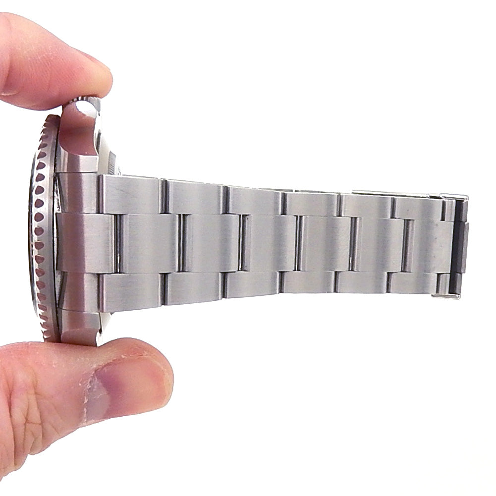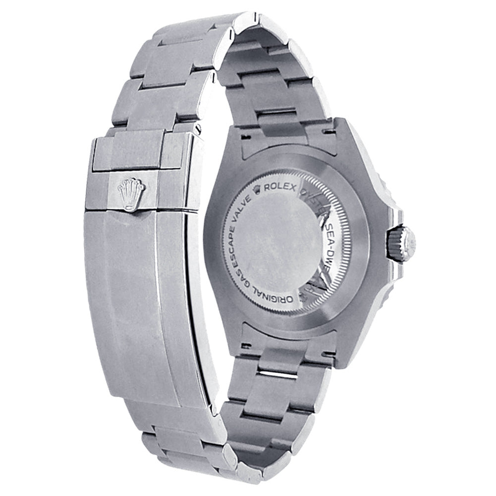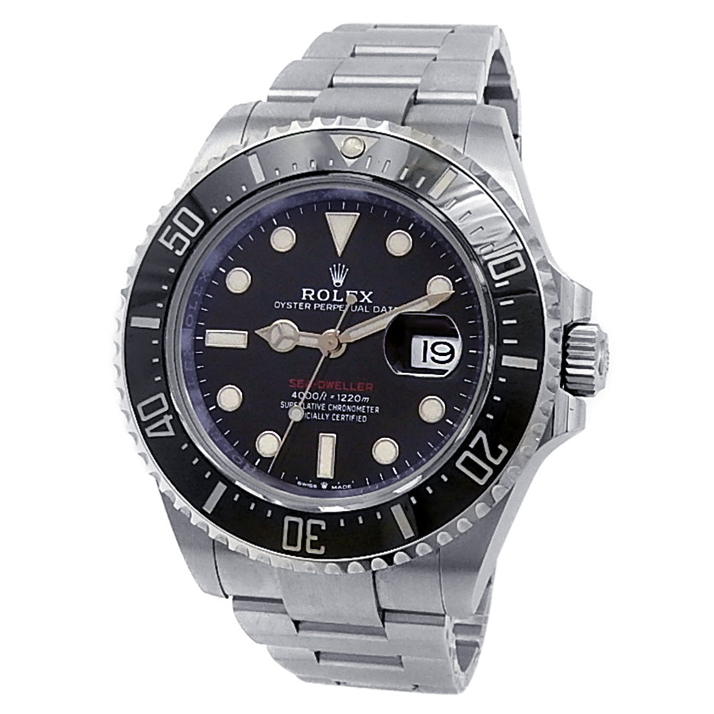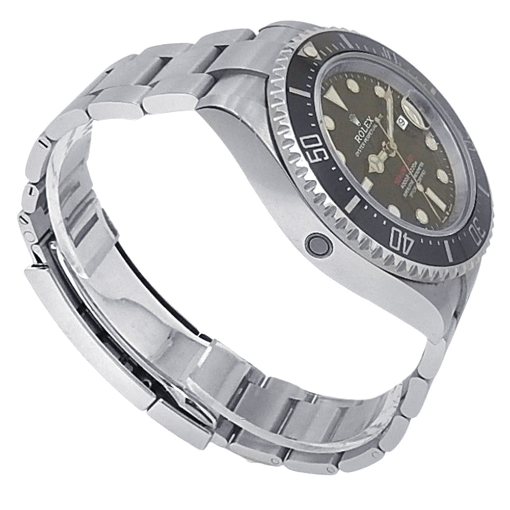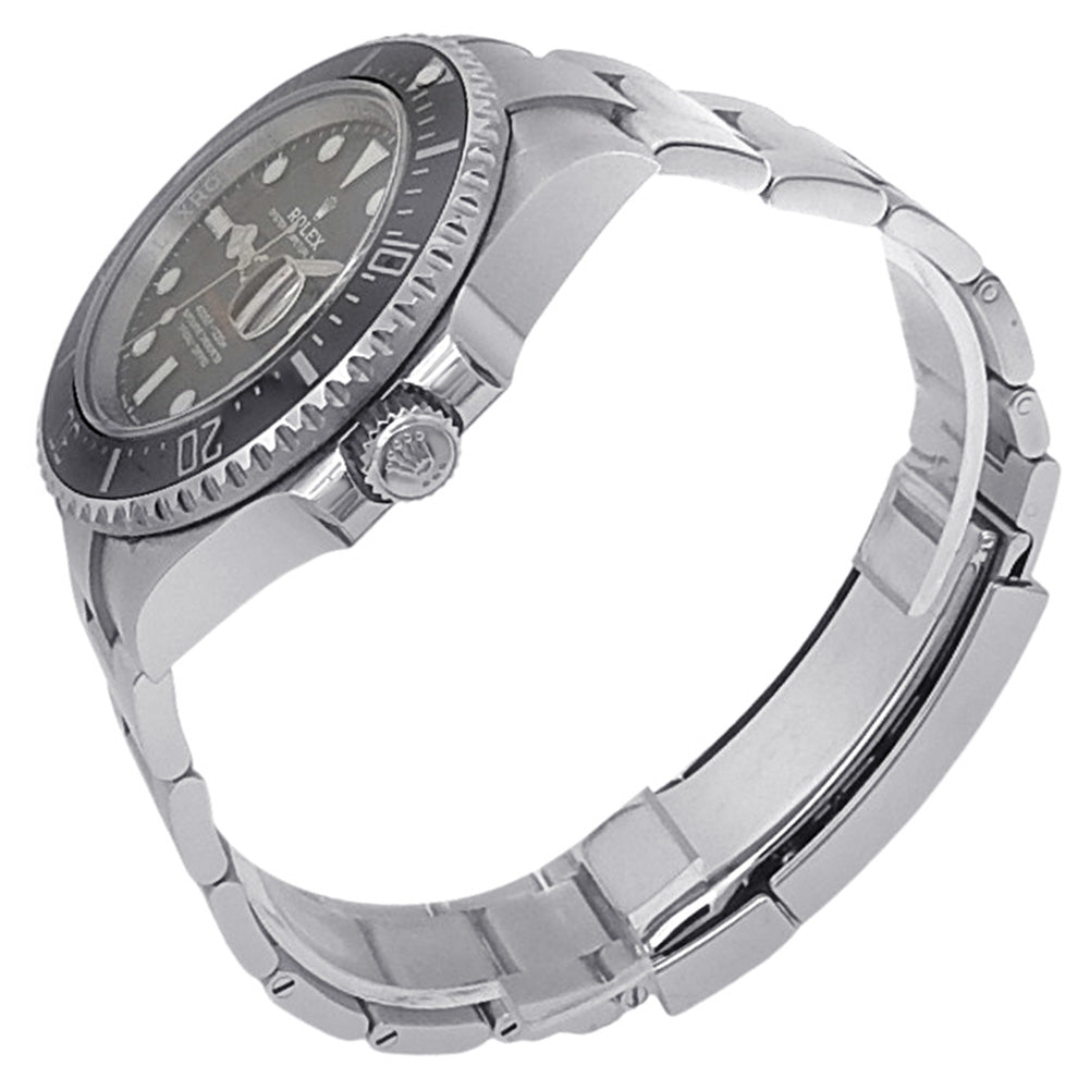 Pre-Owned Watch. Rolex Sea-Dweller men’s watch with Stainless Steel case and Oyster bracelet. Watch has a black dial with date feature. Watch runs on automatic movement. Watch can fit up to a size 8 inch wrist. Watch has signs of wear (hairline scratches). Watch does come with box and card.