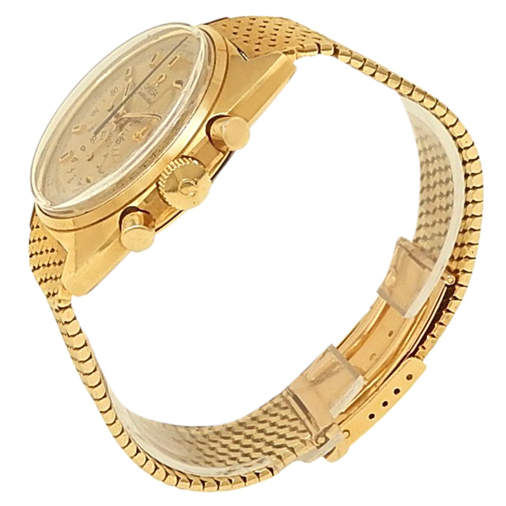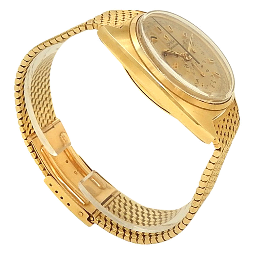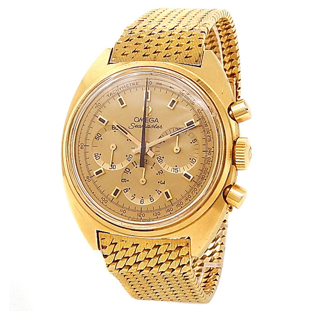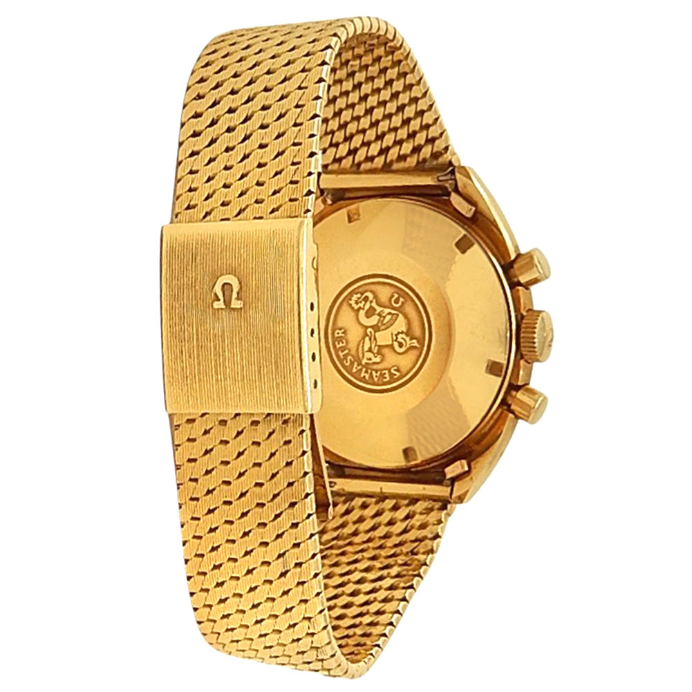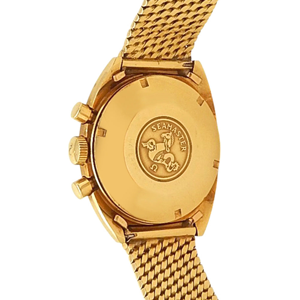 Pre-Owned Watch. Omega Seamaster Chronograph men’s watch with 18k Yellow Gold case and bracelet. Watch has a champagne dial with chronograph feature. Watch runs on manual movement. Watch can fit up to a size 7¼ inch wrist. Watch has signs of wear (hairline scratches).