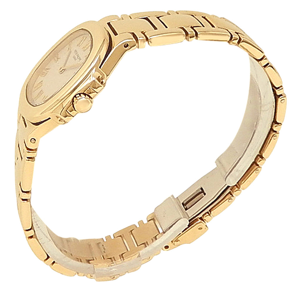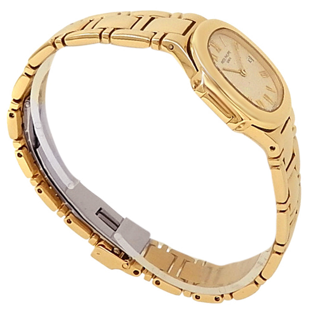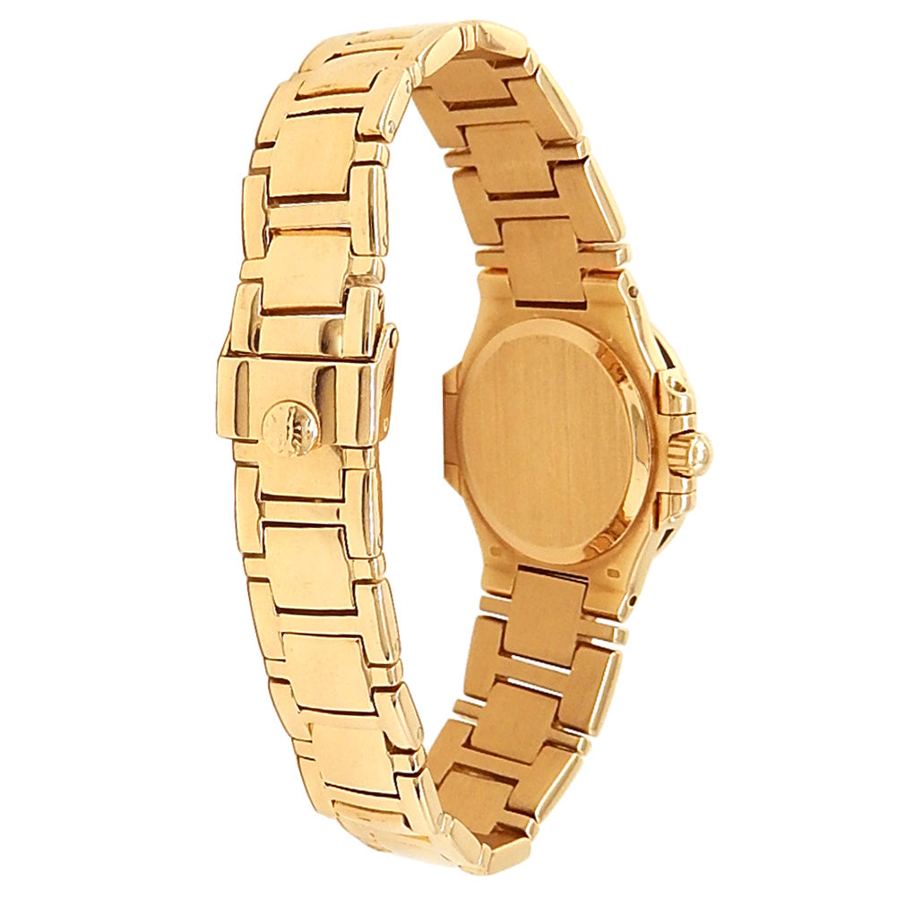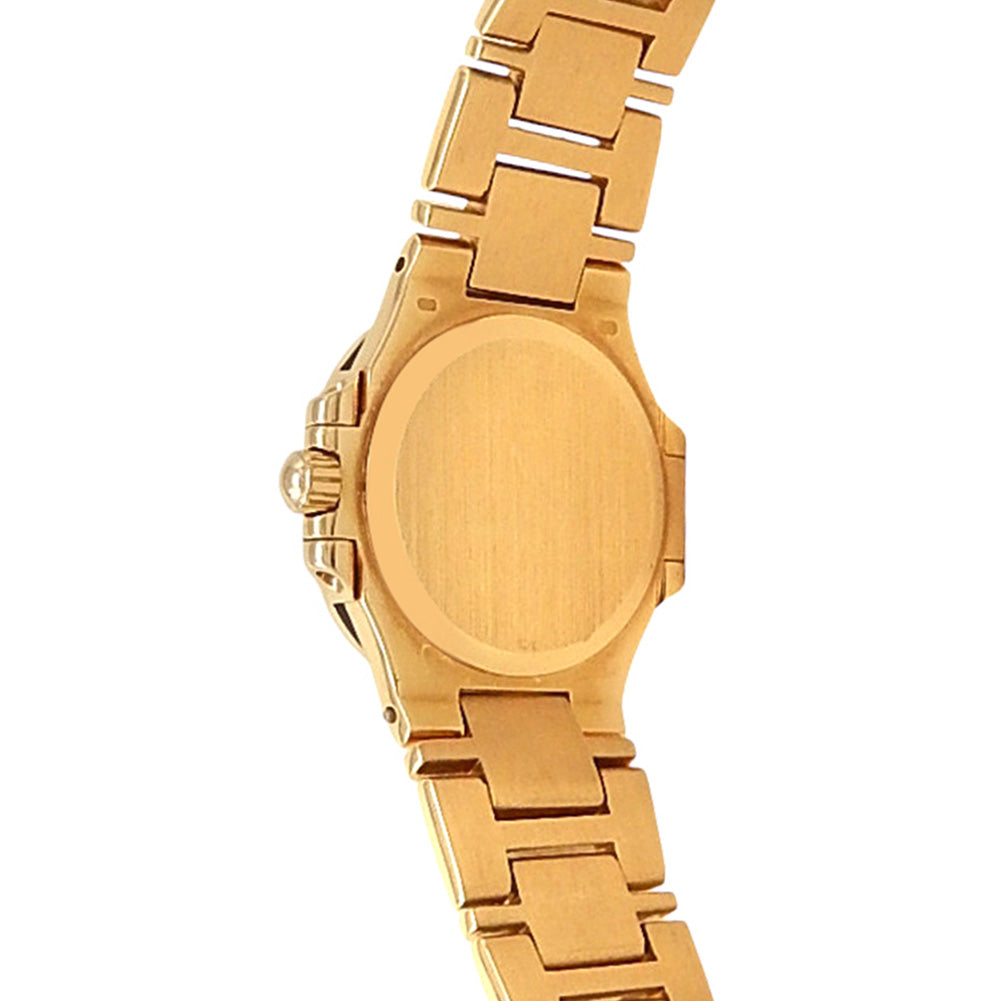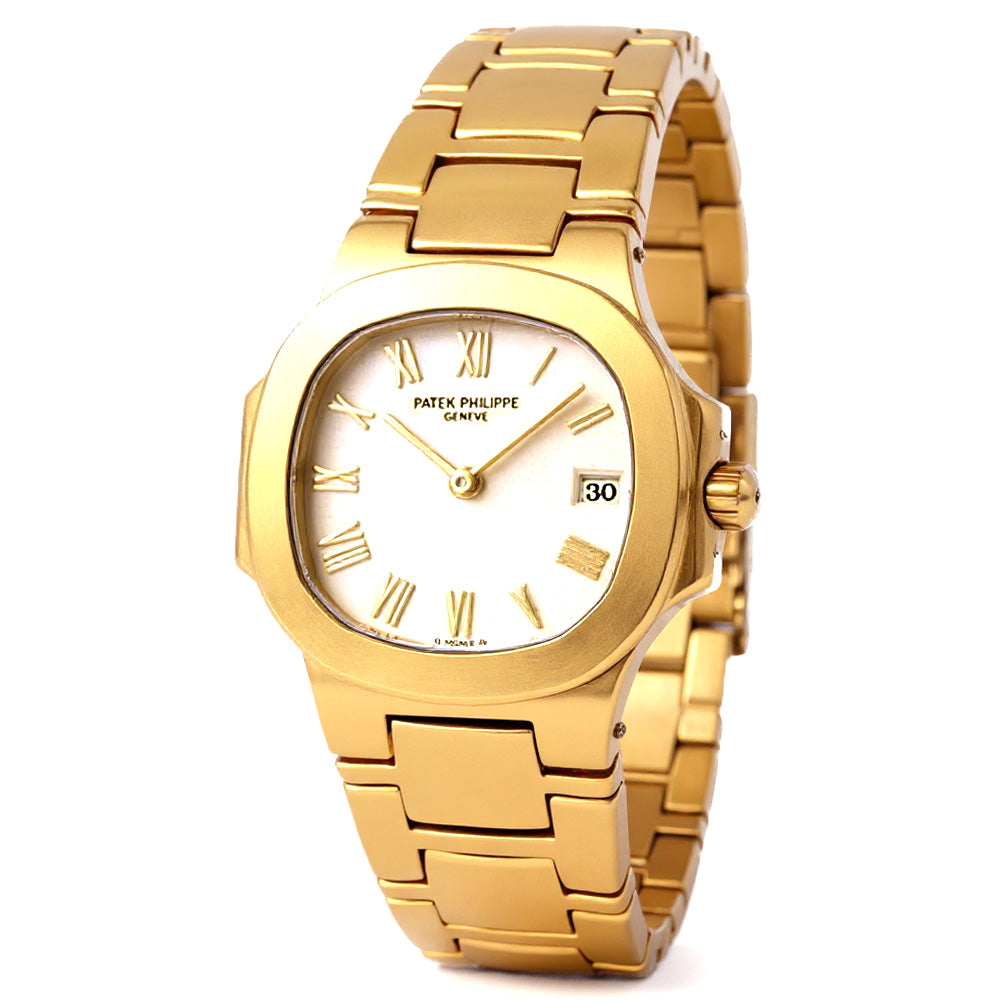 Pre-Owned Watch. Patek Philippe Nautilus ladies watch with 18k Yellow Gold case and bracelet. Watch has a white dial with date feature. Watch runs on quartz movement. Watch can fit up to a size 6½ inch wrist. Watch has signs of wear (hairline scratches).