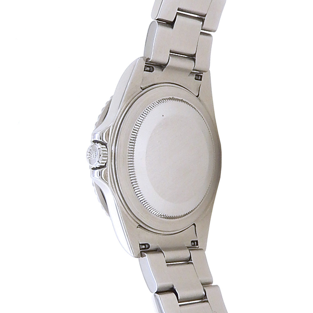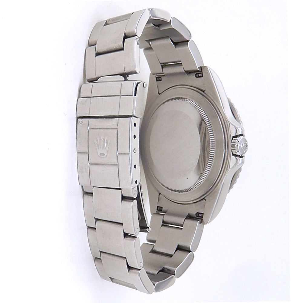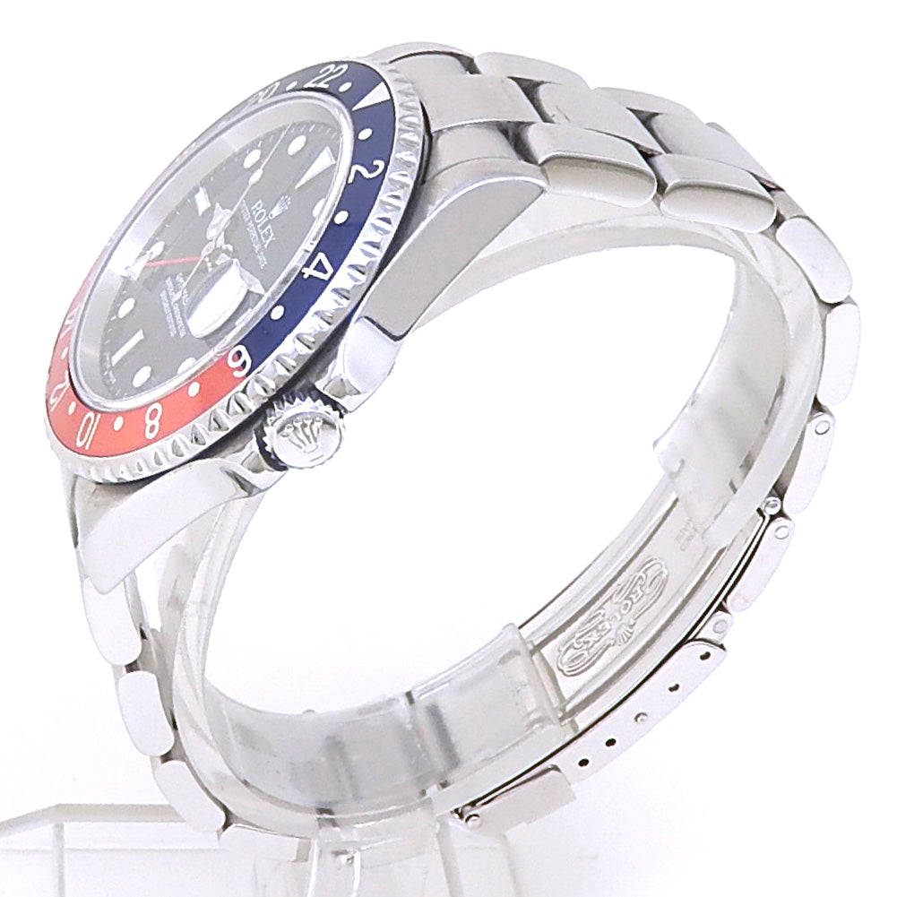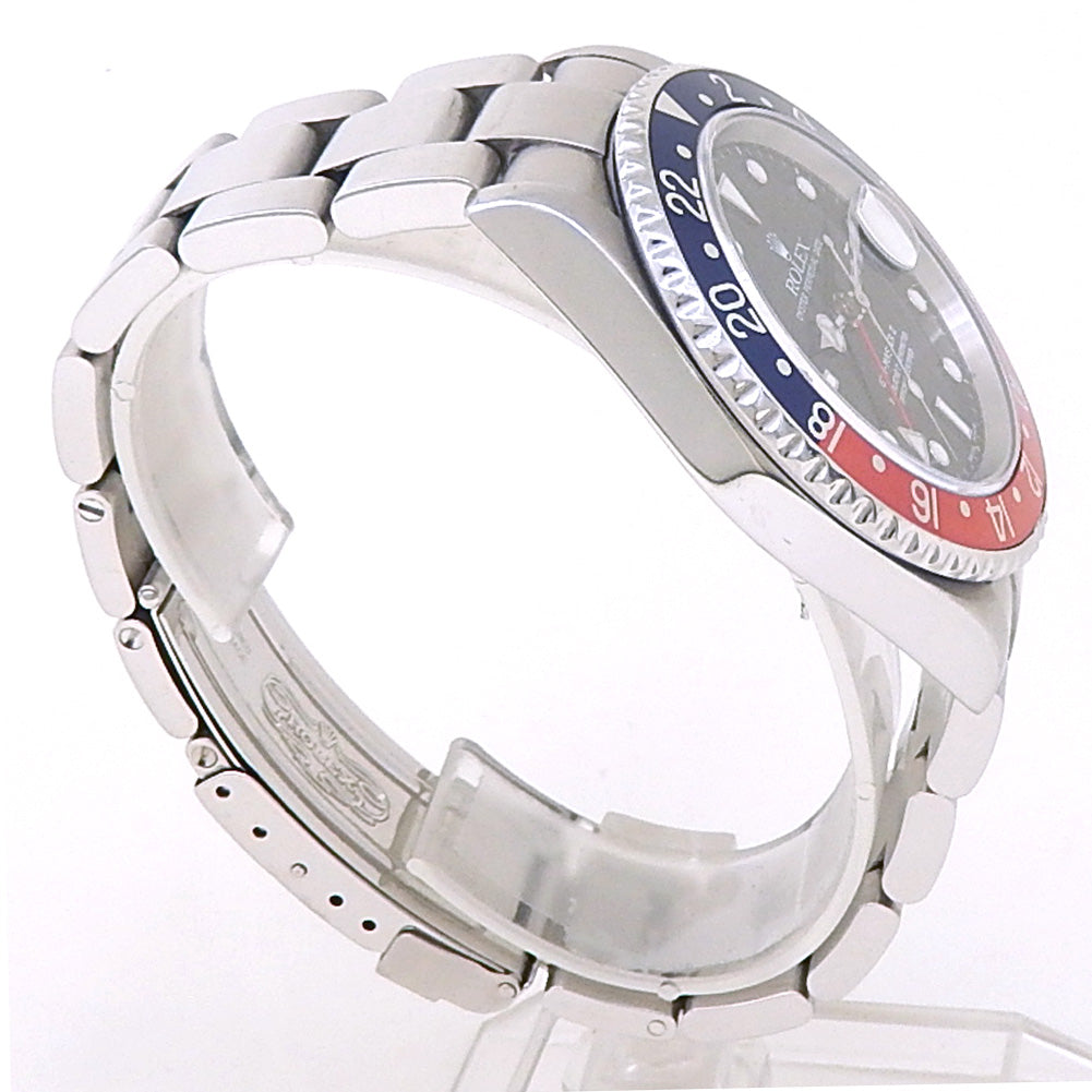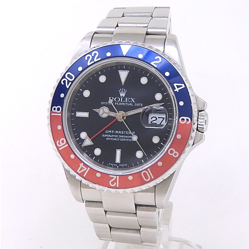 Pre-Owned Watch. Rolex GMT-Master “Pepsi” men’s watch circa 2004 with Stainless Steel case and Oyster bracelet. Watch has a black dial with date feature and pepsi bezel. Watch runs on automatic movement. Watch can fit up to a size 7 inch wrist. Watch has signs of wear (hairline scratches). Watch does come with box and papers.