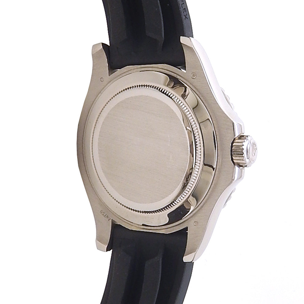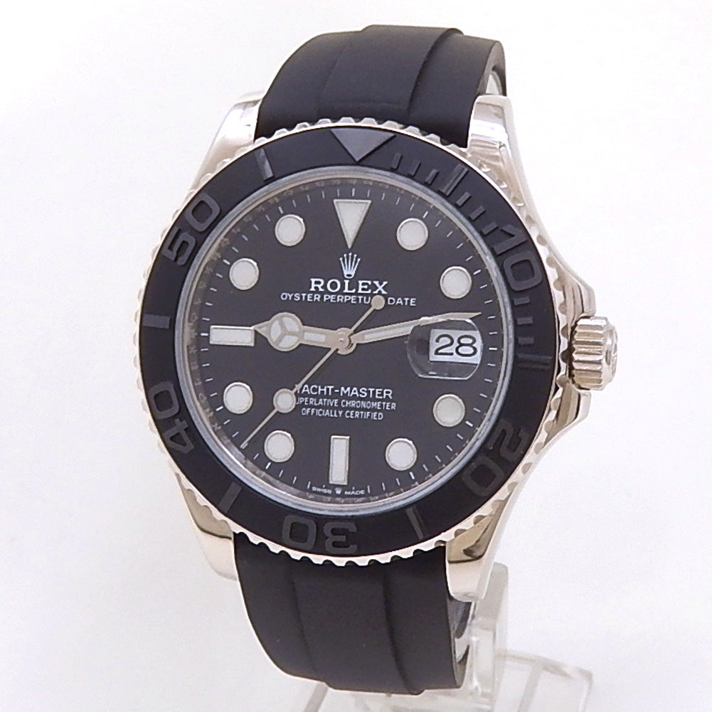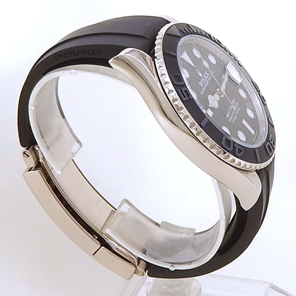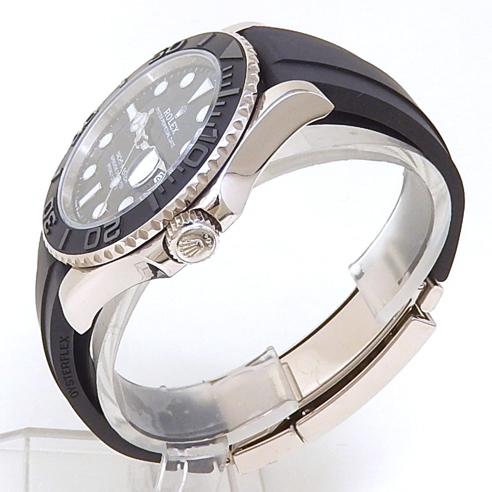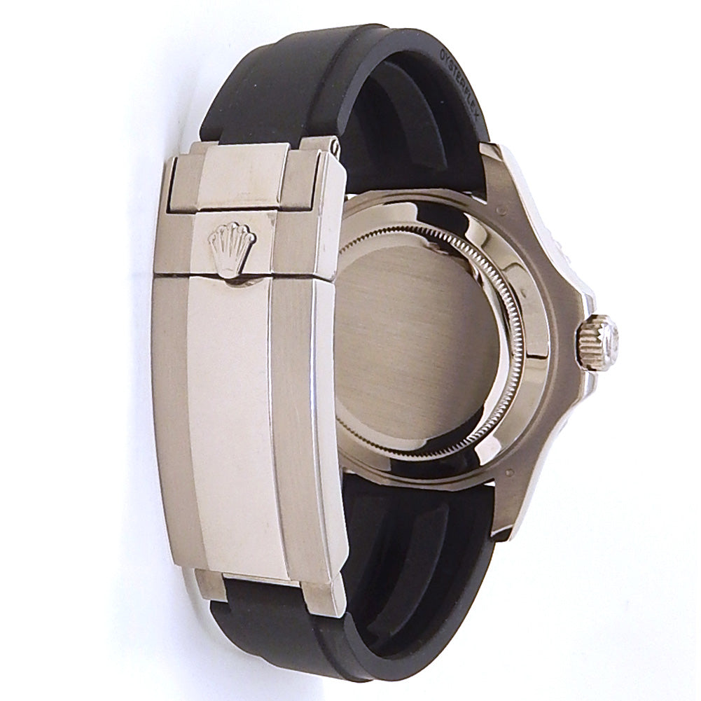 Pre-Owned Watch. Rolex Yacht-Master men’s watch with 18k White Gold case and Black Oysterflex Rubber strap. Watch has a black dial with date feature. Watch runs on automatic movement. Watch can fit up to a size 7 inch wrist. Watch has signs of wear (hairline scratches). Watch does come with box and card.