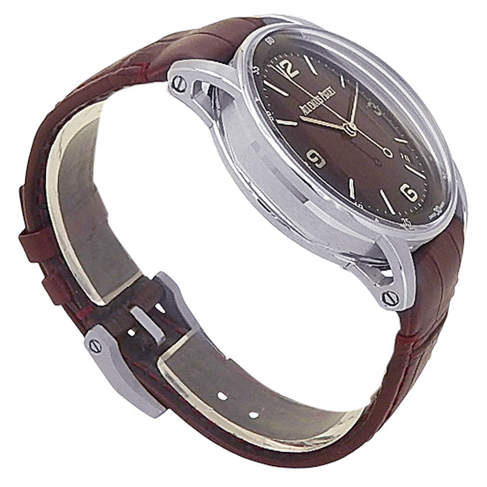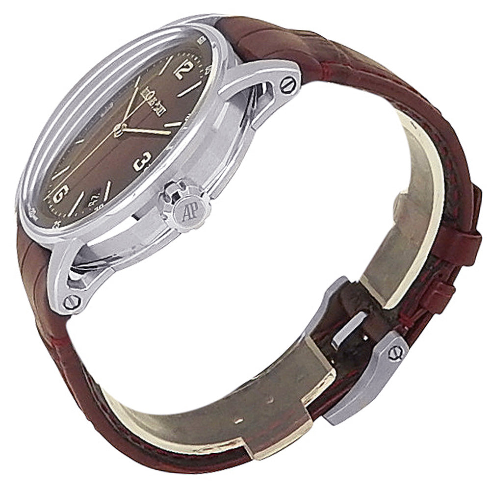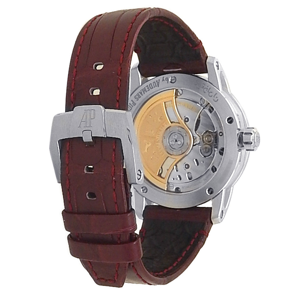 Pre-Owned Watch. Audemars Piguet Code 11.59 men's watch with 18k White Gold case and Burgundy Leather strap. Watch has a smoked lacquered burgundy with sunburst pattern base dial with date feature. Watch runs on automatic movement. Watch has signs of wear (hairline scratches).
