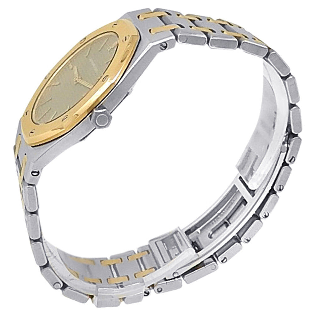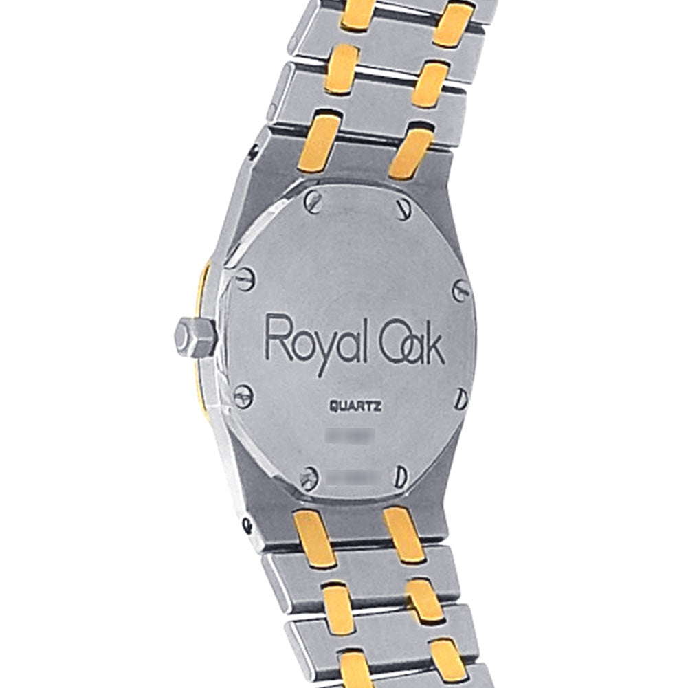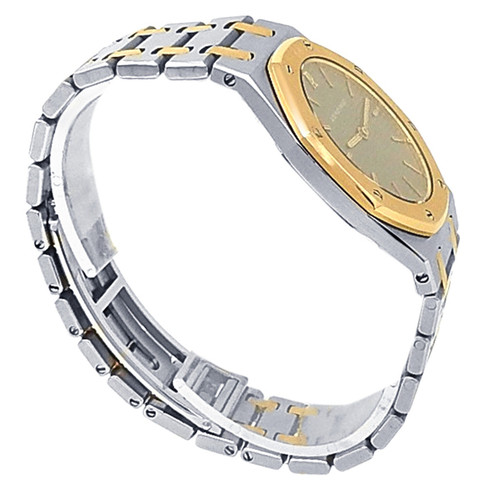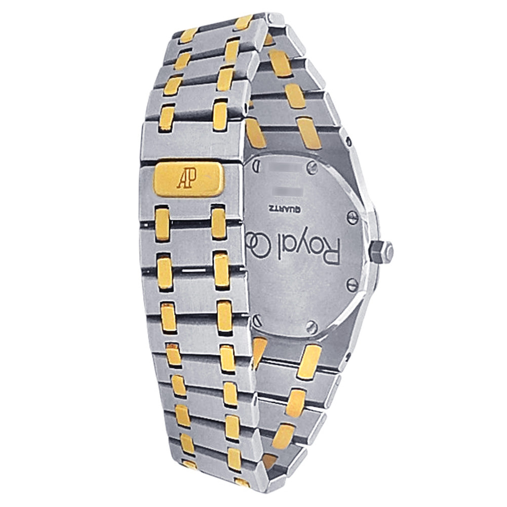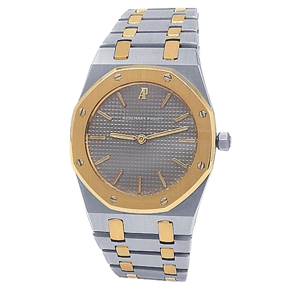 Pre-Owned Watch. Audemars Piguet Royal Oak men’s watch with 18k Yellow Gold & Stainless Steel case and bracelet. Watch has a grey dial. Watch runs on quartz movement. Watch can fit up to a size 6½ inch wrist. Watch has signs of wear (hairline scratches).