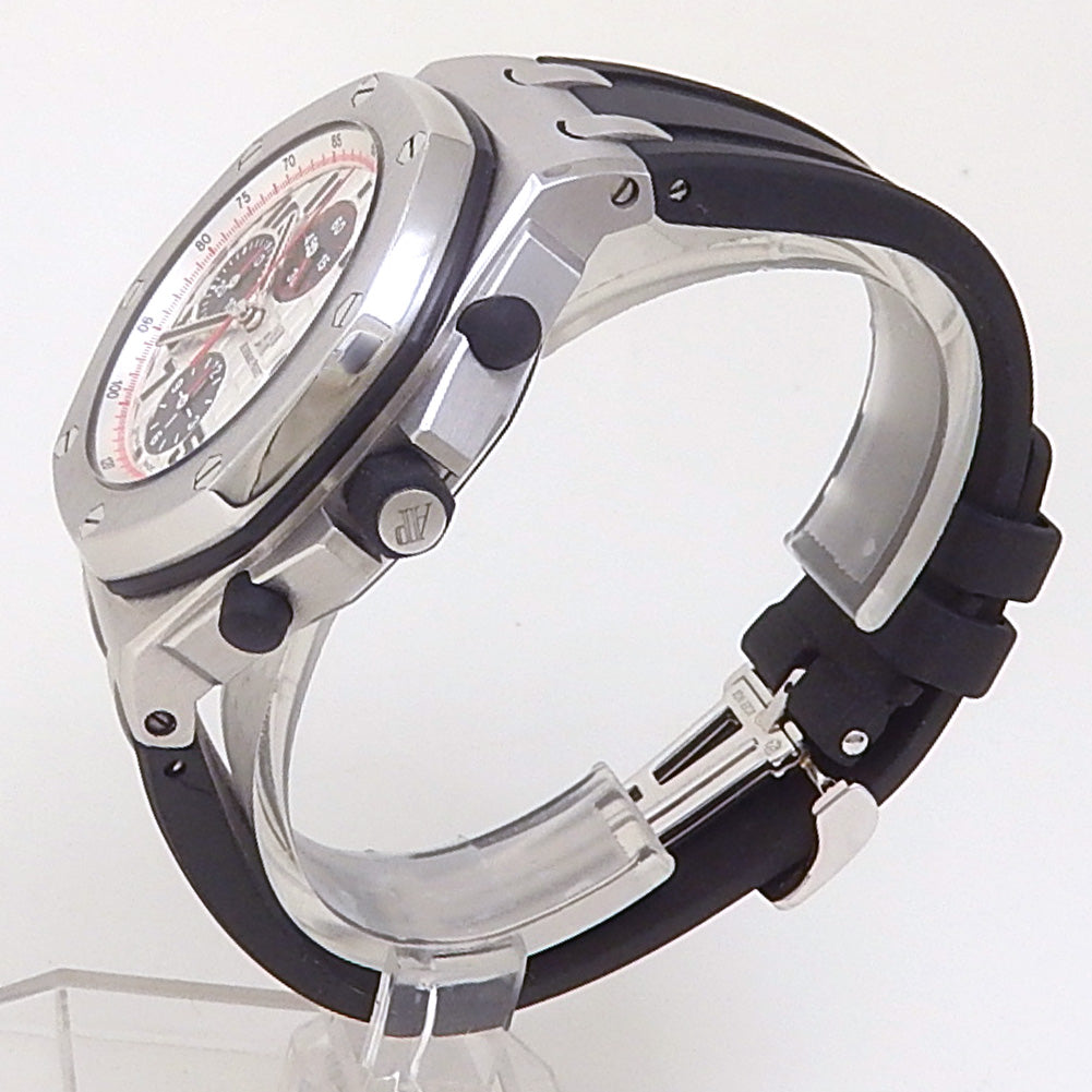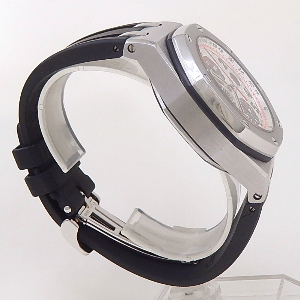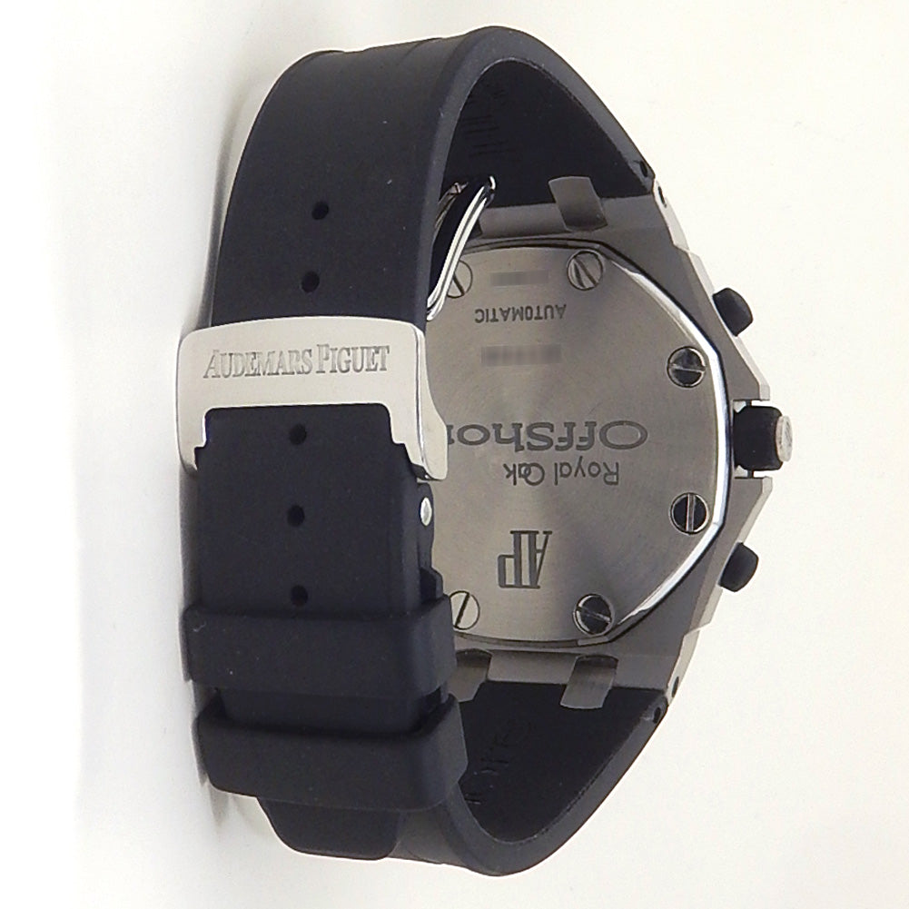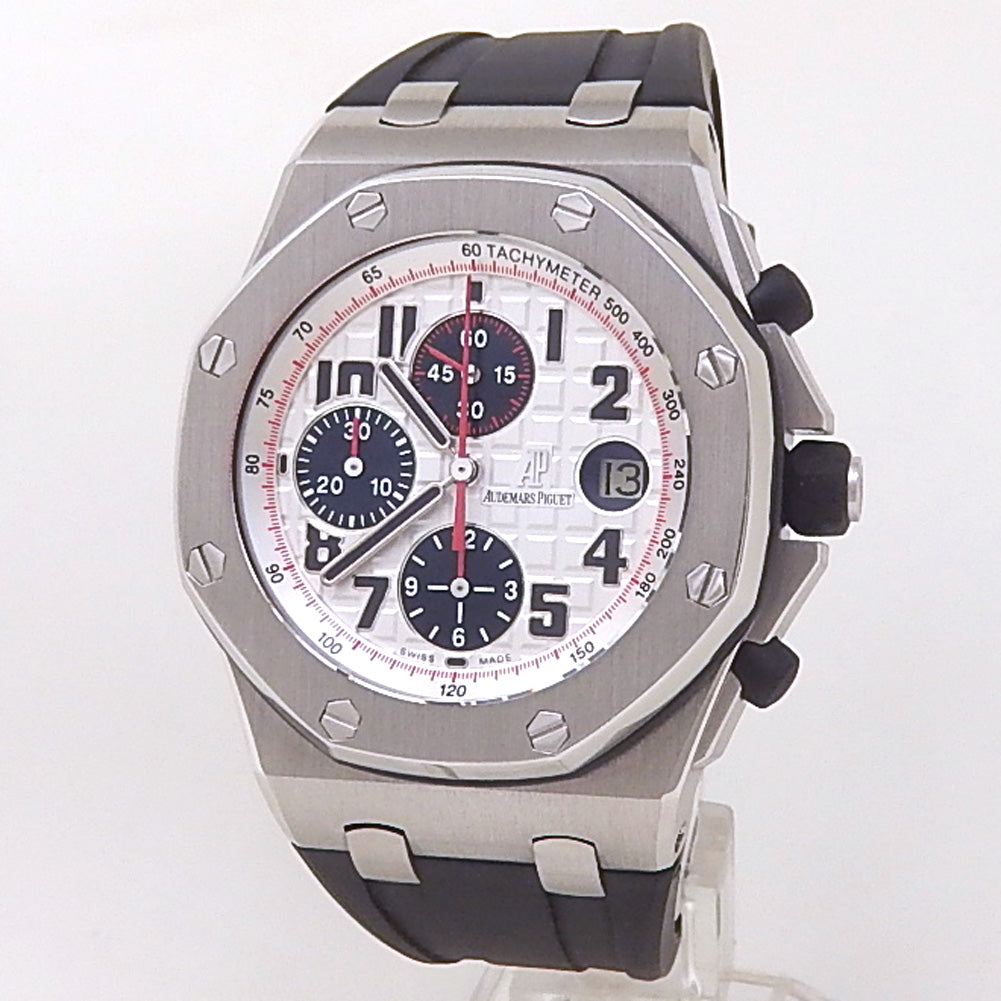 Pre-Owned Watch. Audemars Piguet Royal Oak Offshore men’s watch with Stainless Steel case and Black Rubber strap. Watch has a silver dial with date and chronograph features. Watch runs on automatic movement. Watch has signs of wear (hairline scratches).