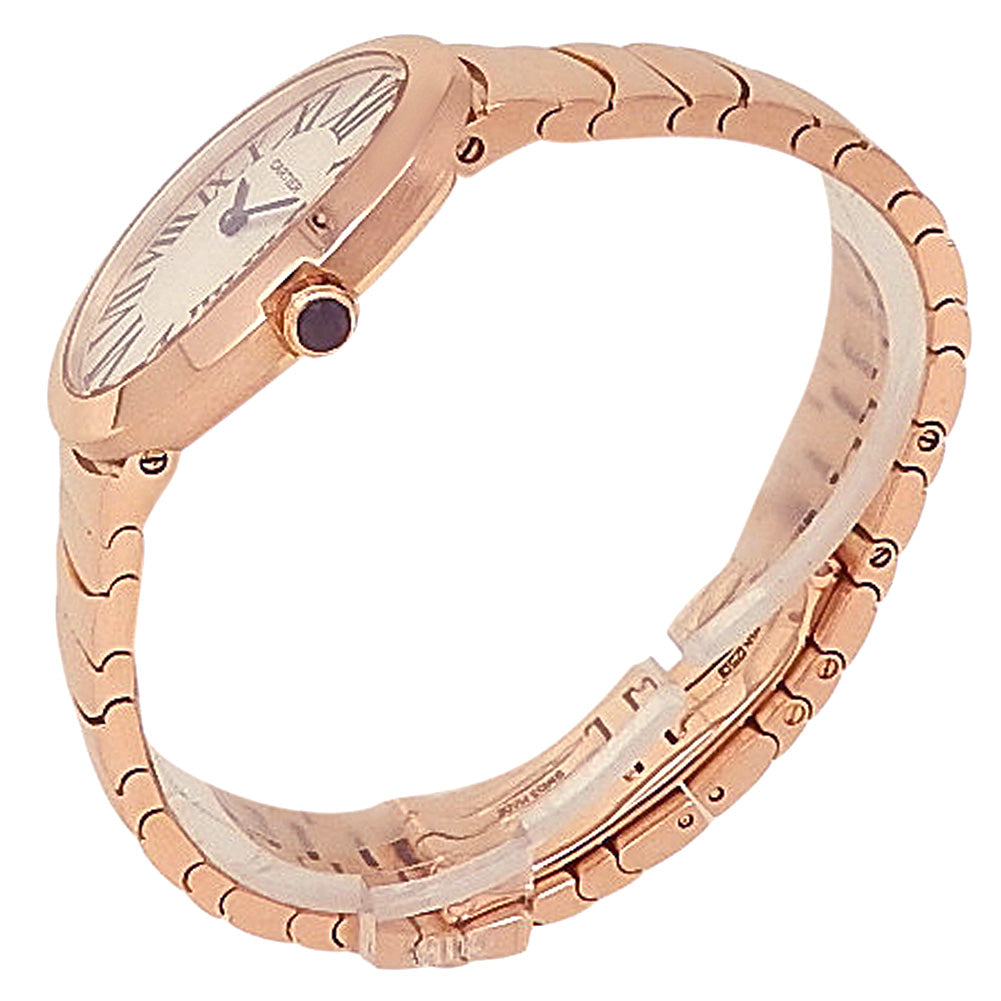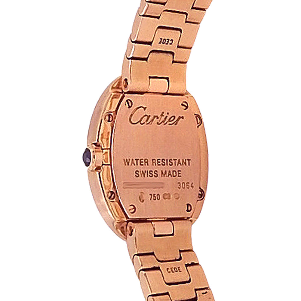 Pre-Owned Watch. Cartier Baignoire Small ladies watch with 18k Rose Gold case and bracelet. Watch has a silver dial. Watch runs on quartz movement. Watch can fit up to a size 6 inch wrist. Watch has signs of wear (hairline scratches). Watch does come with box and papers