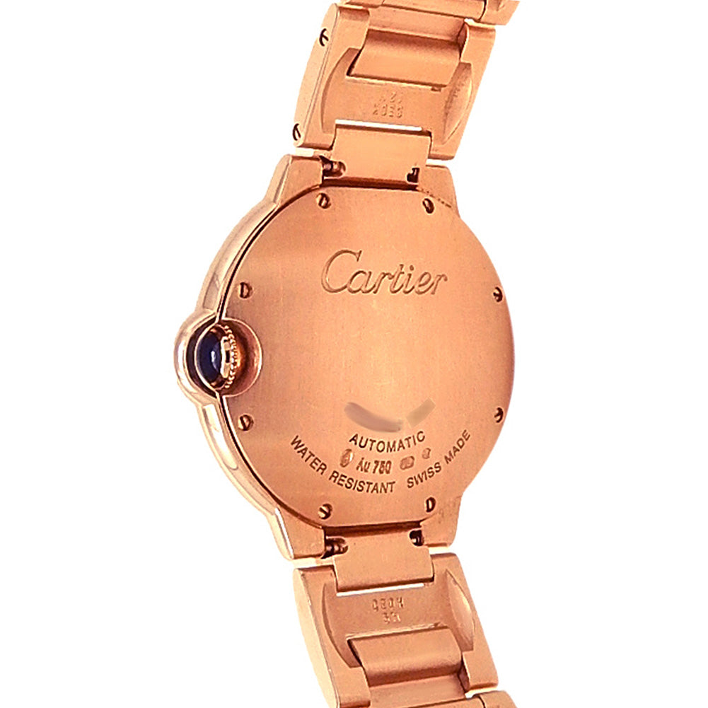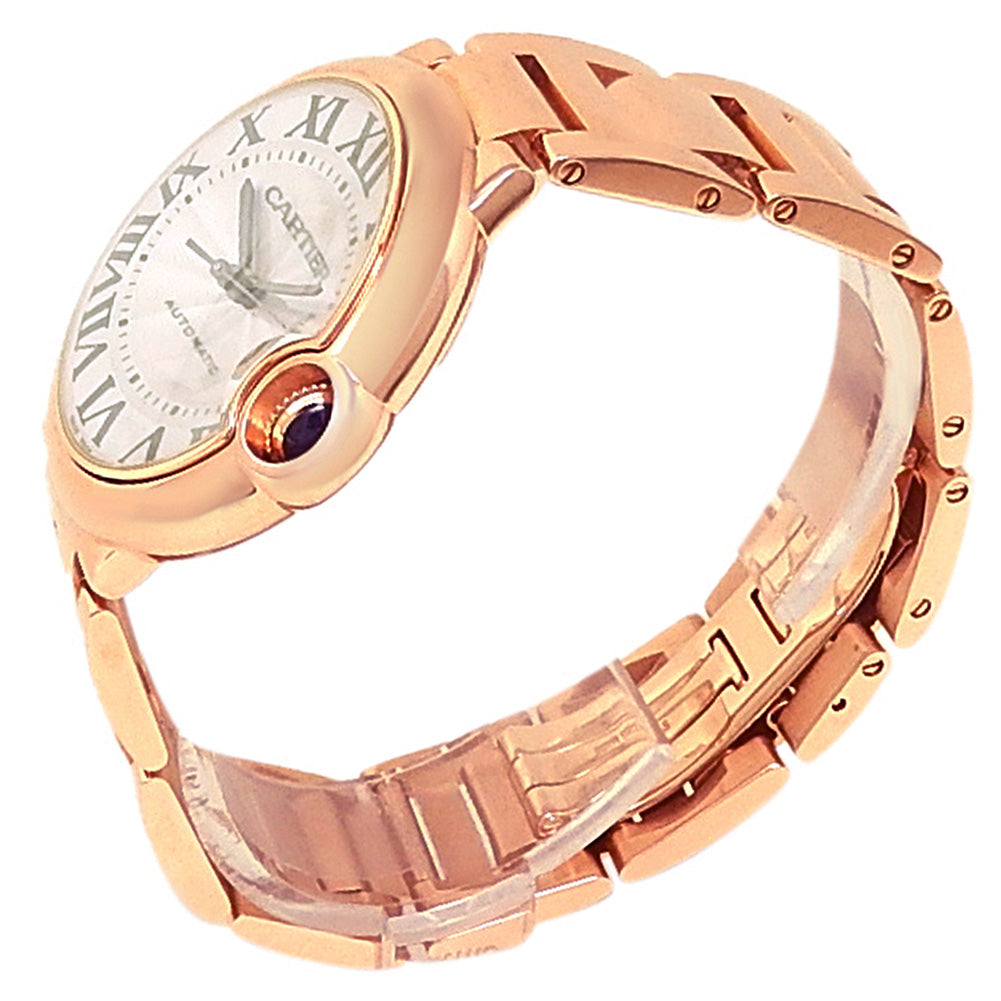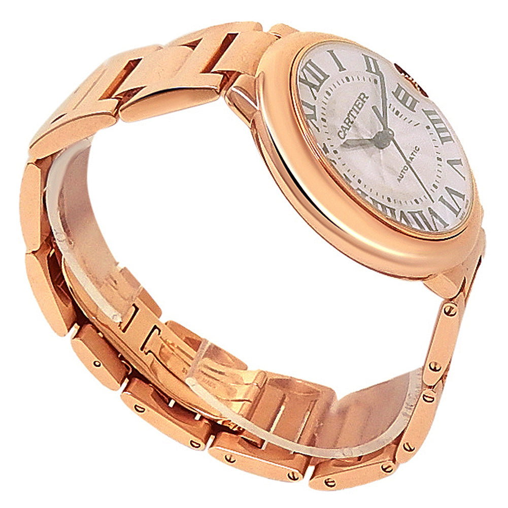 Pre-Owned Watch. Cartier Ballon Bleu ladies watch with 18k Rose Gold case and bracelet. Watch has a silver dial. Watch runs on automatic movement. Watch can fit up to a size 6½ inch wrist. Watch has signs of wear (hairline scratches).