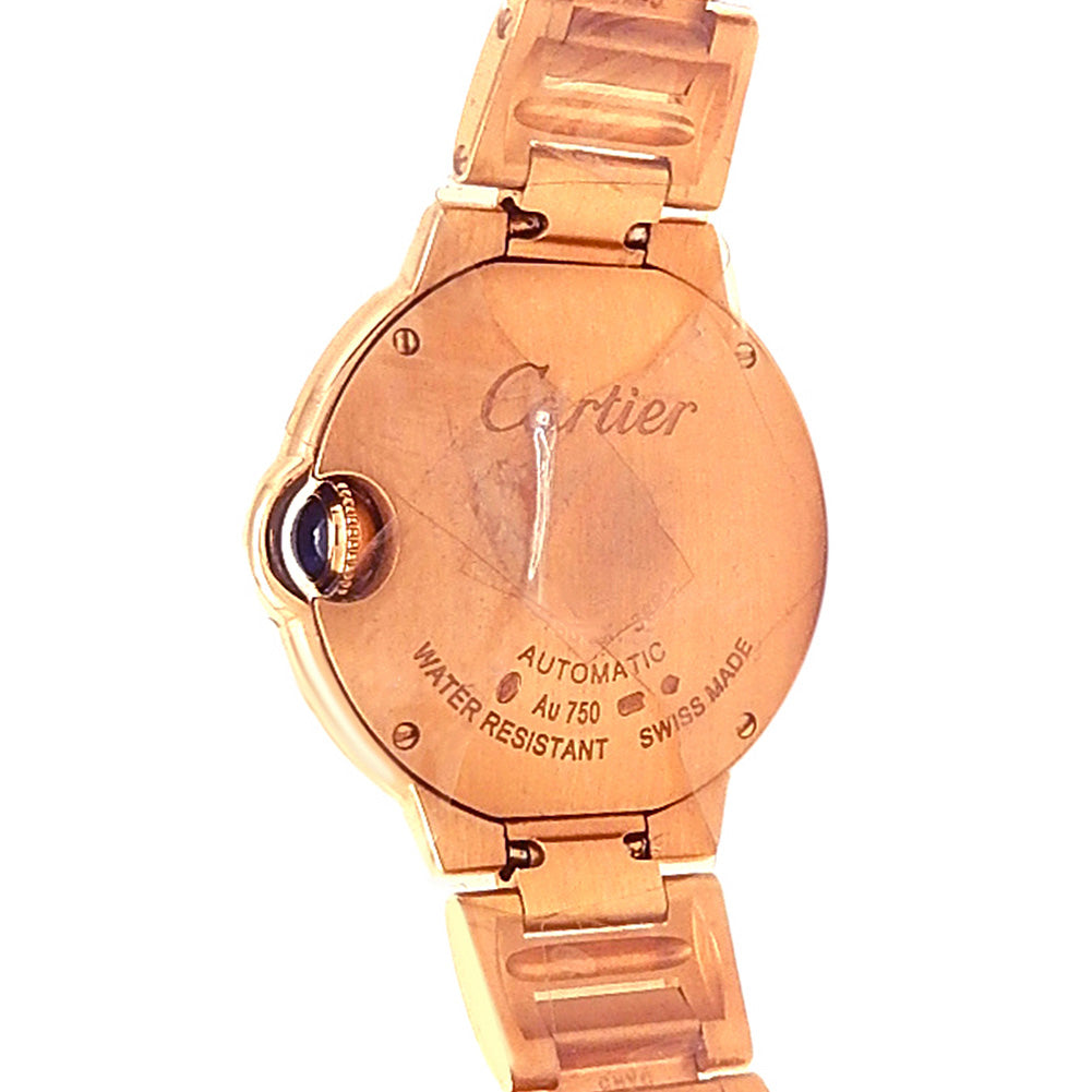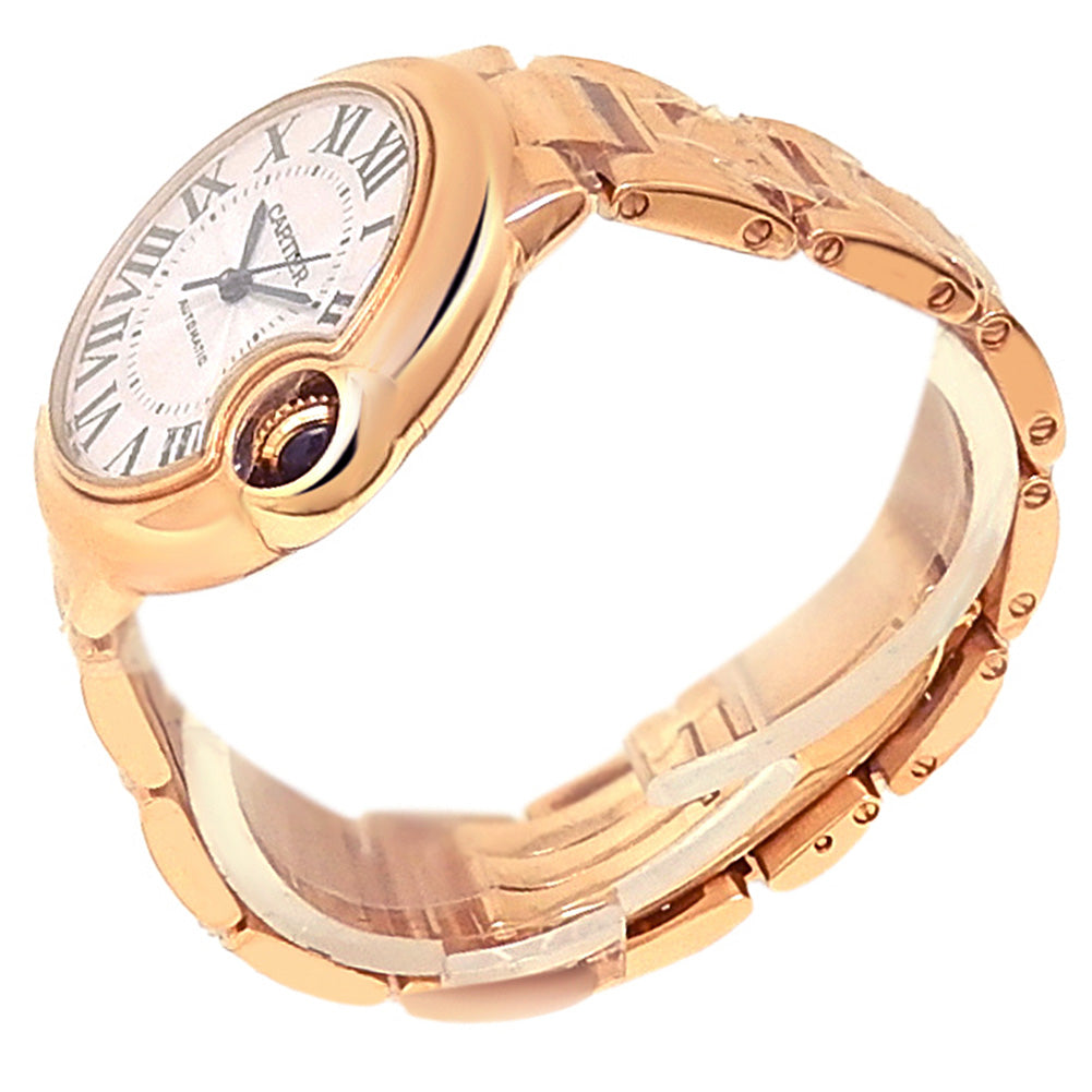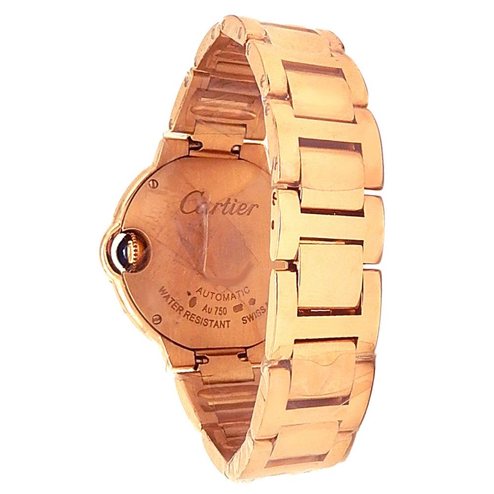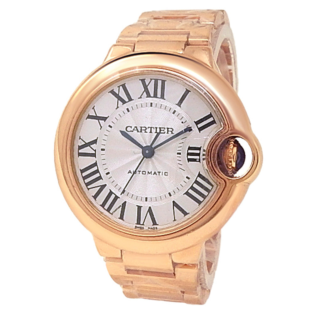 Pre-Owned Watch. Cartier Ballon Bleu ladies watch with 18k Rose Gold case and bracelet. Watch has a silver dial. Watch runs on automatic movement. Watch can fit up to a size 6 inch wrist. Watch has signs of wear (hairline scratches). Watch does come with card.