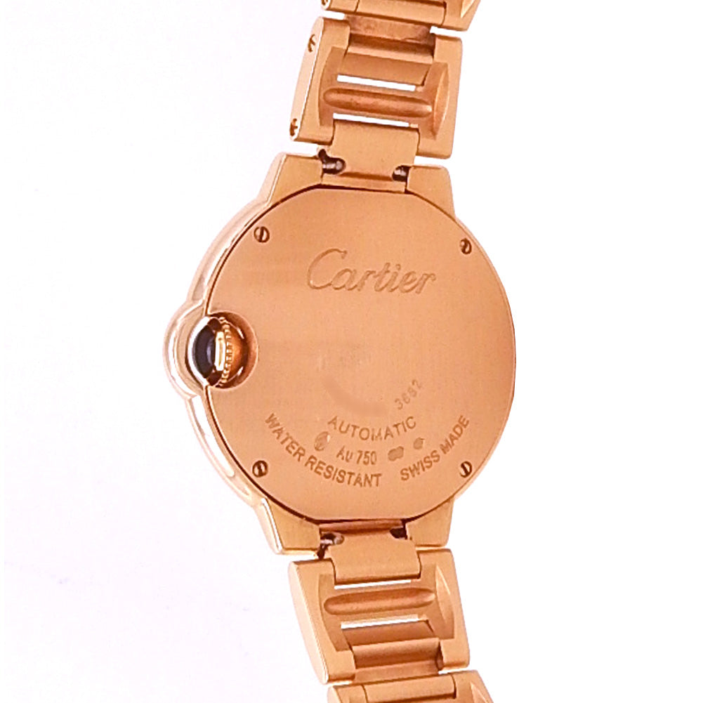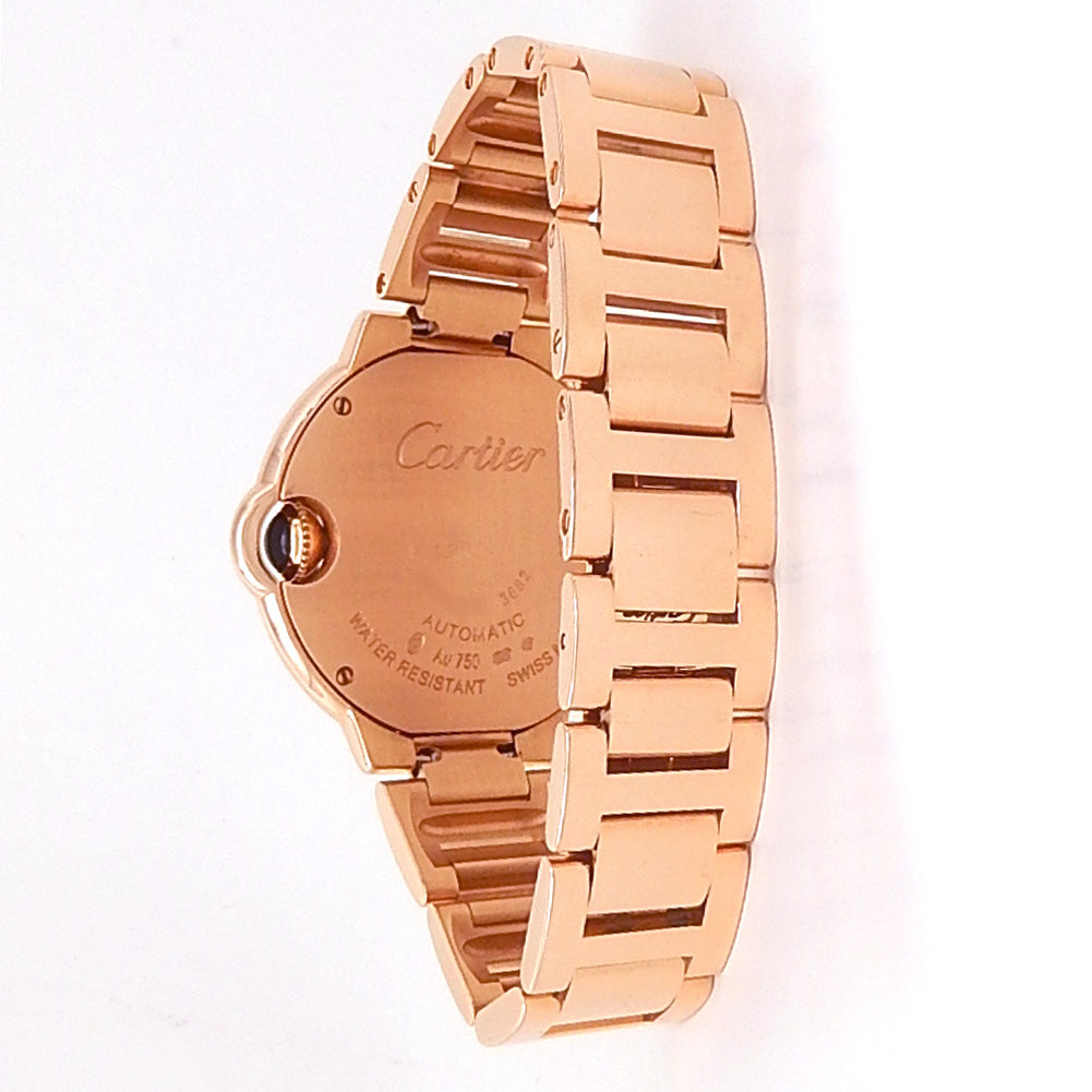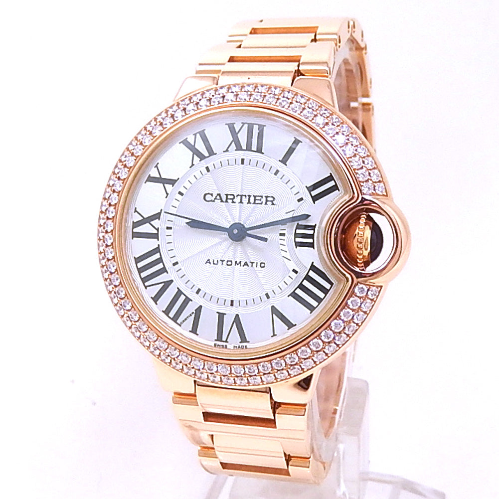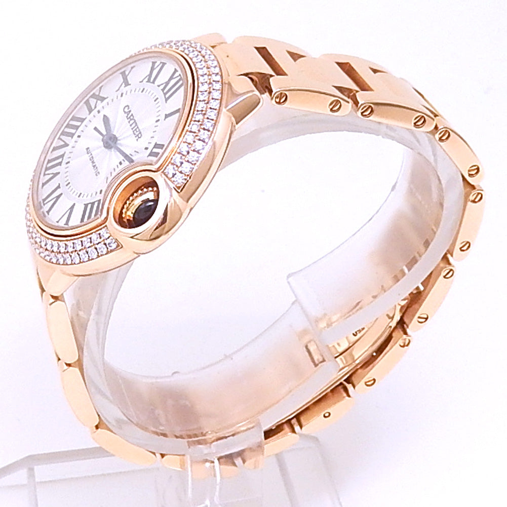 Pre-Owned Watch. Cartier Ballon Bleu ladies watch with 18k Rose Gold case and bracelet. Watch has a silver dial with diamonds bezel. Watch runs on automatic movement. Watch can fit up to a size 6¼ inch wrist. Watch has signs of wear (hairline scratches). Watch does come with box and papers.