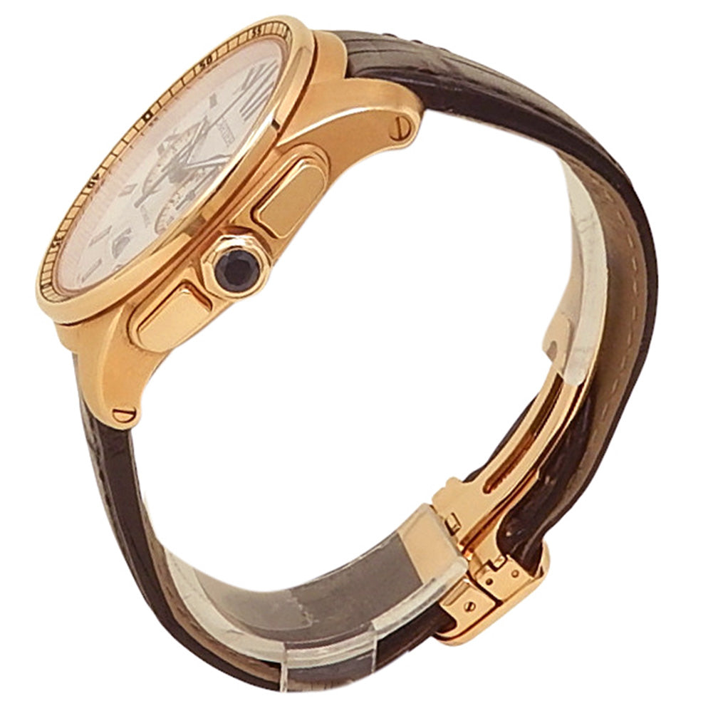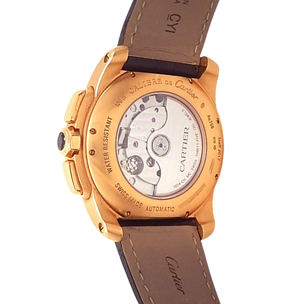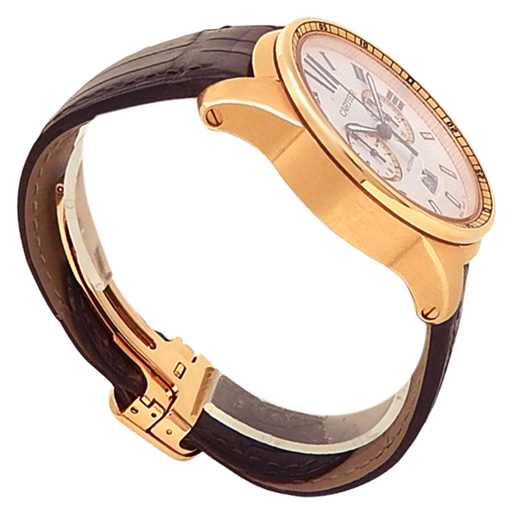 Pre-Owned Watch. Cartier Calibre de Cartier men’s watch with 18k Rose Gold case and Brown Leather strap. Watch has a silver dial with date and chronograph features. Watch runs on automatic movement. Watch has signs of wear (hairline scratches).