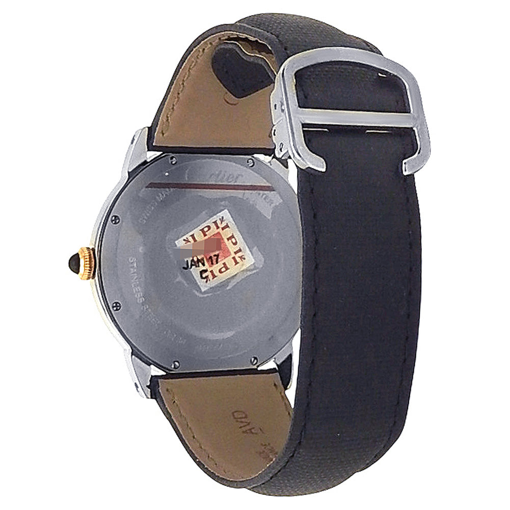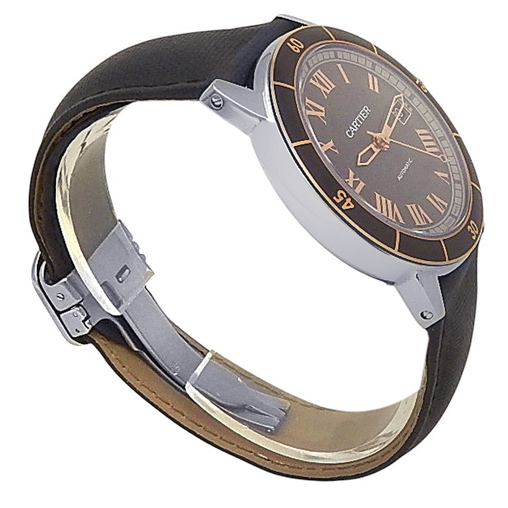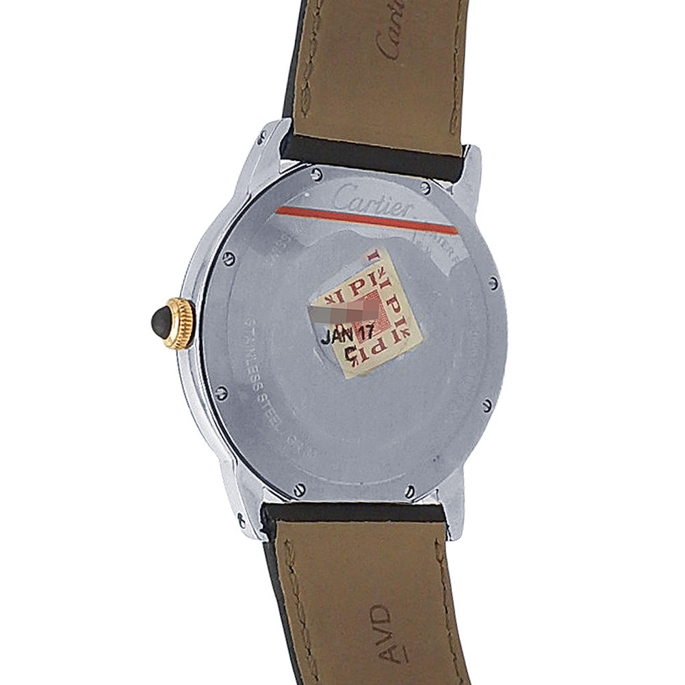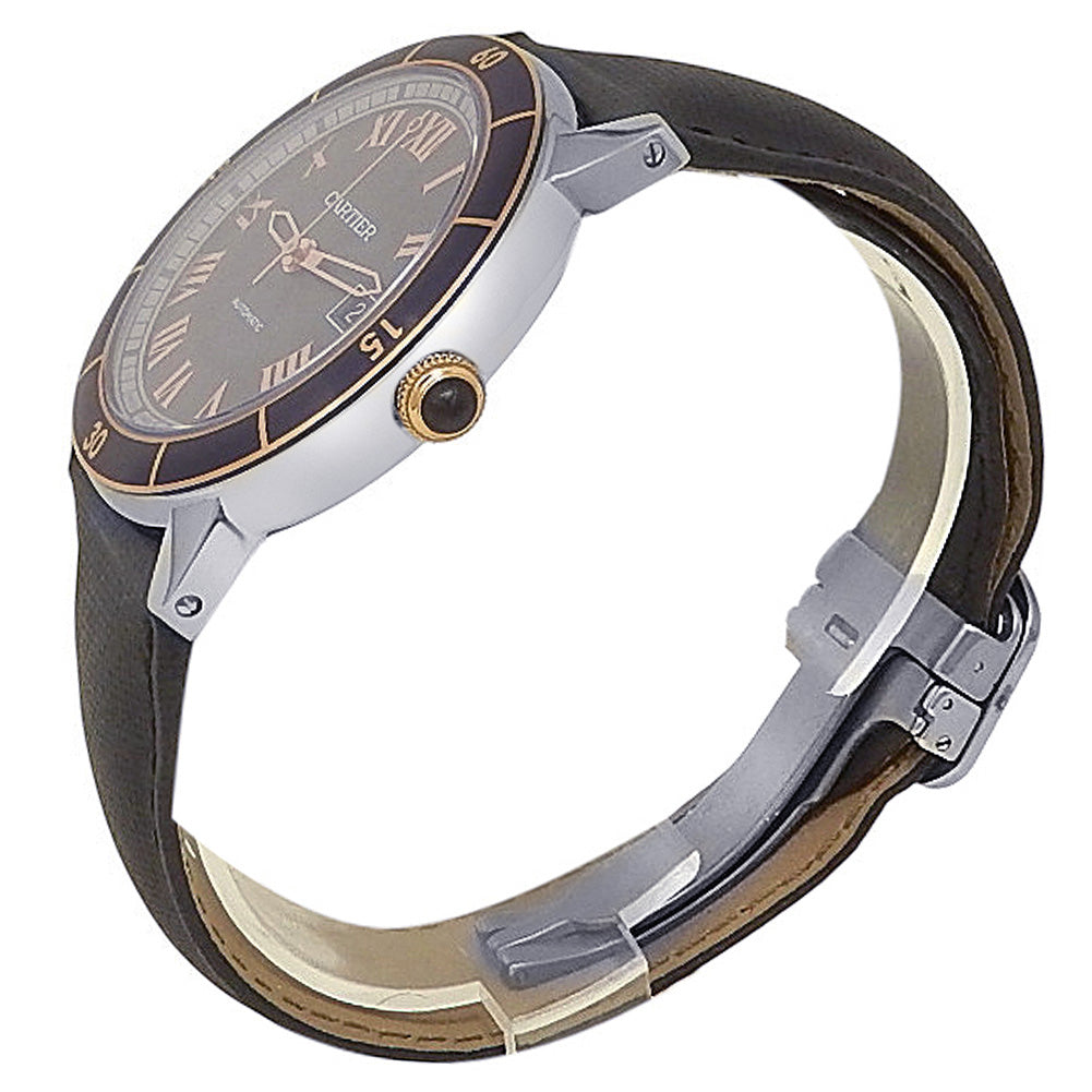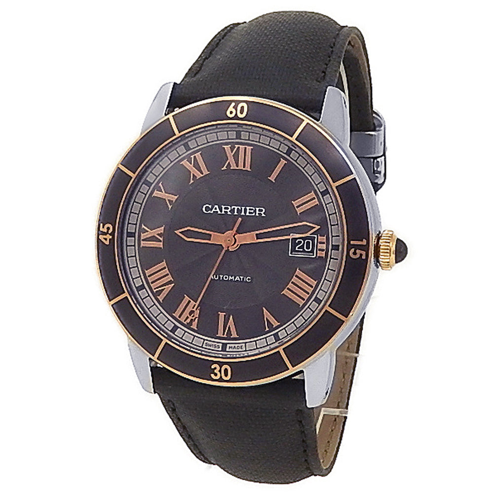 Pre-Owned Watch. Cartier Ronde Croisiere De Cartier Stainless Steel Black Leather strap. Watch has a grey dial with date feature and rose gold with black ADLC bezel. Watch runs on automatic movement. Watch has signs of wear (hairline scratches).