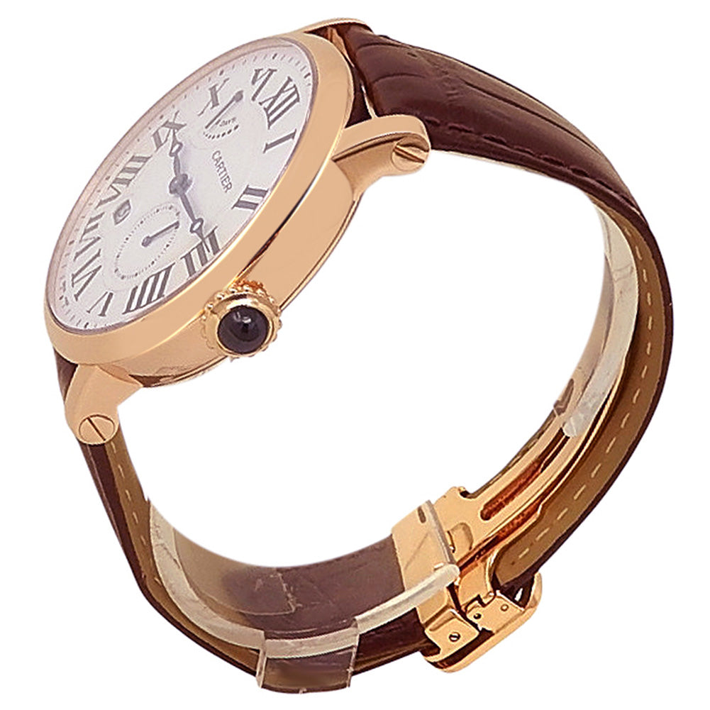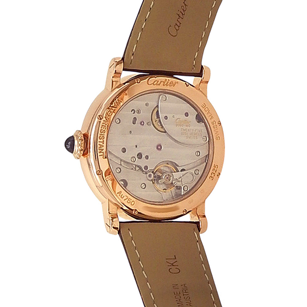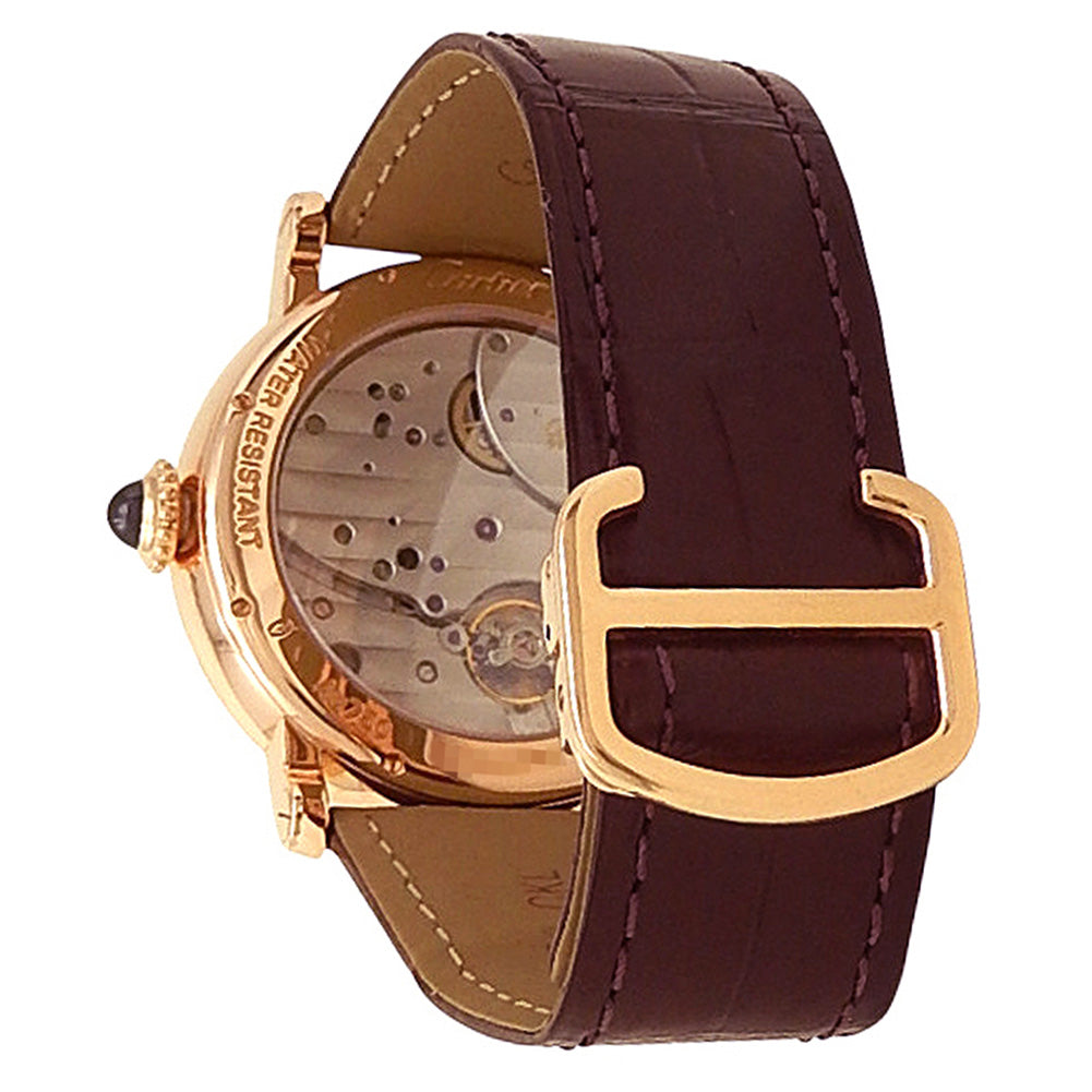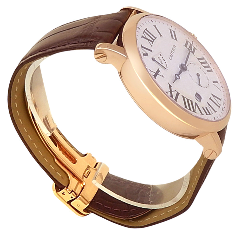 Pre-Owned Watch. Cartier Rotonde de Cartier 8 Days Power Reserve men’s watch with 18k Rose Gold case and Brown Leather strap. Watch has a silver dial with date, power reserve features and a small second subdial. Watch runs on manual movement. Watch has signs of wear (hairline scratches). Watch does come with card.