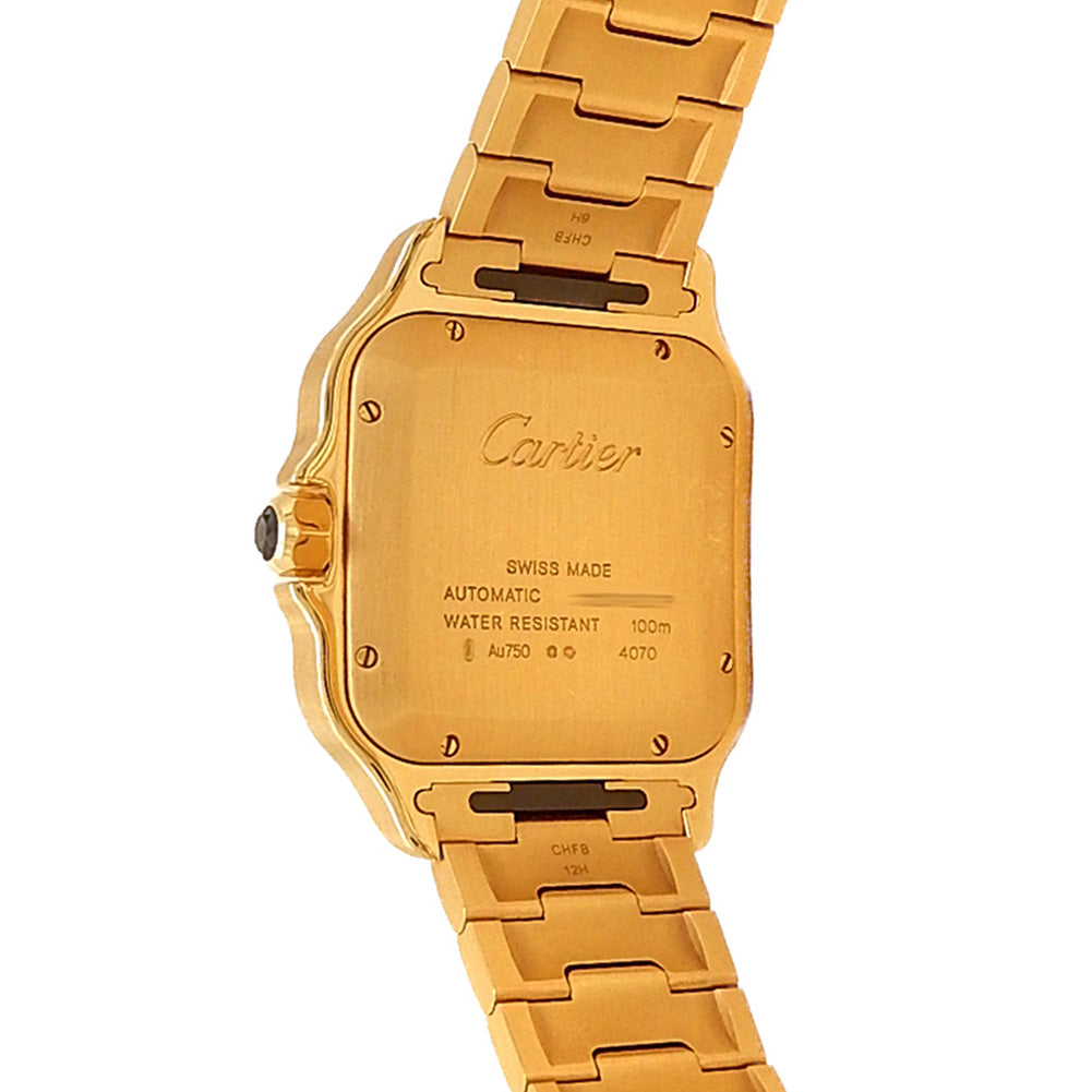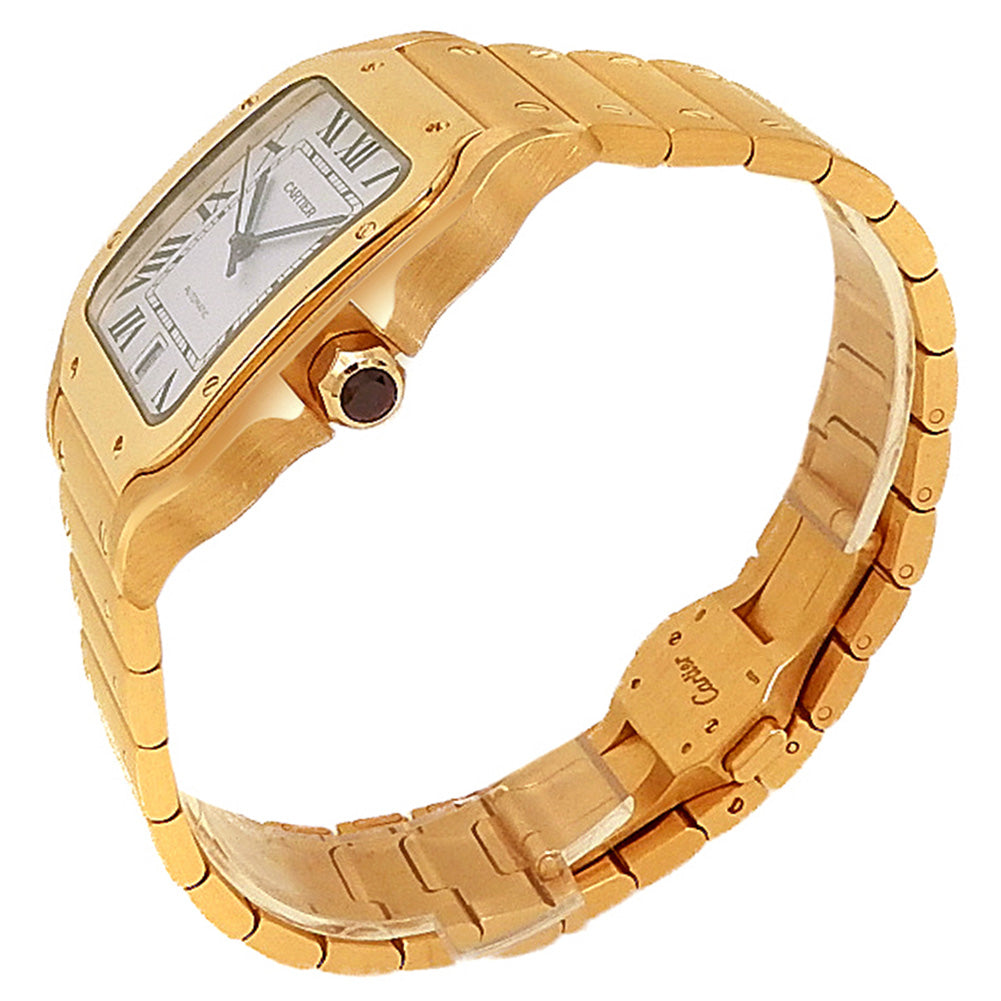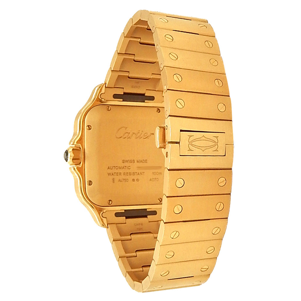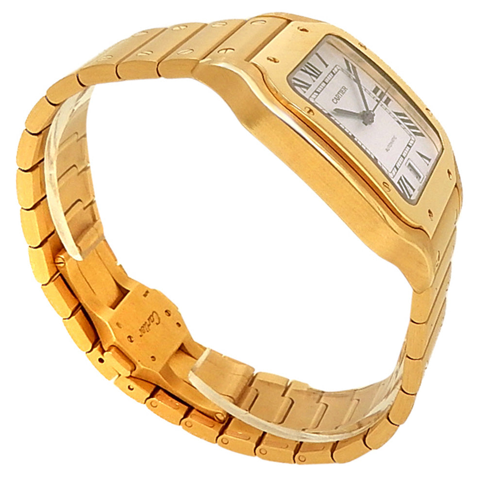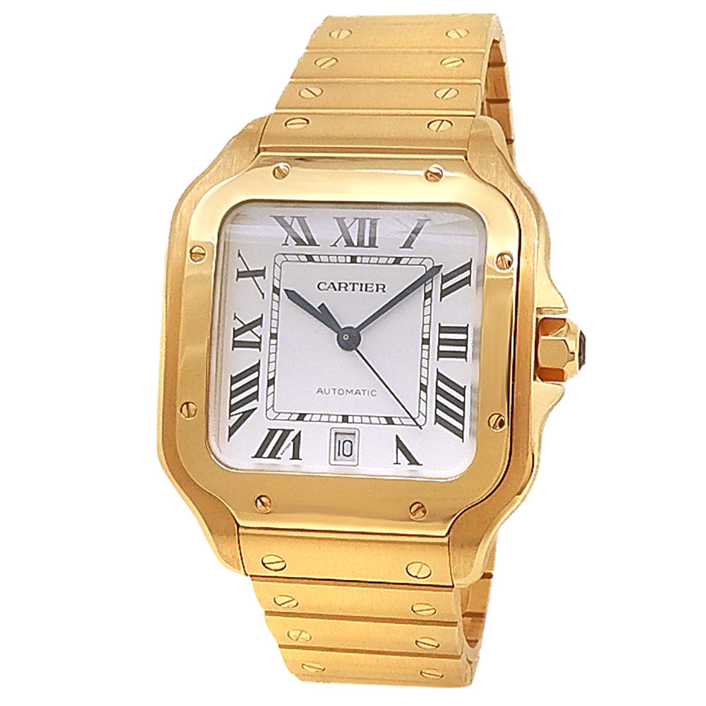 Pre-Owned Watch. Cartier Santos de Cartier men’s watch with 18k Yellow Gold case and bracelet. Watch has a silver dial with date feature. Watch runs on automatic movement. Watch can fit up to a size 7¾ inch wrist. Watch has signs of wear (hairline scratches). Watch does come with box and papers.