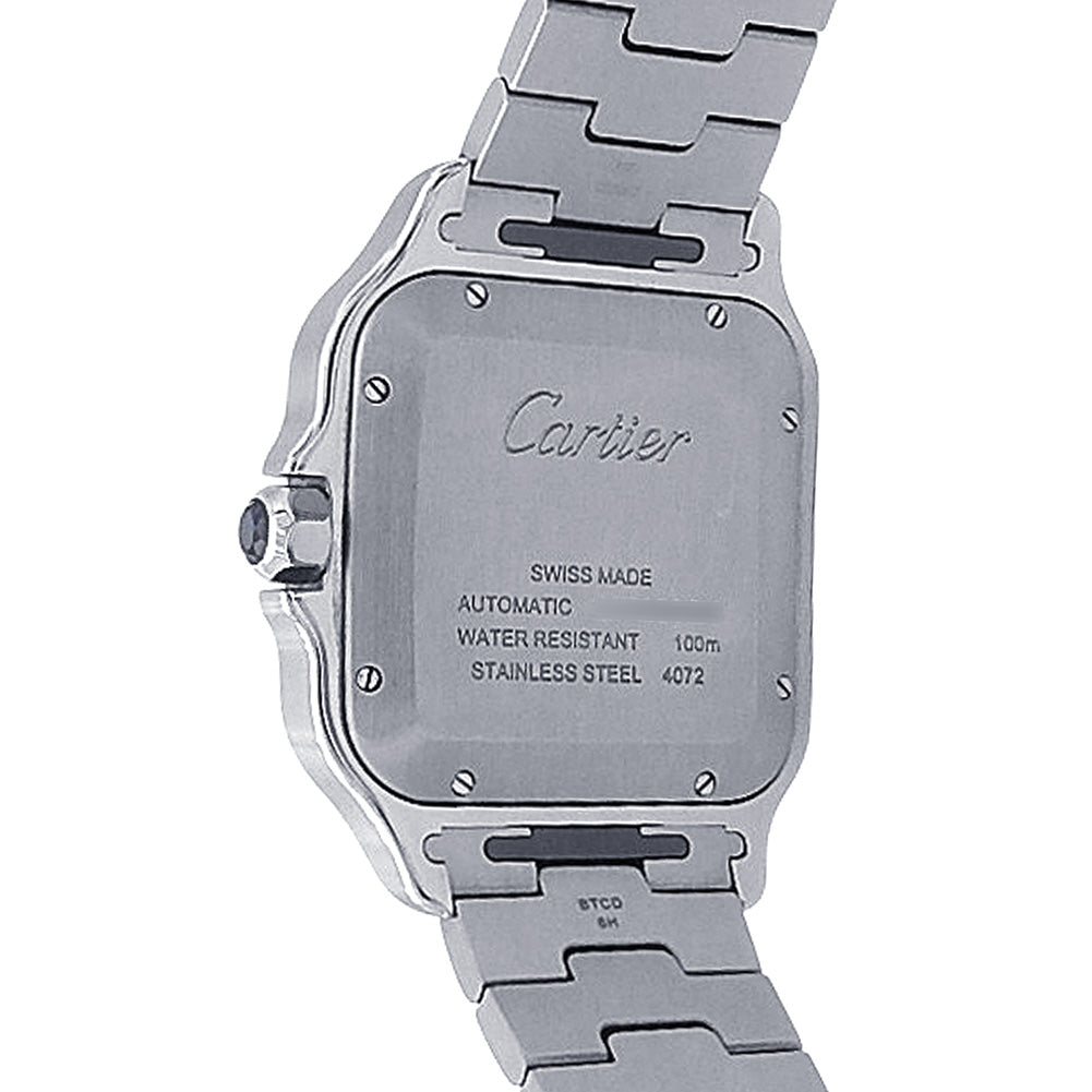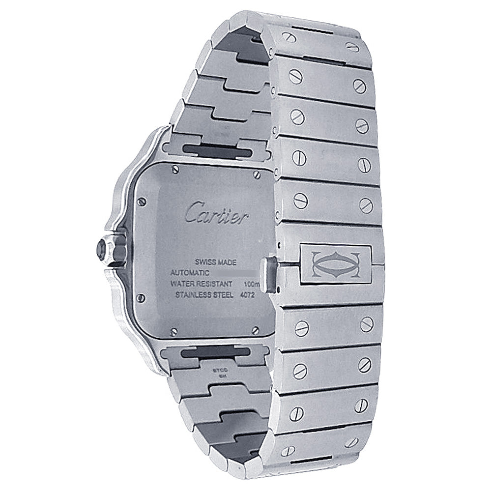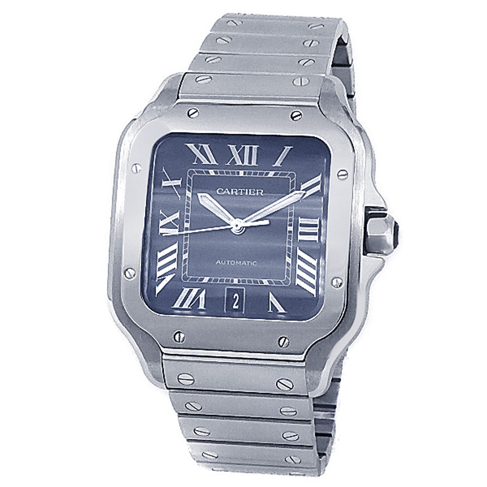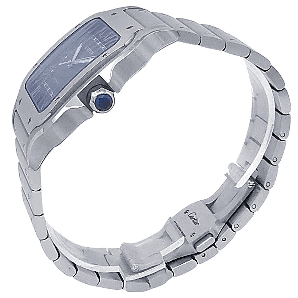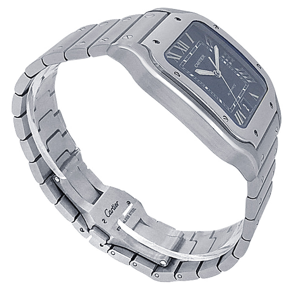 Pre-Owned Watch. Cartier Santos De Cartier men's watch with Stainless Steel case and bracelet. Watch has a blue dial with date feature. Watch runs on automatic movement. Watch can fit up to a size 7 1/2 inch wrist. Watch has signs of wear (hairline scratches). Watch does come with box and papers.