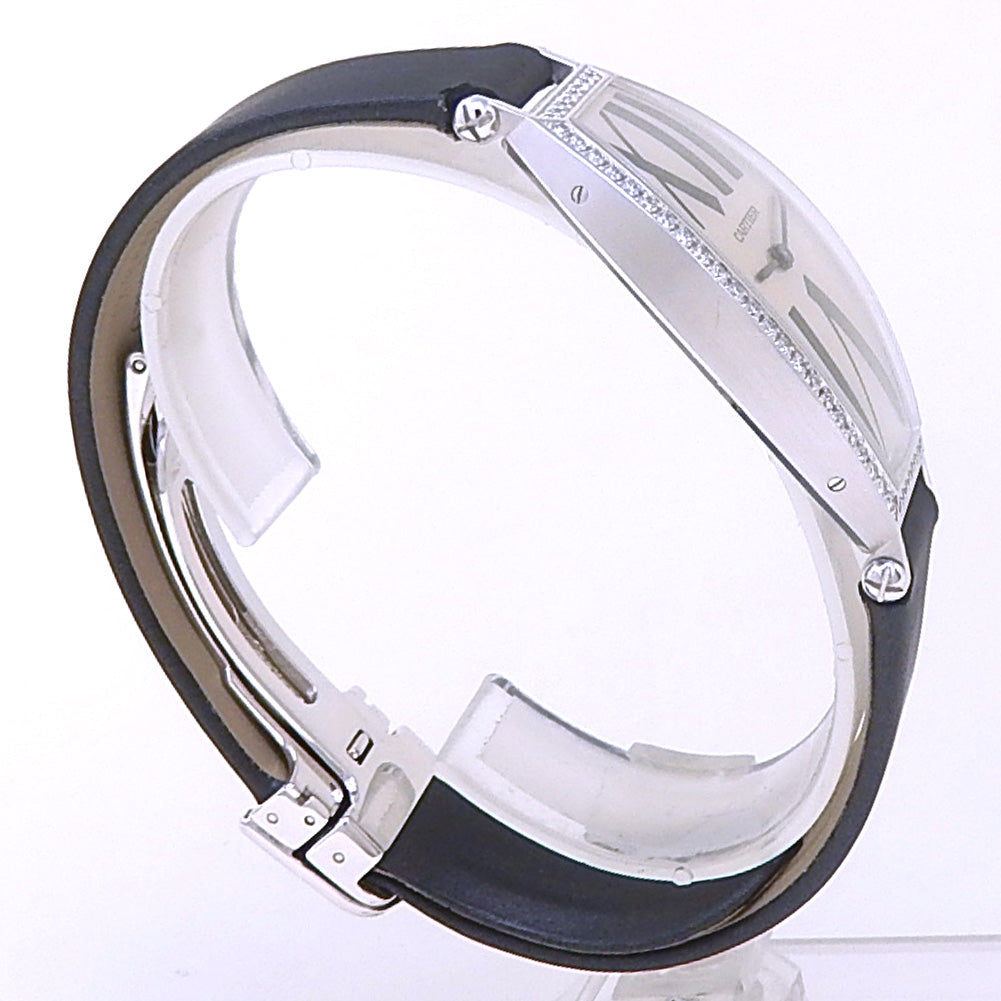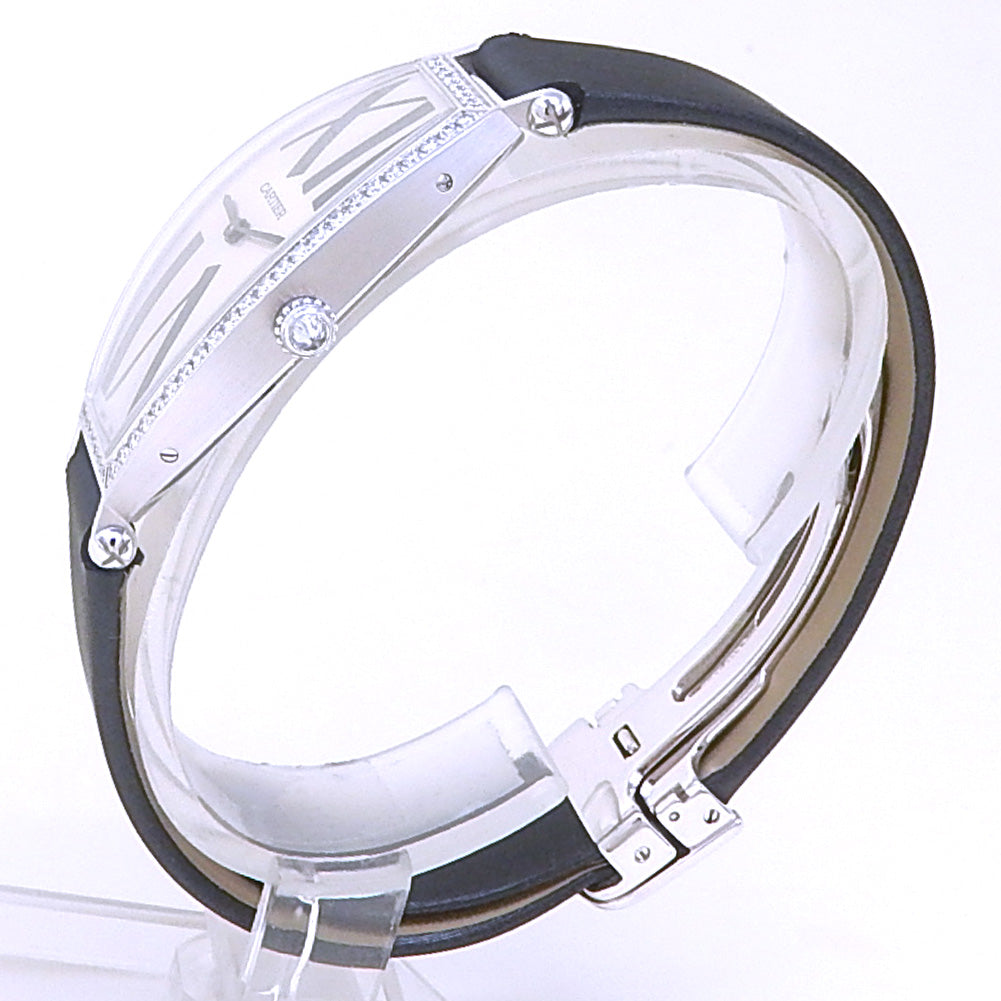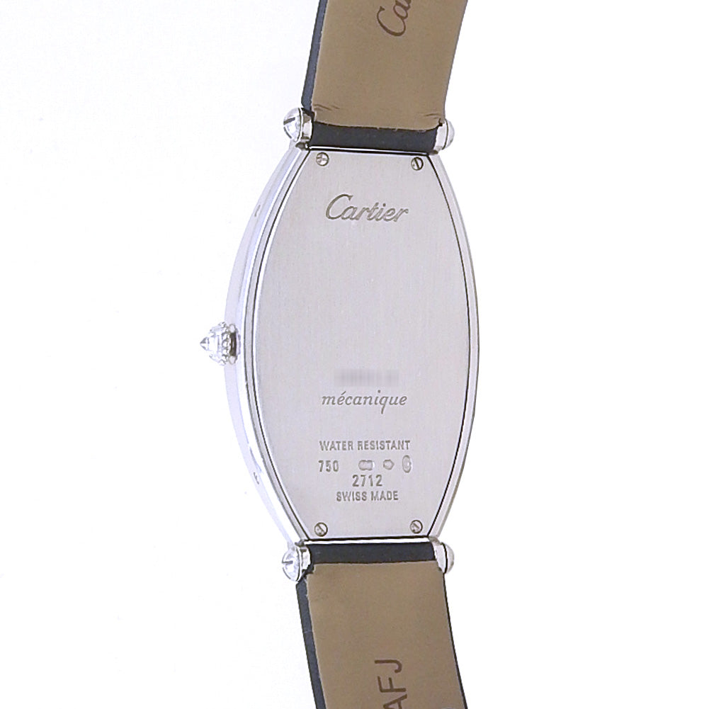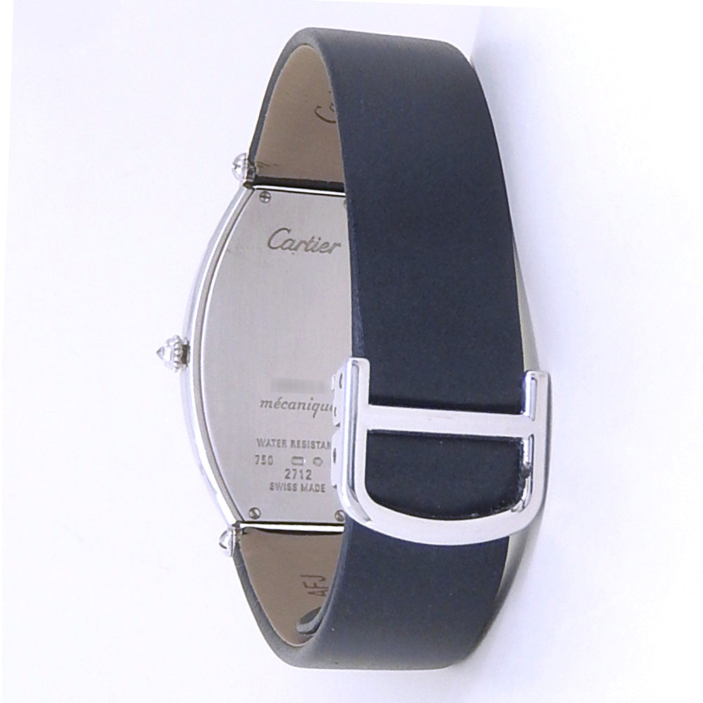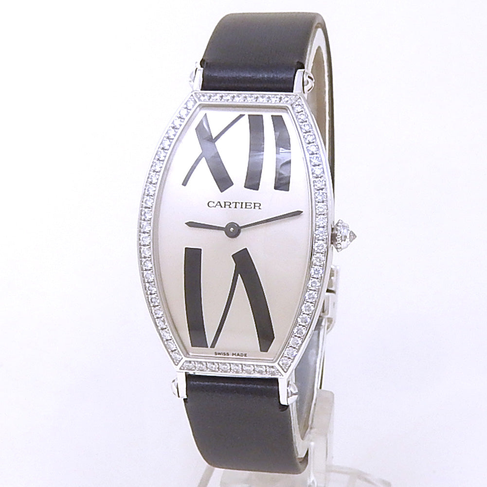 Pre-Owned Watch. Cartier Tonneau ladies watch with 18k White Gold case and Black Satin Leather strap. Watch has a silver dial with diamonds bezel. Watch runs on manual movement. Watch has signs of wear (hairline scratches).