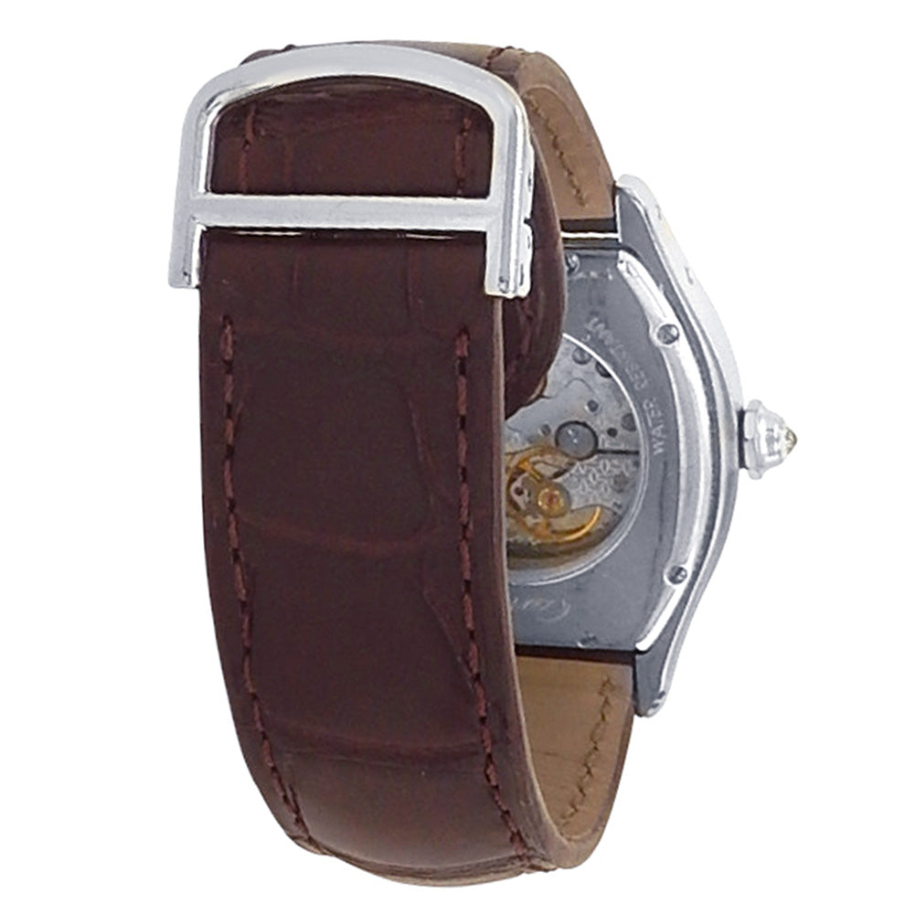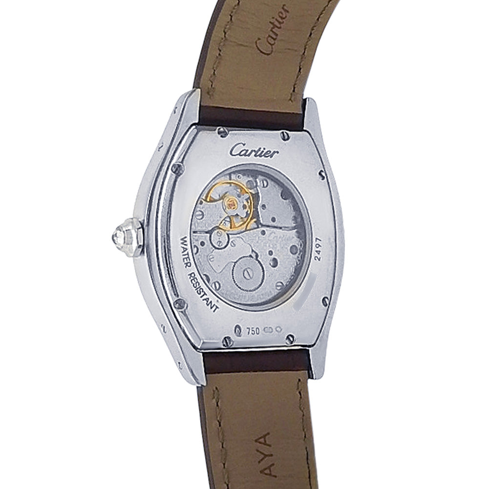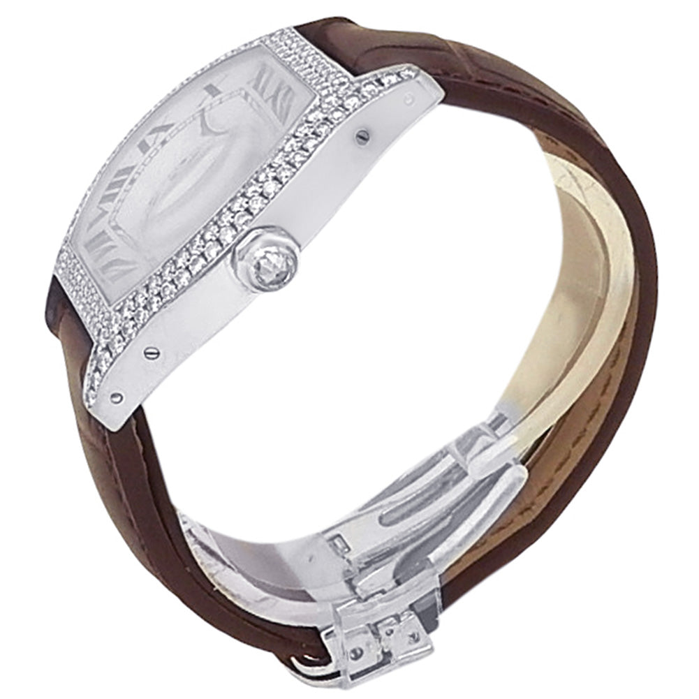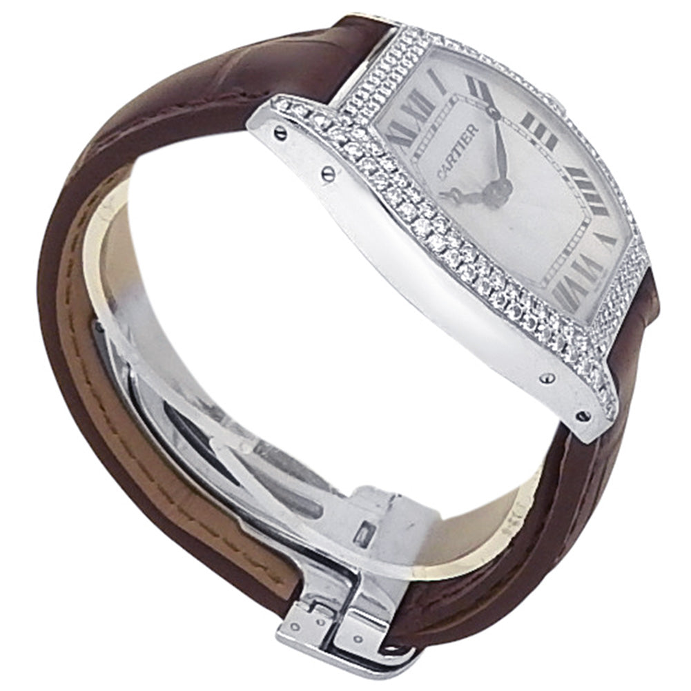 Pre-Owned Watch. Cartier Tortue ladies watch with 18k White Gold case and Brown Leather strap. Watch has a silver dial with diamonds bezel. Watch runs on manual movement. Watch has signs of wear (hairline scratches).