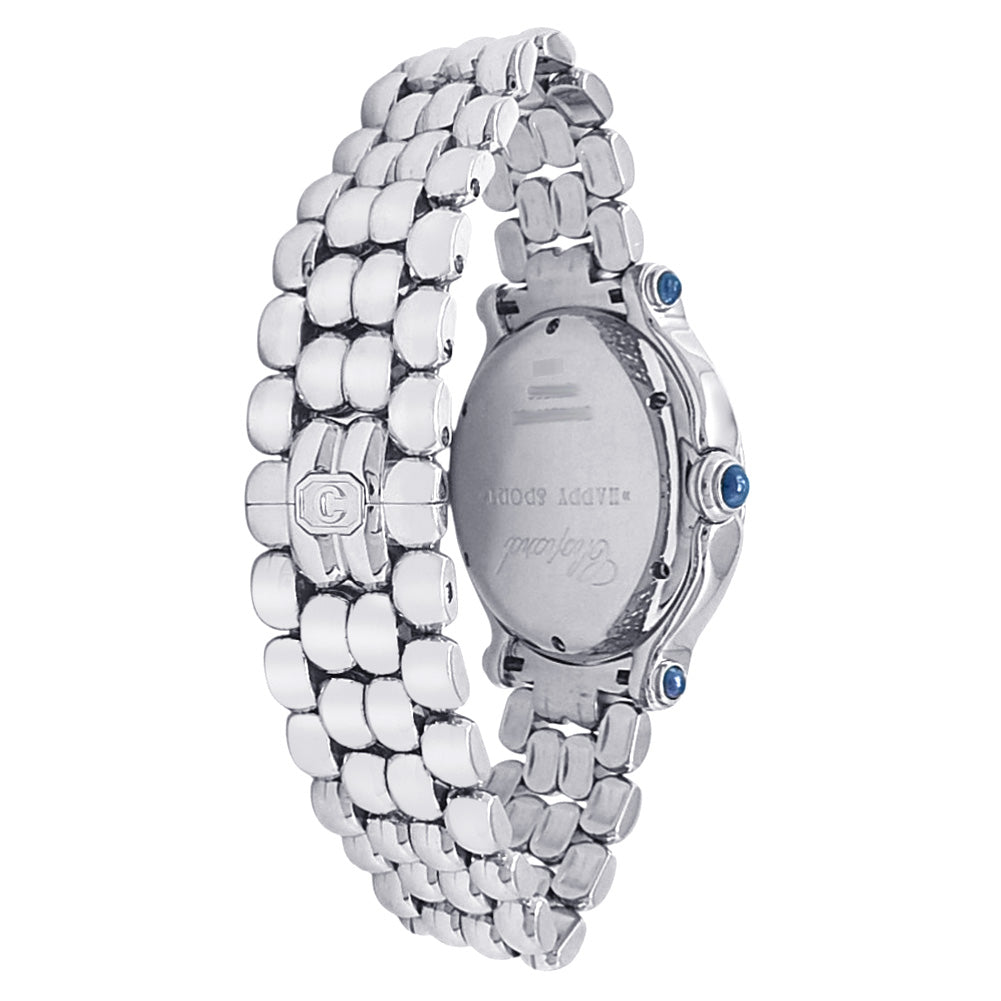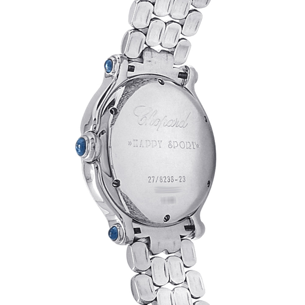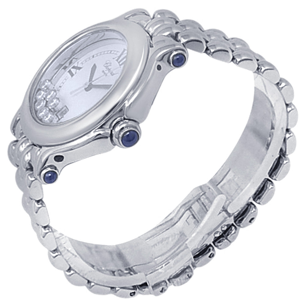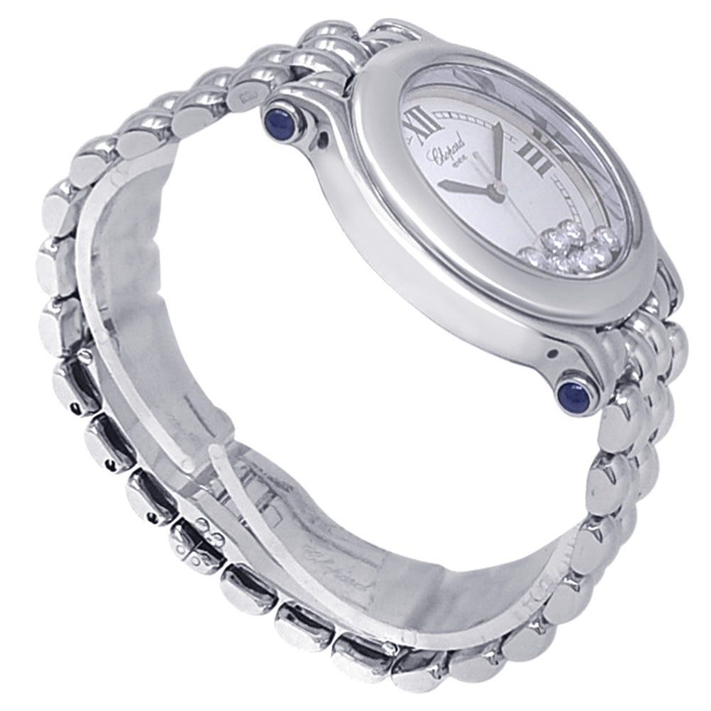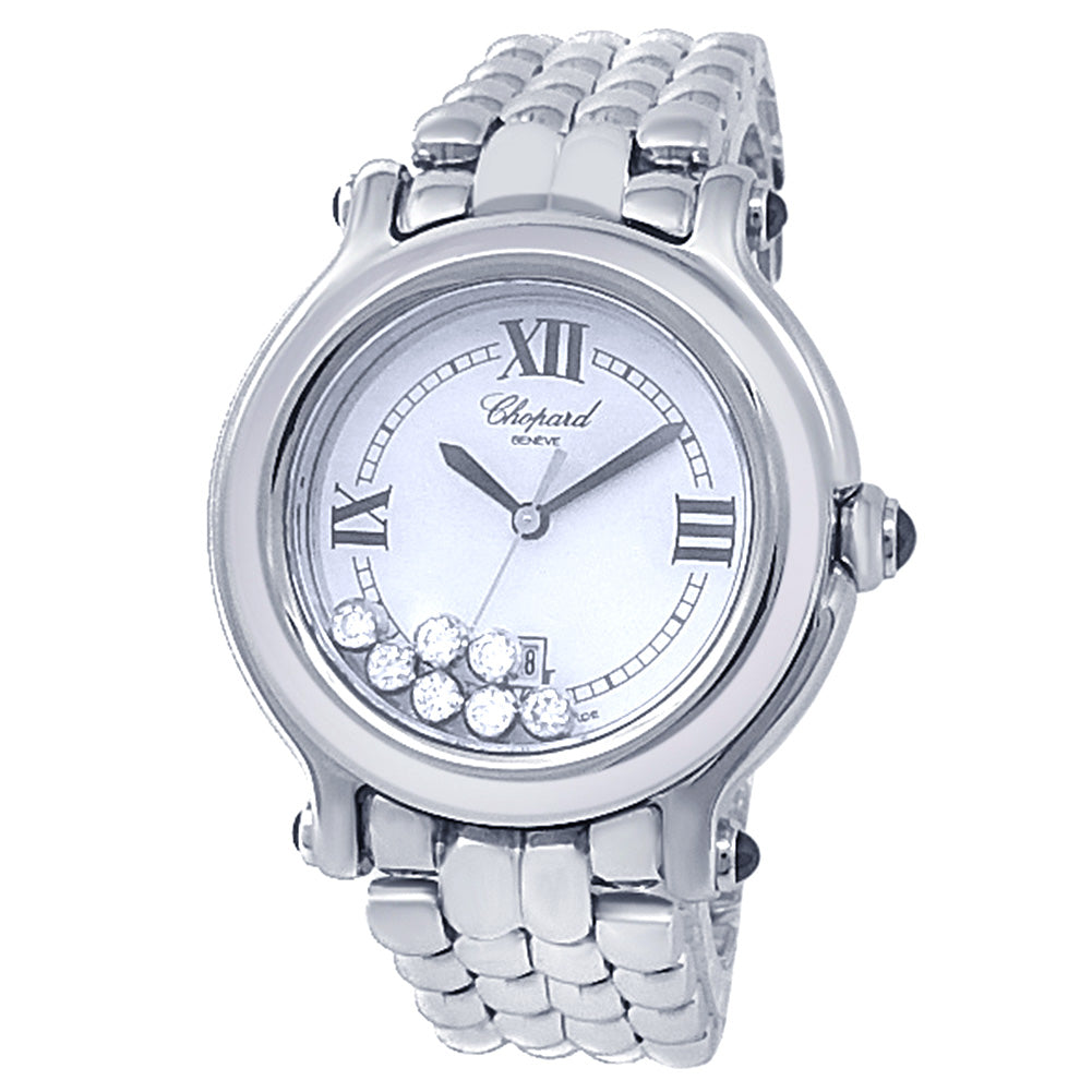 Pre-Owned Watch. Chopard Happy Sport ladies watch with Stainless Steel case and bracelet. Watch has a white dial with date feature and 7 floating diamonds. Watch runs on quartz movement. Watch can fit up to a size 6 inch wrist. Watch has signs of wear (hairline scratches).