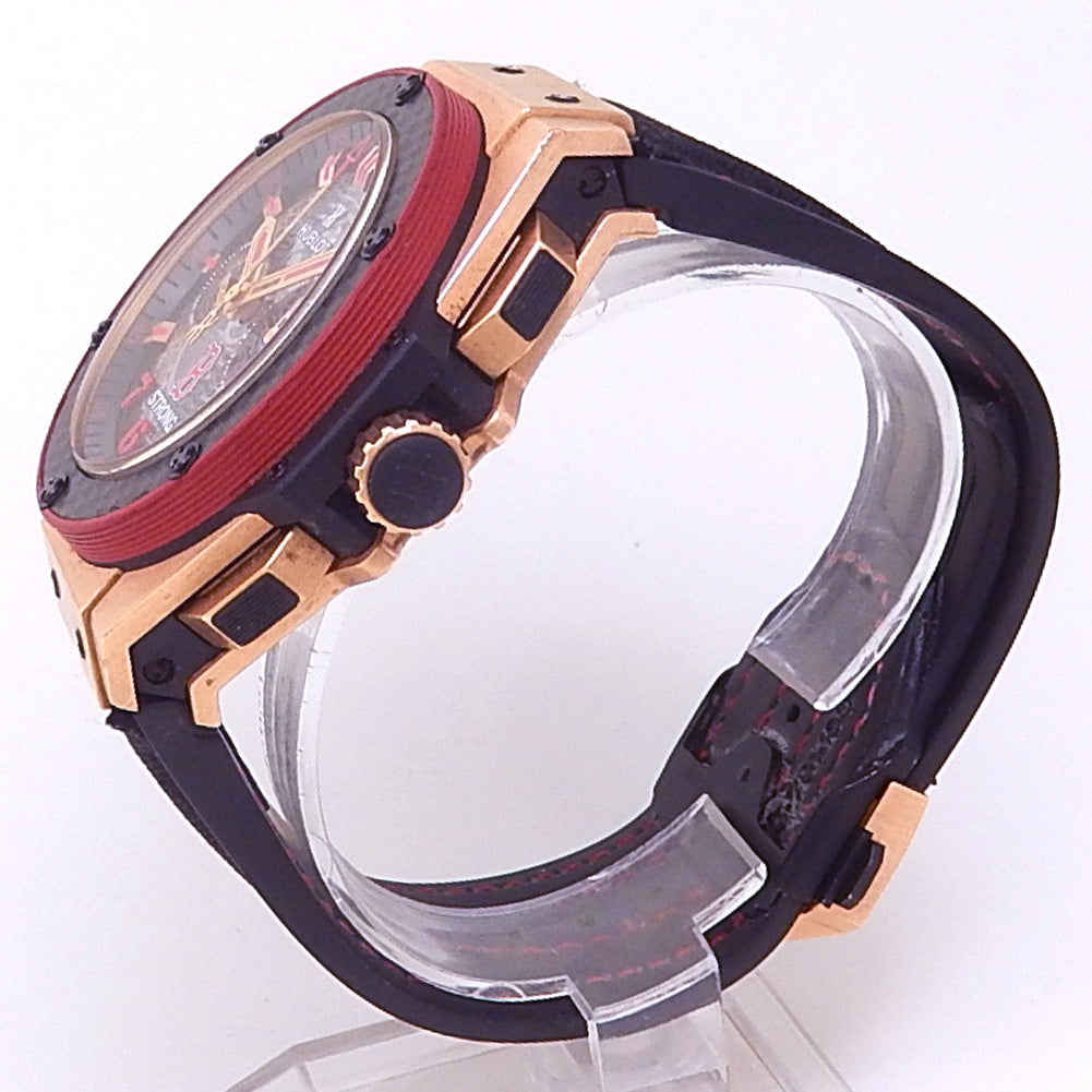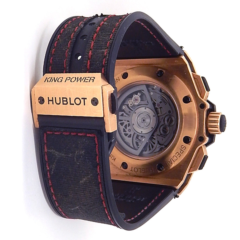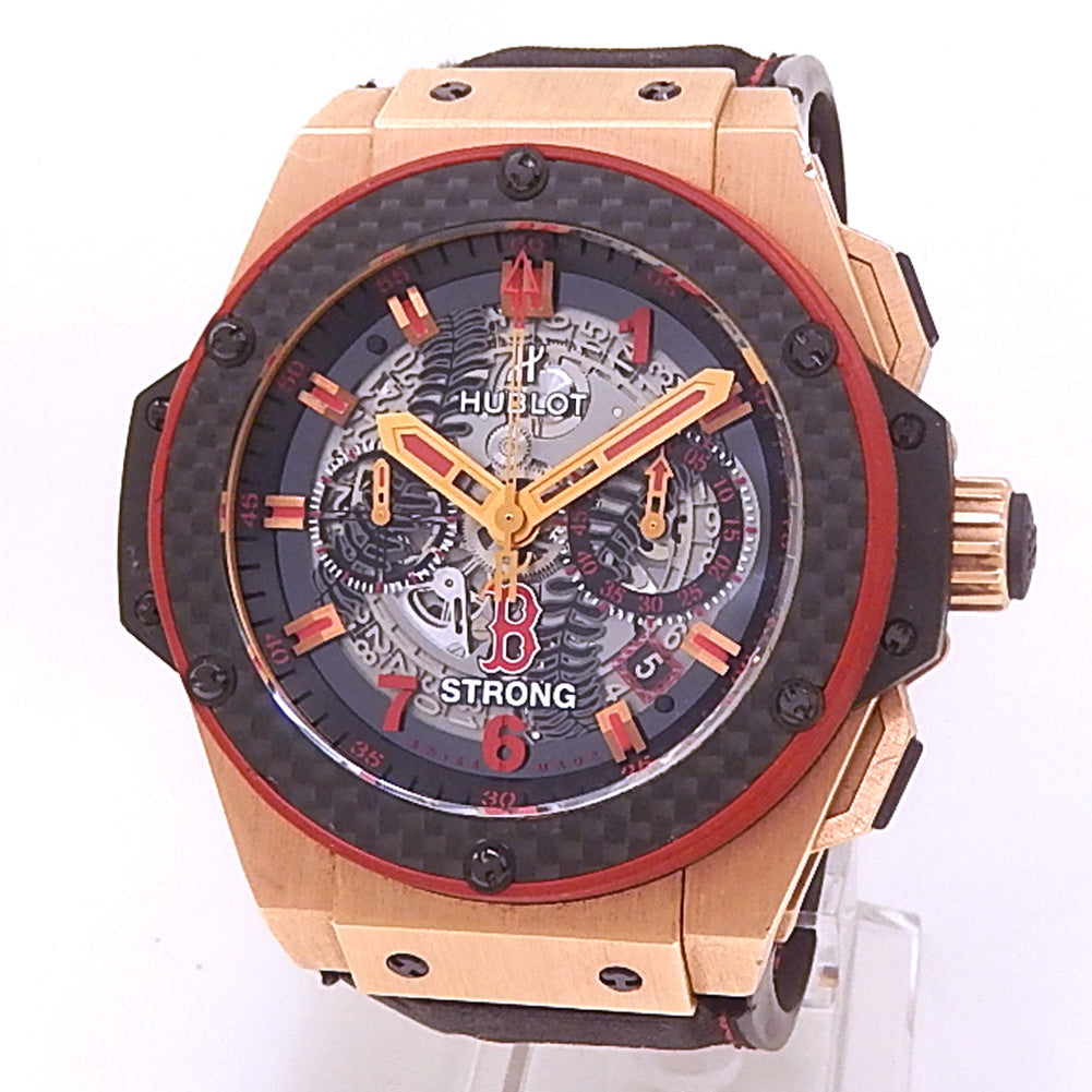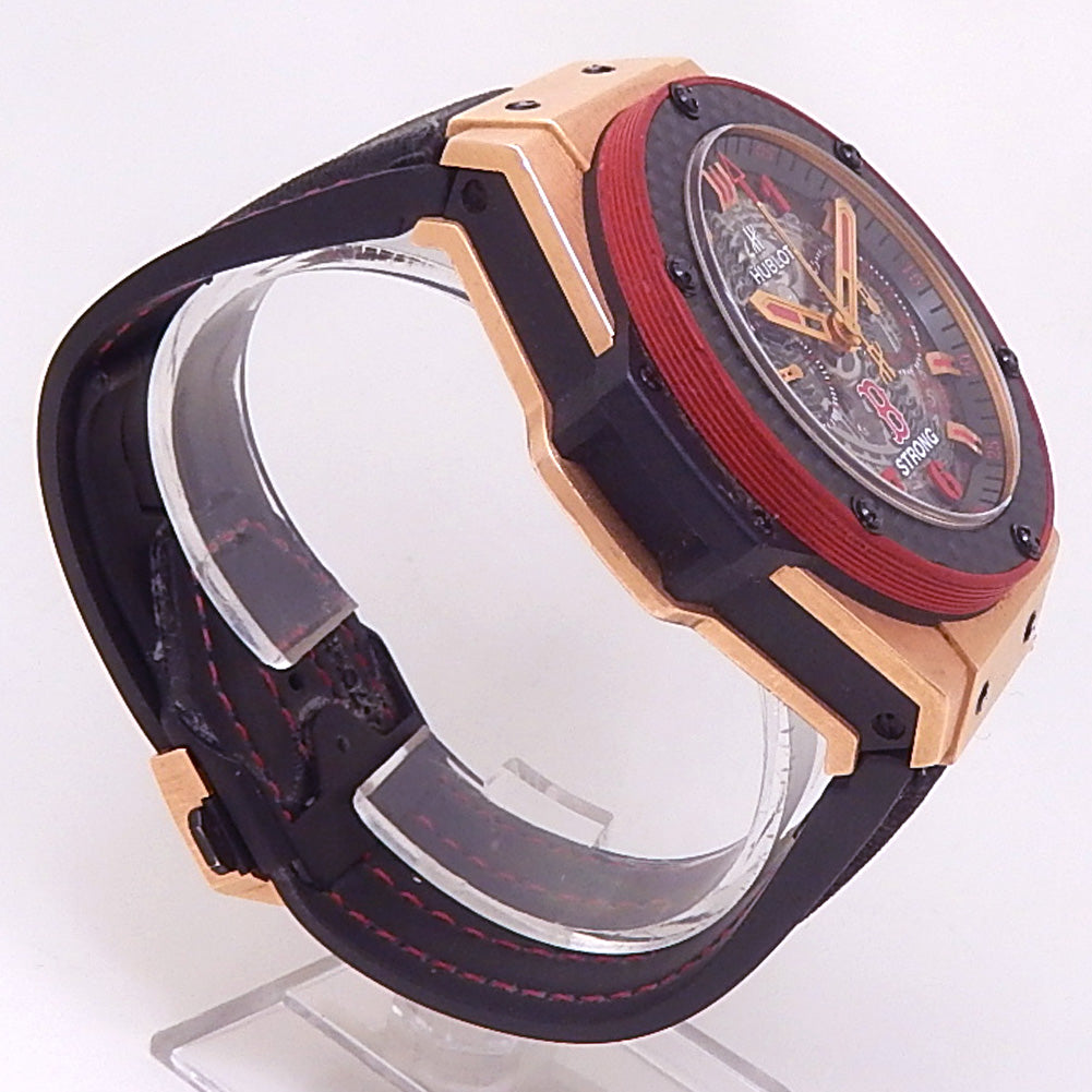 Pre-Owned Watch. Limited Edition Hublot King Power Boston Strong men’s watch limited to 5 pieces with 18k Rose Gold case and Black Rubber strap. Watch has a skeleton dial with date and chronograph features. Watch runs on automatic movement. Watch has signs of wear (hairline scratches).