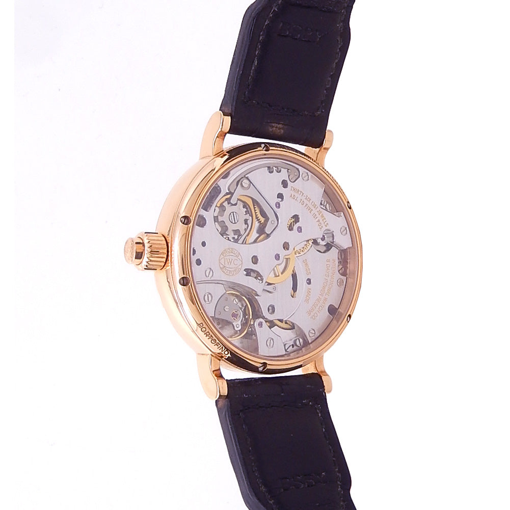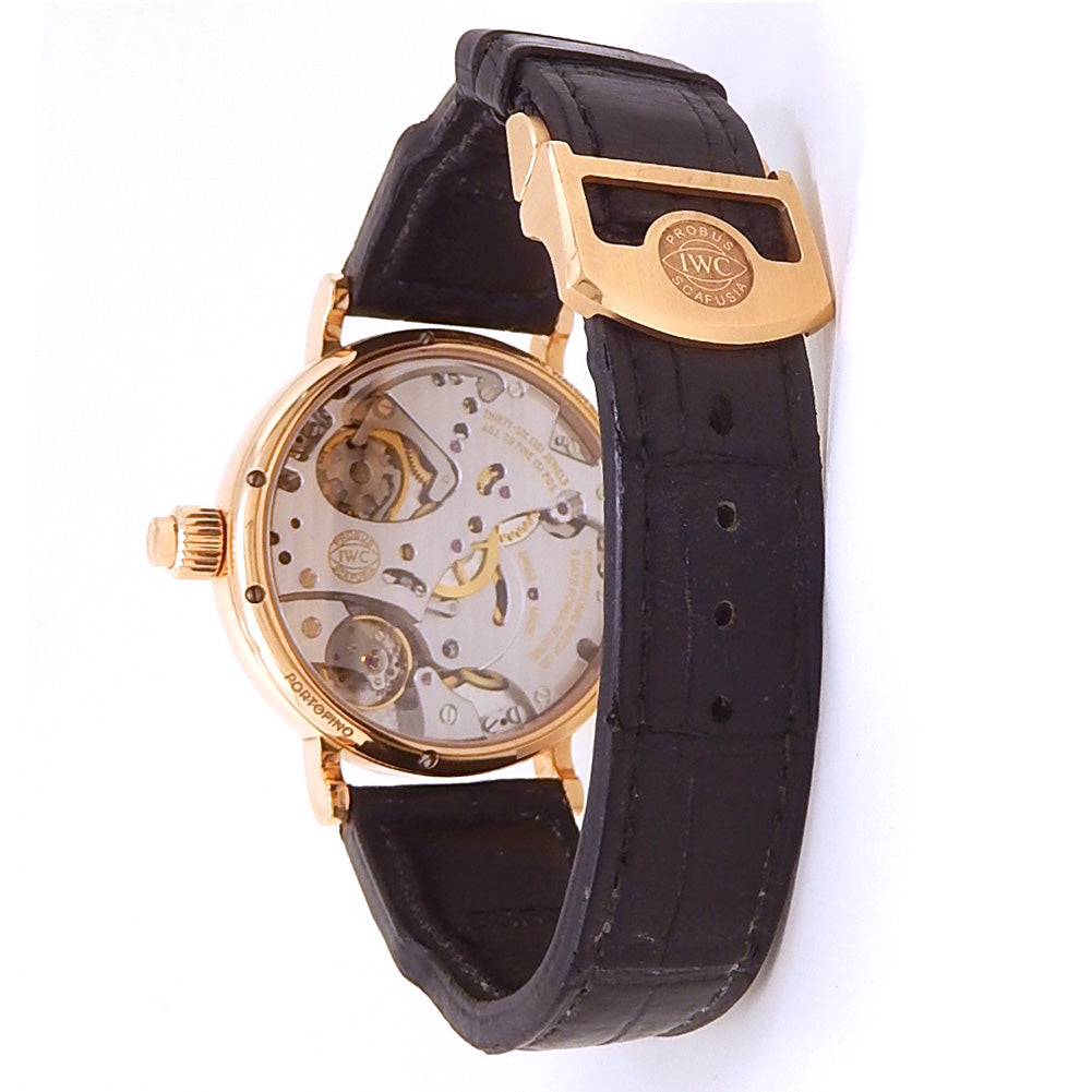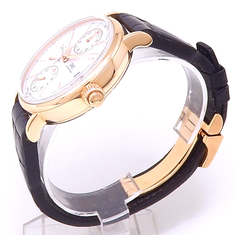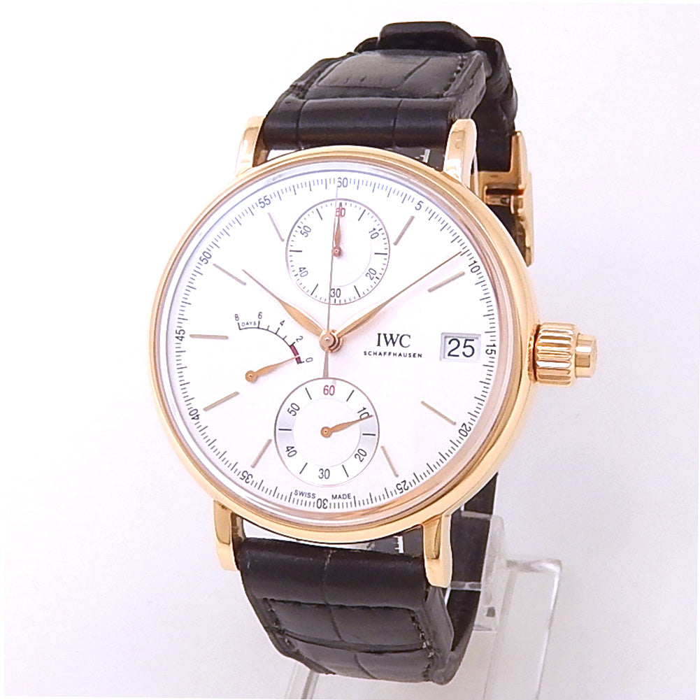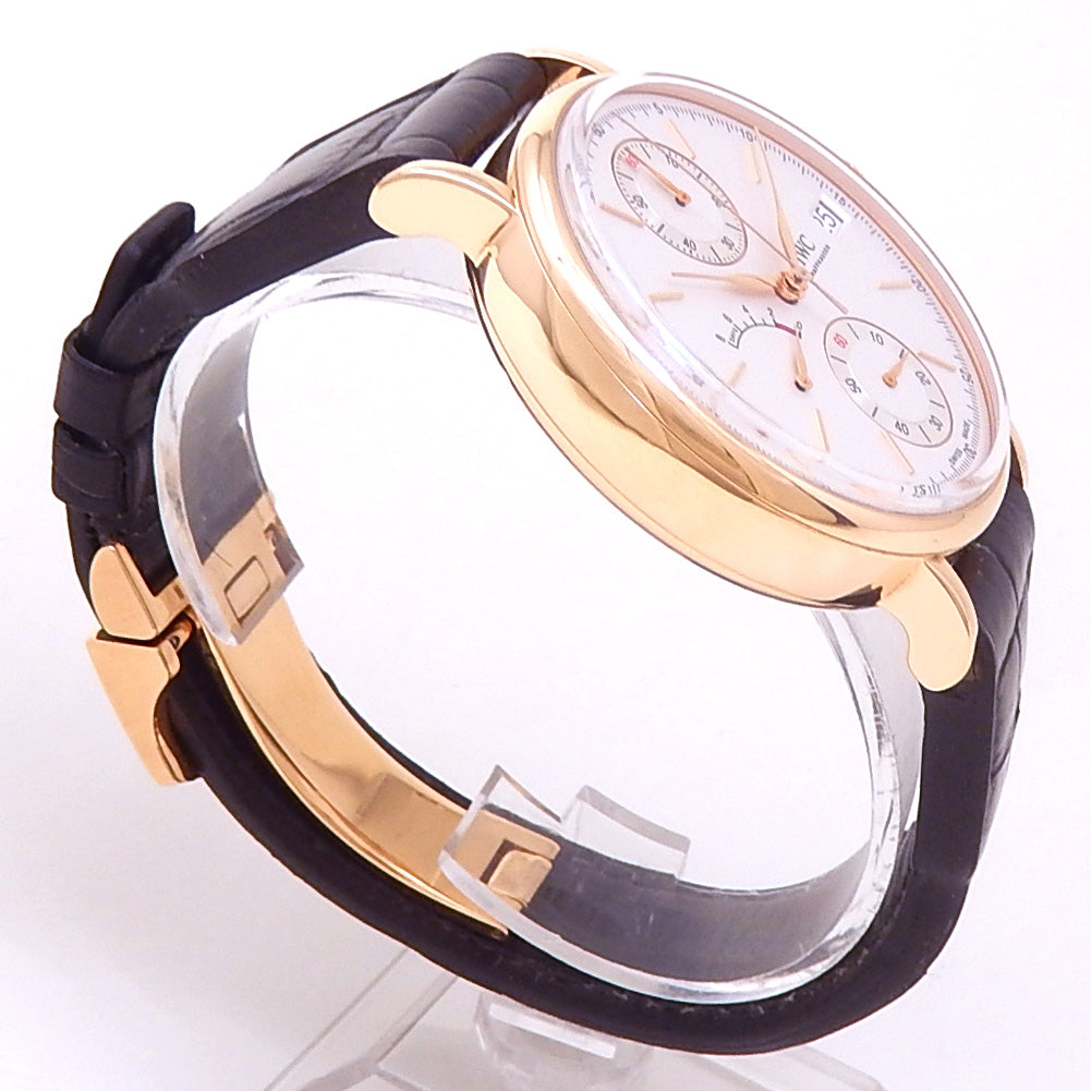 Pre-Owned Watch. IWC Portofino Monopusher men’s watch with 18k Rose Gold case and Black Leather strap. Watch has a silver dial with date, chronograph and power reserve features. Watch runs on manual movement. Watch has signs of wear (hairline scratches).