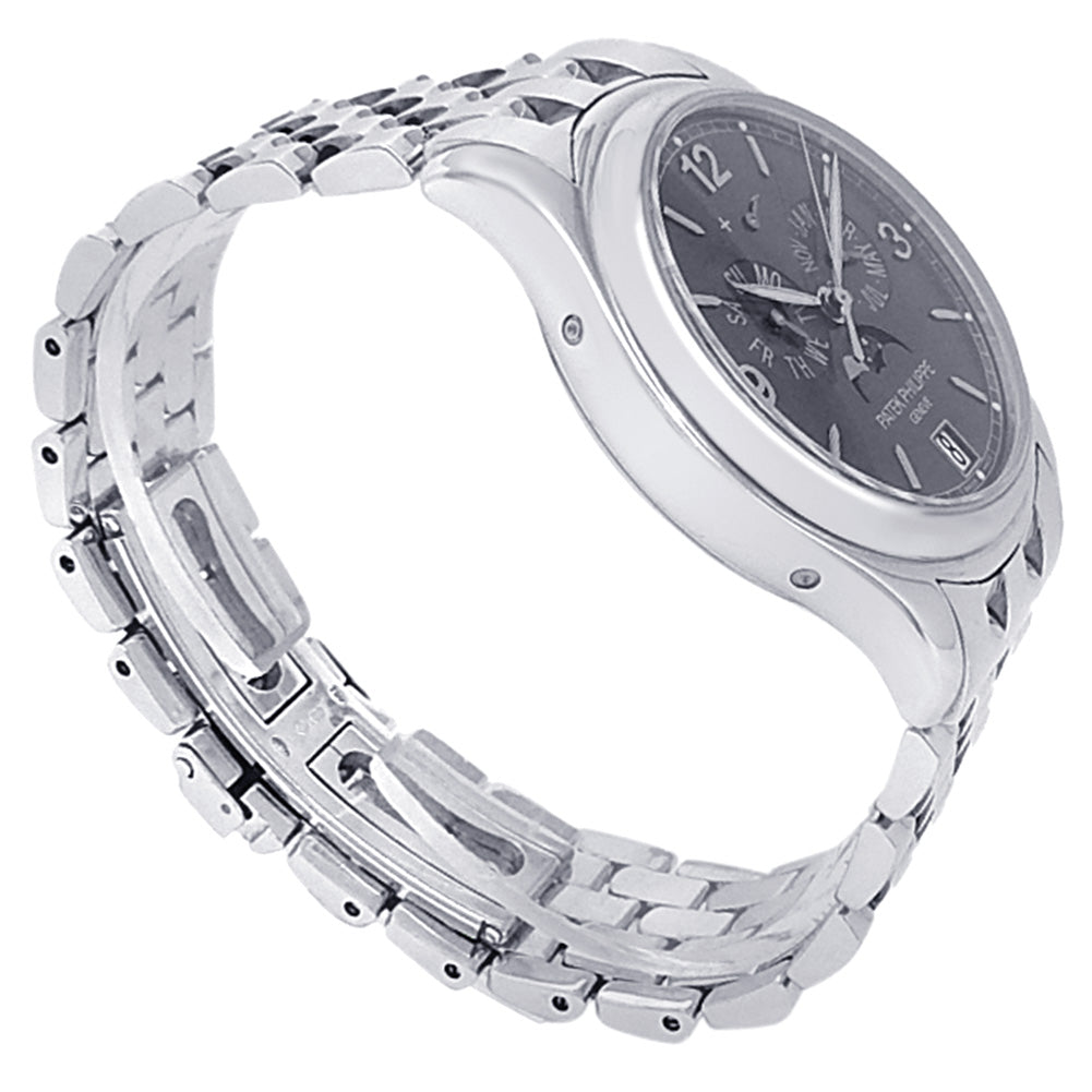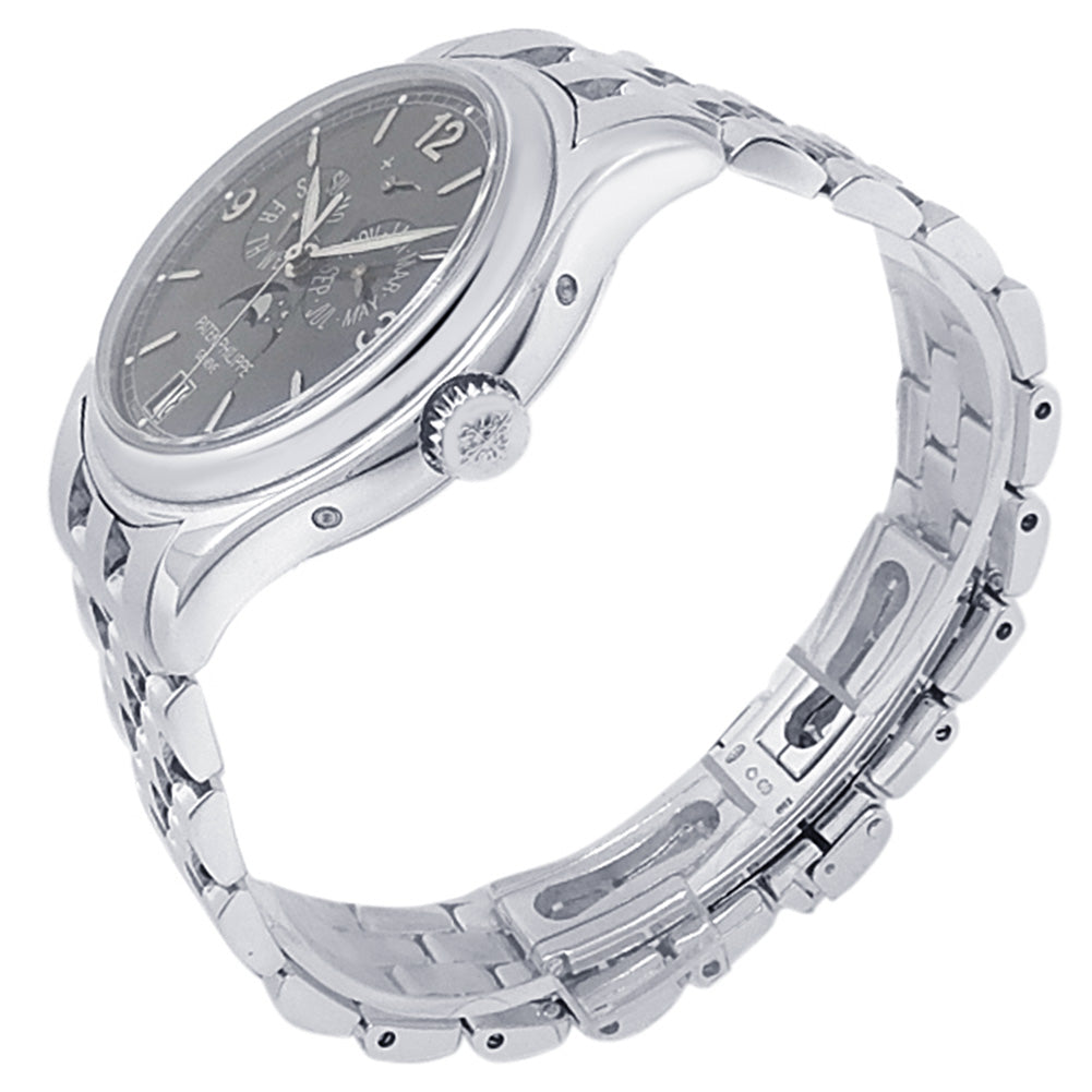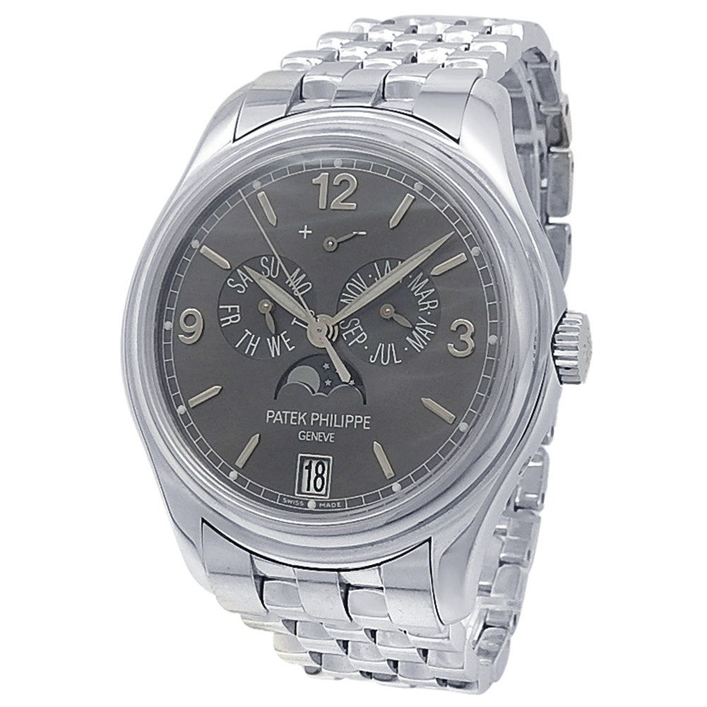 Pre-Owned Watch. Patek Philippe Annual Calendar men’s watch with 18k White Gold case and bracelet. Watch has a grey dial with date, day, month, annual calendar, moon phase and power reserve features. Watch runs on automatic movement. Watch can fit up to a size 7¼ inch wrist. Watch has signs of wear (hairline scratches). Watch does come with papers.